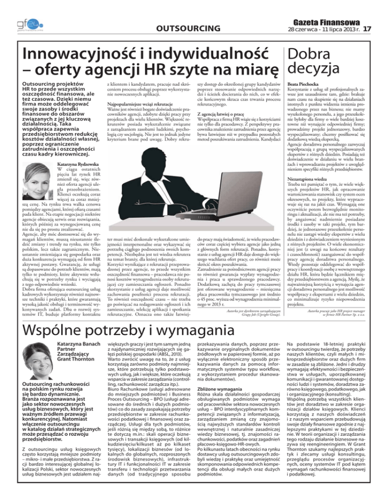 OUTSOURCING 28 czerwca - 11 lipca 2013 r. 17 Innowacyjność i indywidualność Dobra – oferty agencji HR szyte na miarę decyzja Outsourcing projektów HR to przede wszystkim oszczędność finansowa, ale też czasowa. Dzięki niemu firma może oddelegować swoje zasoby i środki finansowe do obszarów związanych z jej kluczową działalnością. Taka współpraca zapewnia przedsiębiorstwom redukcję kosztów działalności własnej, poprzez ograniczenie zatrudnienia i oszczędności czasu kadry kierowniczej. Katarzyna Rydzewska W ciągu ostatnich pięciu lat rynek HR zmienił się, więc również oferta agencji uległa przeobrażeniom. Klienci oczekują coraz więcej za coraz mniejszą cenę. Na rynku trwa walka cenowa pomiędzy agencjami, której ofiarą czasami pada klient. Na etapie negocjacji niektóre agencje obiecują serwis oraz rozwiązania, których później za wynegocjowaną cenę nie da się po prostu zrealizować. Agencje, aby móc dostosować się do wymagań klientów, muszą nieustannie śledzić zmiany i trendy na rynku, nie tylko polskim, lecz także zagranicznym. Nieustannie zmieniająca się gospodarka oraz duża konkurencja wymagają od firm HR aktywnej postawy. Gwarancję, że usługi są dopasowane do potrzeb klientów, mają tylko te podmioty, które aktywnie wsłuchują się w potrzeby rynku i wyciągają z tego odpowiednie wnioski. Dobra firma oferująca outsourcing usług kadrowych wykorzystuje również najnowsze techniki i praktyki, które gwarantują wysoką jakość obsługi i terminowość wykonywanych zadań. Dba o rozwój systemów IT, buduje platformy kontaktu z klientem i kandydatem, pracuje nad skróceniem procesu obsługi poprzez wykorzystanie nowoczesnych aplikacji. Najpopularniejsze wciąż rekrutacje Ważne jest również bogate doświadczenie pracowników agencji, zdobyte dzięki pracy przy projektach dla wielu klientów. Większość rekruterów posiada wykształcenie związane z zarządzaniem zasobami ludzkimi, psychologią czy socjologią. Nie jest to jednak jedyne kryterium brane pod uwagę. Dobry rekru- ter musi mieć doskonale wykształcone umiejętności interpersonalne oraz wykazywać się potrzebą ciągłego podnoszenia swoich kompetencji. Niezbędna jest też wiedza rekrutera na temat branży, dla której rekrutuje. Korzyści wynikające z rekrutacji przeprowadzonej przez agencje, to przede wszystkim oszczędność finansowa – pracodawca nie ponosi kosztów wynagrodzenia osoby rekrutującej czy zamieszczania ogłoszeń. Ponadto skorzystanie z usług agencji daje możliwość zachowania poufności procesu rekrutacji. To również oszczędność czasu – nie trzeba go poświęcać na redagowanie ogłoszeń i ich zamieszczanie, selekcję aplikacji i spotkania rekrutacyjne. Oznacza ono także łatwiej- szy dostęp do określonej grupy kandydatów poprzez stosowanie odpowiednich narzędzi i ścieżek docierania do nich, co w efekcie końcowym skraca czas trwania procesu rekrutacyjnego. Z agencją łatwiej o pracę Współpraca z firmą HR wiąże się z korzyściami nie tylko dla pracodawcy. Z perspektywy pracownika znalezienie zatrudnienia przez agencję bywa łatwiejsze niż w przypadku pozostałych metod poszukiwania zatrudnienia. Kandydaci Beata Piechocka Korzystanie z usług sił profesjonalnych zawsze jest uzasadnione tam, gdzie: brakuje nam czasu na skupienie się na działaniach istotnych z punktu widzenia istnienia prowadzonego przez nas biznesu; nie mamy wyszkolonego personelu, a jego przeszkolenie byłoby dla firmy o wiele bardziej kosztowne niż wynajęcie odpowiedniej firmy; prowadzimy projekt jednorazowy, bardzo wyspecjalizowany; chcemy posiłkować się dodatkową wiedzą ekspercką. Agencje doradztwa personalnego zazwyczaj współpracują z grupą wyspecjalizowanych ekspertów z różnych dziedzin. Posiadają też doświadczenie w działaniu w wielu branżach i wprowadzaniu projektów z uwzględnieniem specyfiki różnych przedsiębiorstw. do pracy mają świadomość, że wielu pracodawców coraz częściej wybiera agencje jako jedną z głównych form rekrutacji. Ponadto, korzystanie z usług agencji HR daje dostęp do większego wachlarza ofert pracy, co również może skrócić okres poszukiwania. Zatrudnienie za pośrednictwem agencji pracy to również gwarancja wypłaty wynagrodzenia i praca u sprawdzonego pracodawcy. Dodatkową zachętą do pracy tymczasowej jest oferowane wynagrodzenie – miesięczna płaca pracownika tymczasowego jest średnio o 45 proc. wyższa od wynagrodzenia minimalnego w 2013 r. Niezastąpiona wiedza Trzeba też pamiętać o tym, że wiele większych projektów HR, jak opracowanie wartościowania stanowisk czy system ocen okresowych, to projekty, które wypracowuje się raz na jakiś czas. Wymagają one oczywiście potem bezwzględnie monitoringu i aktualizacji, ale nie ma też potrzeby, by angażować nadmiernie posiadane środki i zasoby w taki projekt, tym bardziej, że jednorazowe przeszkolenie personelu nie zastąpi wiedzy ekspertów z wielu dziedzin i z doświadczeniem wyniesionym z różnych projektów. O wiele ekonomiczniej jest (z uwagi na końcowe rezultaty i czasochłonność) zaangażować do współpracy agencję doradztwa personalnego. Wtedy pozostaje oddelegować do współpracy i koordynacji osobę z wewnętrznego działu HR, która będzie łącznikiem między przedsiębiorstwem a agencją. Myślę, że najważniejszą korzyścią z wynajęcia agencji doradztwa personalnego jest możliwość współpracy z ekspertami z wielu dziedzin, co minimalizuje ryzyko niepowodzenia projektu. Autorka jest dyrektorem zarządzającym Grupy Job (Upright Group). Autorka pracuje jako HR project manager w firmie HR Partner Sp. z o.o. Wspólne potrzeby i wymagania Katarzyna Banach Partner Zarządzający Grant Thornton Outsourcing rachunkowości na polskim rynku rozwija się bardzo dynamicznie. Branża rozpoznawana jest jako sektor nowoczesnych usług biznesowych, który jest ważnym 