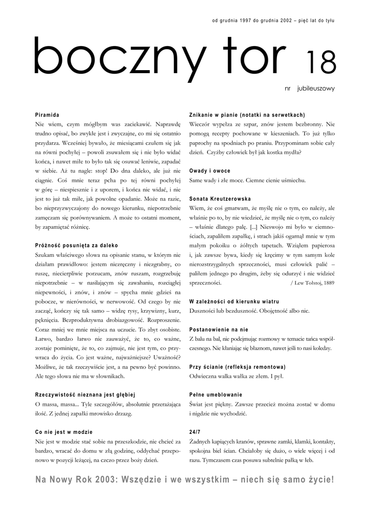 od grudnia 1997 do grudnia 2002 – pięć lat do tyłu boczny tor nr 18 jubileuszowy Piramida Znikanie w pianie (notatki na serwetkach) Nie wiem, czym mógłbym was zaciekawić. Naprawdę trudno opisać, bo zwykłe jest i zwyczajne, co mi się ostatnio przydarza. Wcześniej bywało, że miesiącami czułem się jak na równi pochyłej – powoli zsuwałem się i nie było widać końca, i nawet miłe to było tak się osuwać leniwie, zapadać w siebie. Aż tu nagle: stop! Do dna daleko, ale już nie ciągnie. Coś mnie teraz pcha po tej równi pochyłej w górę – niespiesznie i z uporem, i końca nie widać, i nie jest to już tak miłe, jak powolne opadanie. Może na razie, bo nieprzyzwyczajony do nowego kierunku, niepotrzebnie zamęczam się porównywaniem. A może to ostatni moment, by zapamiętać różnicę. Wieczór wypełza ze szpar, znów jestem bezbronny. Nie pomogą recepty pochowane w kieszeniach. To już tylko paprochy na spodniach po praniu. Przypominam sobie cały dzień. Czyżby człowiek był jak kostka mydła? Próżność posunięta za daleko Szukam właściwego słowa na opisanie stanu, w którym nie działam prawidłowo: jestem niezręczny i niezgrabny, co ruszę, niecierpliwie porzucam, znów ruszam, rozgrzebuję niepotrzebnie – w nasilającym się zawahaniu, rozciągłej niepewności, i znów, i znów – spycha mnie gdzieś na pobocze, w nierówności, w nerwowość. Od czego by nie zacząć, kończy się tak samo – widzę rysy, krzywizny, kurz, pęknięcia. Bezproduktywna drobiazgowość. Rozproszenie. Coraz mniej we mnie miejsca na uczucie. To zbyt osobiste. Łatwo, bardzo łatwo nie zauważyć, że to, co ważne, zostaje pominięte, że to, co zajmuje, nie jest tym, co przywraca do życia. Co jest ważne, najważniejsze? Uważność? Możliwe, że tak rzeczywiście jest, a na pewno być powinno. Ale tego słowa nie ma w słownikach. Owady i owoce Same wady i złe moce. Ciemne cienie uśmiechu. Sonata Kreutzerowska Wiem, że coś gmatwam, że myślę nie o tym, co należy, ale właśnie po to, by nie wiedzieć, że myślę nie o tym, co należy – właśnie dlatego palę. [...] Nieswojo mi było w ciemnościach, zapaliłem zapałkę, i strach jakiś ogarnął mnie w tym małym pokoiku o żółtych tapetach. Wziąłem papierosa i, jak zawsze bywa, kiedy się kręcimy w tym samym kole nierozstrzygalnych sprzeczności, musi człowiek palić – paliłem jednego po drugim, żeby się odurzyć i nie widzieć sprzeczności. / Lew Tołstoj, 1889 W zależności od kierunku wiatru Duszności lub bezduszność. Obojętność albo nic. Postanowienie na nie Z balu na bal, nie podejmując rozmowy w temacie tańca współczesnego. Nie kłaniając się błaznom, nawet jeśli to nasi koledzy. Przy ścianie (refleksja remontowa) Odwieczna walka wałka ze złem. I pył. Rzeczywistość nieznana jest głębiej Pełne umeblowanie O massa, massa... Tyle szczegółów, absolutnie przerażająca ilość. Z jednej zapałki mrowisko drzazg. Świat jest piękny. Zawsze przecież można zostać w domu i nigdzie nie wychodzić. Co nie jest w modzie 24/7 Nie jest w modzie stać sobie na przeszkodzie, nie chcieć za bardzo, wracać do domu w złą godzinę, oddychać przeponowo w pozycji leżącej, na czczo przez boży dzień. Żadnych kapiących kranów, sprawne zamki, klamki, kontakty, spokojna biel ścian. Chciałoby się dużo, o wiele więcej i od razu. Tymczasem czas posuwa subtelnie pałką w łeb. Na Nowy Rok 2003: Wszędzie i we wszystkim – niech się samo życie! Jean de Burý BŁYSKI I CIENIE Siedzimy we trzech w sobotni wieczór przy piwie, siedzimy osobno, przy jednym stole, ale przede wszystkim siedzimy naprzeciw. Gdy podchodzi do nas po puste szkło, jest przesądzone: – Czy masz dwie kartki? Bo my tu mamy twórczy wieczór. – Duże? – Mogą być małe. Mogą być małe, ale małe nie są. Teraz trzeba by się zastanowić, jaka jest możliwość, żeby ewentualnie dowieść, że ona jeszcze nie wie tego, co my wiemy. – Ja już ją rozebrałem. – Jakie ma piersi? – Nieco rozjechane, ale nieprzesadnie. – Eee, przesadzasz. Aczkolwiek zawsze mieliśmy inne typy. – W każdym razie: interesująca. – Kobiety, które mnie interesują stawiają mi pytania, dlaczego mnie interesują. – Łatwo odpowiedzieć: jest młoda i piękna. – Gdyby była młoda i piękna, to by mnie nie interesowała. – Gdyby? Co ty chcesz od dziewczyny? Wyślij jej esemesa. – Dajmy pokój. Jesteśmy po prostu starymi markizami. – Nie myślałem, że to mi się jeszcze zdarzy... – Bo zarzuca włosami i udaje, że nie patrzy? – Może coś się jednak urodzi. Jest obrazogeniczna. – Ładnie działa. Wszystko gdzieś tam się spotyka, całe spektrum świata. Wszystko maksymalnie spiętrzone, nawarstwione, a zarazem tak łatwo na to wpaść. – Obrazy nie powstają właśnie dlatego. – Tu istotny jest moment złamania. To jest to, co zabawne. – Muszę cię ochłodzić: dziś wieczór szanse są niewielkie. – Szalenie... – I tak przyjdzie po puste szkło. – Szkło. Szkło. Nie chodzi przecież o spełnienie. Chodzi o te błyski. Które przecież niczego nie zapowiadają. Będzie mi się śniła, to jest najgorsze. – Ja w takie czeluście wchodzę z małej stopy. – A ja jestem w prochu absolutnym. Poza tym nic się nie dzieje. / 18-19.10.2002 Korona, Poznań Myśl na jutro Myśl na jutro: nie zakochiwać się tak łatwo. Myśl na pojutrze: nie zakochiwać się w ogóle. / grecki Marzenia erotyczne trzydziestolatków Rozkosz pełnego uzębienia. marks NIEPOROZUMIENIE „Kontrapunkt” Aldousa Huxleya rozpoczynają refleksje Waltera, który usiłuje wyjaśnić sobie przyczyny nieszczęsnego afektu do Marjorie, uczucia, o którym jeszcze niedawno sądził, że jest miłością. Gdzie popełniłem błąd, myśli uporczywie nasz bohater, bez walki dając się porwać wzbierającemu potokowi wspomnień. Znajduje wreszcie odpowiedź: powodem tej brzemiennej (dosłownie