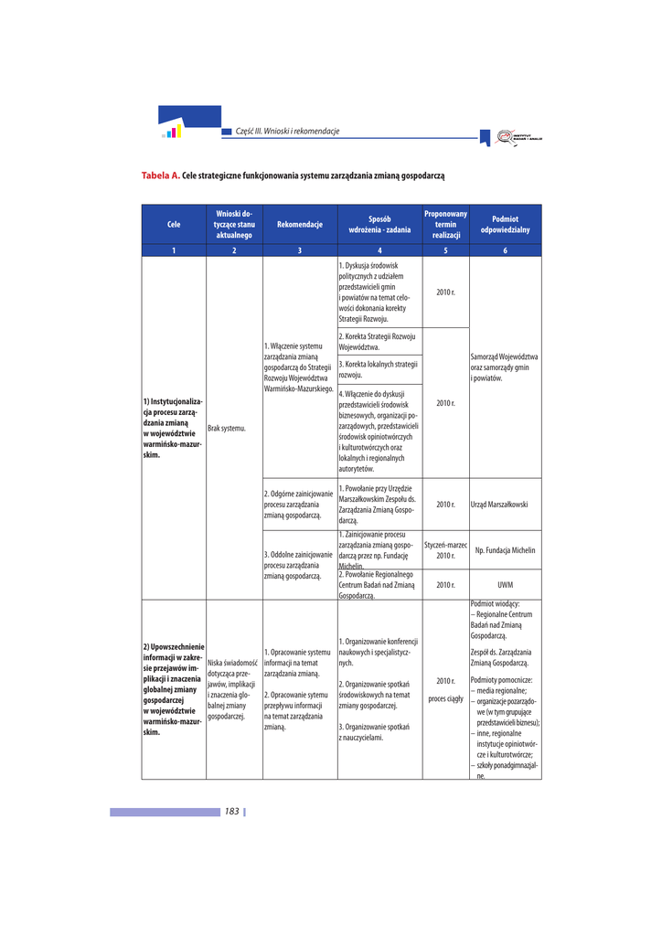 Część III. Wnioski i rekomendacje Tabela A. Cele strategiczne funkcjonowania systemu zarządzania zmianą gospodarczą Cele Wnioski dotyczące stanu aktualnego Rekomendacje 1 2 3 Sposób wdrożenia - zadania Proponowany termin realizacji Podmiot odpowiedzialny 4 5 6 1. Dyskusja środowisk politycznych z udziałem przedstawicieli gmin i powiatów na temat celowości dokonania korekty Strategii Rozwoju. 1) Instytucjonalizacja procesu zarządzania zmianą Brak systemu. w województwie warmińsko-mazurskim. 2. Korekta Strategii Rozwoju 1. Włączenie systemu Województwa. zarządzania zmianą gospodarczą do Strategii 3. Korekta lokalnych strategii Rozwoju Województwa rozwoju. Warmińsko-Mazurskiego. 4. Włączenie do dyskusji przedstawicieli środowisk biznesowych, organizacji pozarządowych, przedstawicieli środowisk opiniotwórczych i kulturotwórczych oraz lokalnych i regionalnych autorytetów. 2010 r. 1. Powołanie przy Urzędzie 2. Odgórne zainicjowanie Marszałkowskim Zespołu ds. procesu zarządzania Zarządzania Zmianą Gospozmianą gospodarczą. darczą. 2010 r. 1. Zainicjowanie procesu zarządzania zmianą gospo3. Oddolne zainicjowanie darczą przez np. Fundację procesu zarządzania Michelin. 2. Powołanie Regionalnego zmianą gospodarczą. Centrum Badań nad Zmianą Gospodarczą. 2) Upowszechnienie informacji w zakresie przejawów implikacji i znaczenia globalnej zmiany gospodarczej w województwie warmińsko-mazurskim. 1. Organizowanie konferencji 1. Opracowanie systemu naukowych i specjalistyczNiska świadomość informacji na temat nych. dotycząca przezarządzania zmianą. jawów, implikacji 2. Organizowanie spotkań i znaczenia glo2. Opracowanie sytemu środowiskowych na temat balnej zmiany przepływu informacji zmiany gospodarczej. gospodarczej. na temat zarządzania zmianą. 3. Organizowanie spotkań z nauczycielami. 183 2010 r. Samorząd Województwa oraz samorządy gmin i powiatów. Urząd Marszałkowski Styczeń-marzec Np. Fundacja Michelin 2010 r. 2010 r. UWM Podmiot wiodący: – Regionalne Centrum Badań nad Zmianą Gospodarczą. Zespół ds. Zarządzania Zmianą Gospodarczą. Podmioty pomocnicze: – media regionalne; proces ciągły – organizacje pozarządowe (w tym grupujące przedstawicieli biznesu); – inne, regionalne instytucje opiniotwórcze i kulturotwórcze; – szkoły ponadgimnazjalne. 2010 r. Rola małych i średnich przedsiębiorstw w gospodarce woj. warm.-maz. 1 j.w. 2 j.w. 3 3. Zorganizowanie bazy danych (elektronicznej i papierowej). 4 5 1. Wprowadzenie problematyki zmiany do pragmatyki urzędowej. 2010 r. 6 j.w. 1. Organizowanie konkursów wśród uczniów, studentów na temat zmiany. 2. Inspirowanie pracowników naukowych do badania zmiany gospodarczej w regionie. 4. Opracowanie wersji naukowej posiadanych informacji. j.w. j.w. 5. Opracowanie wersji popularnej na temat zarządzania zmianą. 3. Wyprodukowanie i dystrybucja filmu dokumentalnego o roboczym tytule – Warmia i Mazury wobec globalnej zmiany gospodarczej. 2010/2011 j.w. proces ciągły 4. Organizowanie cyklicznych audycji w mediach regionalnych na temat zmiany. 5. Popularyzowanie dobrych praktyk i przykładów skutecznego zarządzania zmianą na świecie. 6. Wspieranie wszelkich procesów innowacyjnych w regionie. 1. Rozpoczęcie aktywności 2010 r. 1. Akumulacja wiedzy na Regionalnego Centrum Badań temat zmiany. proces ciągły nad Zmianą Gospodarczą. Brak systemu 3) Konceptualizacja konceptualizacji procesu zarządza– rozproszenie nia zmianą gospowiedzy i informacji darczą. na temat zmiany gospodarczej. j.w. j.w. 2. Opracowanie metod obserwacji zjawisk i procesów we wszystkich warstwach otoczenia województwa warmińsko-mazurskiego. 1. Powołanie przez Regionalne Centrum Badań interdyscyplinarnego zespołu naukowego. 2010/2011 2. Opracowanie programu baproces ciągły dań naukowych dotyczących społecznych, gospodarczych i kulturowych implikacji zmiany. 1. Organizowanie cyklicznych paneli naukowo-dyskusyjnych z udziałem środowisk bizne3. Analiza i refleksja na te- sowych, społecznych 2010/2011 mat wpływu globalizacji i politycznych. na zmianę gospodarczą proces ciągły 2.Opracowanie włączenia w województwie. wiedzy na temat zmiany do programów nauczania akademickiego. 184 Regionalne Centrum Badań nad Zmianą Gospodarczą przy współpracy np. Fundacji Michelin oraz Samorządu Województwa. Część III. Wnioski i rekomendacje 1 2 3 1. Harmonizacja aktywności różnorodnych środowisk kulturowych i opiniotwórczych województwa. 4) Motywowanie różnorodnych środowisk wojeNie funkcjonuje wództwa z uwagi na brak w zakresie aktywsystemu. nego włączenia się do systemu zarządzania zmianą. 4 1. Zorganizowanie płaszczyzny współpracy i wymiany myśli różnorodnych podmiotów województwa (vide płaszczyzna wymiany informacji). 5 6 2010/2011 proces ciągły 2. Wymiana doświadczeń międzynarodowych w zakresie wspierania sektora przedsiębiorczości. Samorząd Województwa (Zespół ds. Zmiany Gospodarczej) we współpracy z: – uczelniami regionu 1. Zainicjowanie stałego (zwłaszcza UWM – dialogu ze społeczeństwem Regionalne Centrum na temat wyzwań związanych Badań nad Zmianą ze zmianą poprzez media, Gospodarczą); spotkania, konferencje, – Fundacja Michelin fora itp. 2. Prowadzenie dialogu ze i in.; społeczeństwem. – środowiska biznesu; 2. Włączenie do systemu 3. Wypracowanie konsen- przedstawicieli różnych Inicjacja – – organizacje pozarządowe; ugrupowań politycznych: susu politycznego. 2010 r. – instytucje opinio– opracowanie ram wspól4. Promocja i kształtowatwórcze i kulturonych interesów polityczproces ciągły nie wizerunku województwórcze. nych w zakresie zmiany; twa pod kątem reakcji na – wymiana informacji na zmianę gospodarczą. temat problemów społeczno-gospodarczych ze związkami zawodowymi; – przygotowanie cyklu szkoleń dla polityków z województwa. 1. Identyfikacja instrumentów o charakt