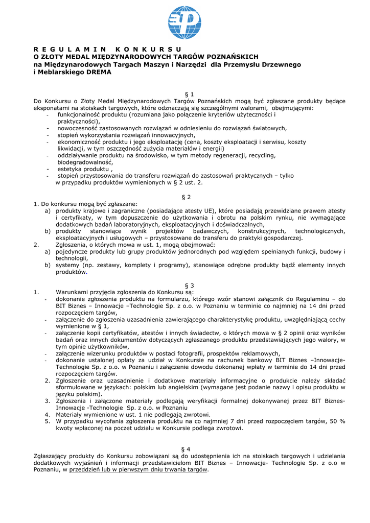 R E G U L A M I N K O N K U R S U O ZŁOTY MEDAL MIĘDZYNARODOWYCH TARGÓW POZNAŃSKICH na Międzynarodowych Targach Maszyn i Narzędzi dla Przemysłu Drzewnego i Meblarskiego DREMA §1 Do Konkursu o Złoty Medal Międzynarodowych Targów Poznańskich mogą być zgłaszane produkty będące eksponatami na stoiskach targowych, które odznaczają się szczególnymi walorami, obejmującymi: funkcjonalność produktu (rozumiana jako połączenie kryteriów uŜyteczności i praktyczności), - nowoczesność zastosowanych rozwiązań w odniesieniu do rozwiązań światowych, - stopień wykorzystania rozwiązań innowacyjnych, ekonomiczność produktu i jego eksploatację (cena, koszty eksploatacji i serwisu, koszty likwidacji, w tym oszczędność zuŜycia materiałów i energii) oddziaływanie produktu na środowisko, w tym metody regeneracji, recycling, biodegradowalność, - estetyka produktu , stopień przystosowania do transferu rozwiązań do zastosowań praktycznych – tylko w przypadku produktów wymienionych w § 2 ust. 2. §2 1. Do konkursu mogą być zgłaszane: a) produkty krajowe i zagraniczne (posiadające atesty UE), które posiadają przewidziane prawem atesty i certyfikaty, w tym dopuszczenie do uŜytkowania i obrotu na polskim rynku, nie wymagające dodatkowych badań laboratoryjnych, eksploatacyjnych i doświadczalnych, b) produkty stanowiące wynik projektów badawczych, konstrukcyjnych, technologicznych, eksploatacyjnych i usługowych – przystosowane do transferu do praktyki gospodarczej. 2. Zgłoszenia, o których mowa w ust. 1, mogą obejmować: a) pojedyncze produkty lub grupy produktów jednorodnych pod względem spełnianych funkcji, budowy i technologii, b) systemy (np. zestawy, komplety i programy), stanowiące odrębne produkty bądź elementy innych produktów. 1. - - - 2. 3. 4. 5. §3 Warunkami przyjęcia zgłoszenia do Konkursu są: dokonanie zgłoszenia produktu na formularzu, którego wzór stanowi załącznik do Regulaminu – do BIT Biznes – Innowacje –Technologie Sp. z o.o. w Poznaniu w terminie co najmniej na 14 dni przed rozpoczęciem targów, załączenie do zgłoszenia uzasadnienia zawierającego charakterystykę produktu, uwzględniającą cechy wymienione w § 1, załączenie kopii certyfikatów, atestów i innych świadectw, o których mowa w § 2 opinii oraz wyników badań oraz innych dokumentów dotyczących zgłaszanego produktu przedstawiających jego walory, w tym opinie uŜytkowników, załączenie wizerunku produktów w postaci fotografii, prospektów reklamowych, dokonanie ustalonej opłaty za udział w Konkursie na rachunek bankowy BIT Biznes –InnowacjeTechnologie Sp. z o.o. w Poznaniu i załączenie dowodu dokonanej wpłaty w terminie do 14 dni przed rozpoczęciem targów. Zgłoszenie oraz uzasadnienie i dodatkowe materiały informacyjne o produkcie naleŜy składać sformułowane w językach: polskim lub angielskim (wymagane jest podanie nazwy i opisu produktu w języku polskim). Zgłoszenia i załączone materiały podlegają weryfikacji formalnej dokonywanej przez BIT BiznesInnowacje -Technologie Sp. z o.o. w Poznaniu Materiały wymienione w ust. 1 nie podlegają zwrotowi. W przypadku wycofania zgłoszenia produktu na co najmniej 7 dni przed rozpoczęciem targów, 50 % kwoty wpłaconej na poczet udziału w Konkursie podlega zwrotowi. §4 Zgłaszający produkty do Konkursu zobowiązani są do udostępnienia ich na stoiskach targowych i udzielania dodatkowych wyjaśnień i informacji przedstawicielom BIT Biznes – Innowacje- Technologie Sp. z o.o w Poznaniu, w przeddzień lub w pierwszym dniu trwania targów. §5 1. Ocenę produktów zgłoszonych do konkursu przeprowadza Sąd Konkursowy, na podstawie kryteriów określonych § 1 oraz opinii sporządzonych przez Zespół Ekspertów. 2. Członkowie Sądu Konkursowego oraz Zespołu Ekspertów są powoływani przez Prezesa Zarządu MTP spośród specjalistów dziedzin zgodnych z właściwością branŜową targów, cieszących się publicznym i środowiskowym autorytetem. Zasady działania Sądu Konkursowego oraz Zespołu Ekspertów określają regulaminy ustalone przez Prezesa Zarządu MTP. 3. Ocena jest dokonywana w trzech etapach. W pierwszym są wybierane produkty kwalifikowane do oceny w drugim nominowane do wyróŜnienia, w trzecim przyznaje się wyróŜnienia. 4. Przed rozpoczęciem targów Zespół Ekspertów dokonuje wstępnej oceny zgłoszeń i przedstawia Sądowi Konkursowemu propozycję produktów kwalifikowanych do oceny oraz nominowanych do wyróŜnienia. 5. Nominowane produkty podlegają oględzinom na stoisku, przeprowadzanym przez członków Sądu Konkursowego i Zespołu Ekspertów. Członkowie Sądu Konkursowego mogą dokonywać oględzin anonimowo. 6. Nominowane produkty wyróŜnia się dyplomem, a spośród nominowanych Sąd Konkursowy wyłania laureatów, którzy są wyróŜnieni Złotym Medalem MTP. Dyplomy i medale przyznawane i wręczane są w pierwszym lub drugim dniu trwania targów. 7. Członkowie Sądu Konkursowego oraz Zespołu Ekspertów nie mogą udostępniać Ŝadnych materiałów i informacji związanych z prowadzonym konkursem osobom trzecim. 8. Sąd Konkursowy moŜe dokonać wyboru jednego produktu lub wydzielonej grupy, albo podgrupy produktów ze zgłoszonego systemu, zestawu, kompletu lub programu produktów, o których mowa w § 2 ust. 2. § 6 1. Obrady Sądu Konkursowego są niejawne, a jego decyzje ostateczne. 2. Zgłoszony do Konkursu produkt nie będzie poddany ocenie przez Sąd Konkursowy jeŜeli zgłoszenie nie będzie zgodne z regulaminem Konkursu oraz w przypadku, gdy nie będzie wystawiony na stoisku. 3. §7 1. KaŜdy zgłoszony do Konkursu produkt moŜe być wyróŜniony Złotym Medalem Międzynarodowych Targów Poznańskich tylko jeden raz. 2. Ograniczenie, o którym mowa w ust. 1 nie dotyczy produktów, w których wprowadzono znaczące zmiany, noszące wszelkie znamiona innowacyjności pozwalające zakwalifikować produkt do nowej g
