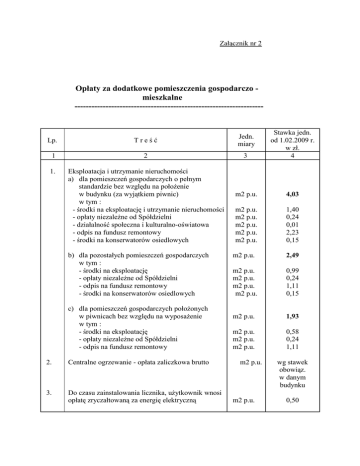 Załącznik nr 2 Opłaty za dodatkowe pomieszczenia gospodarczo mieszkalne ------------------------------------------------------------------- Lp. Treść Jedn. miary 1 2 3 Stawka jedn. od 1.02.2009 r. w zł. 4 1. Eksploatacja i utrzymanie nieruchomości a) dla pomieszczeń gospodarczych o pełnym standardzie bez względu na połoŜenie w budynku (za wyjątkiem piwnic) w tym : - środki na eksploatację i utrzymanie nieruchomości - opłaty niezaleŜne od Spółdzielni - działalność społeczna i kulturalno-oświatowa - odpis na fundusz remontowy - środki na konserwatorów osiedlowych m2 p.u. 4,03 m2 p.u. m2 p.u. m2 p.u. m2 p.u. m2 p.u. 1,40 0,24 0,01 2,23 0,15 b) dla pozostałych pomieszczeń gospodarczych w tym : - środki na eksploatację - opłaty niezaleŜne od Spółdzielni - odpis na fundusz remontowy - środki na konserwatorów osiedlowych c) dla pomieszczeń gospodarczych połoŜonych w piwnicach bez względu na wyposaŜenie w tym : - środki na eksploatację - opłaty niezaleŜne od Spółdzielni - odpis na fundusz remontowy 2. Centralne ogrzewanie - opłata zaliczkowa brutto 3. Do czasu zainstalowania licznika, uŜytkownik wnosi opłatę zryczałtowaną za energię elektryczną m2 p.u. 2,49 m2 p.u. m2 p.u. m2 p.u. m2 p.u. 0,99 0,24 1,11 0,15 m2 p.u. 1,93 m2 p.u. m2 p.u. m2 p.u. 0,58 0,24 1,11 m2 p.u. m2 p.u. wg stawek obowiąz. w danym budynku 0,50
