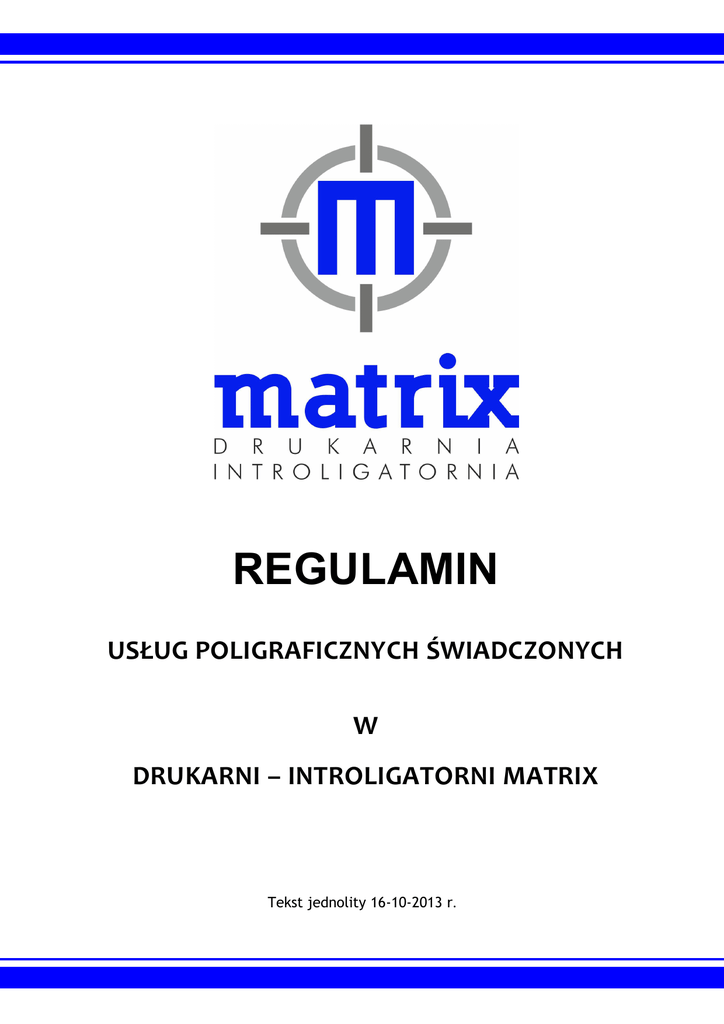 REGULAMIN USŁUG POLIGRAFICZNYCH ŚWIADCZONYCH W DRUKARNI – INTROLIGATORNI MATRIX Tekst jednolity 16-10-2013 r. REGULAMIN ŚWIADCZENIA USŁUG POLIGRAFICZNYCH W DRUKARNI – INTROLIGATORNI MATRIX SPIS TREŚCI PREAMBUŁA ……………………………………………………………………..……………………………………………………….… 3 § 1. DEFINICJE ……………………………………………………………………..……….……………………………………………..……… 3 § 2. POSTANOWIENIA OGÓLNE ……………………………………..…………………………………….……………………………… 3 § 4. ZAWARCIE UMOWY …………………………………………………..…………………………………….…………………………… 4 § 5. PRZYJMOWANIE ZAMÓWIEŃ …………………………………...……………………………..…………………………………… 4 § 5. REALIZACJA ZAMÓWIEŃ ……………………………………………..…………………………………………..…………………… 5 § 6. JAKOŚĆ DRUKU I PROCESÓW INTROLIGATORSKICH …….………………………………………………………………… 6 § 7. CENY I PŁATNOŚCI ………………………………………………………………………………………………………………………… 7 § 8. DOSTAWA I TRANSPORT …………………………………………………………………………..……………………..…………… 8 § 9. POSTĘPOWANIE Z WŁASNOŚCIĄ KLIENTA …………………………….…………………………..…………………………… 8 § 10. ZASADY POSTĘPOWANIA REKLAMACYJNEGO DLA KLIENTÓW NIE BĘDĄCYCH KONSUMENTAMI ….… 8 § 11. ZASADY POSTĘPOWANIA REKLAMACYJNEGO DLA KLIENTÓW BĘDĄCYCH KONSUMENTAMI …………. 9 § 12. ODPOWIEDZIALNOŚĆ …………………………………………….…………………………………………………………………….. 9 § 13. PRZETWARZANIE DANYCH OSOBOWYCH ……….………………….………………………………………………………….. 10 § 14. POSTANOWIENIA KOŃCOWE ……………………………………………..….…………………………………………………….. 10 Drukarnia - Introligatornia MATRIX Agnieszka Patrycy, ul. Okulickiego 7/9, 05-500 Piaseczno Strona 2 z 10 REGULAMIN ŚWIADCZENIA USŁUG POLIGRAFICZNYCH W DRUKARNI – INTROLIGATORNI MATRIX PREAMBUŁA 1. Ten regulamin określa warunki i zasady współpracy z Usługodawcą Agnieszką Patrycy prowadzącą działalność gospodarczą pod firmą MATRIX Agnieszka Patrycy, z siedzibą w Piasecznie, przy ulicy Okulickiego 7/9, NIP 5211012089, Regon 010851629 i wpisaną do Centralnej Ewidencji i Informacji o Działalności Gospodarczej prowadzonej przez Ministra Gospodarki - zwaną dalej: Drukarnią, Matrix, Usługobiorcą, Zleceniobiorcą lub Wykonawcą. 2. Drukarnia MATRIX nie prowadzi działalności produkcyjnej i sprzedaży wyrobów gotowych, tylko prowadzi działalność usługową polegającą na wykonywaniu usługi druku i oprawy w oparciu o indywidualne Zamówienia według indywidualnych projektów i wzorów Zleceniodawców - Usługi Personalizowane. 3. Kontakt zarówno telefoniczny jak i e-mail do MATRIX Agnieszka Patrycy jest podany na stronie www pod adresem: www.drukarnia-matrix.pl/kontakt.html § 1. DEFINICJE 1. 2. 3. 4. 5. 6. 7. 8. 9. 10. 11. 12. 13. 14. 15. 16. 17. Regulamin – niniejszy regulamin Drukarnia – Drukarnia i Introligatornia MATRIX Drukarnia offsetowa – Piaseczno, ul. Okulickiego 7/9 Drukarnia cyfrowa – Warszawa, ul. Puławska 41 Usługa – projektowanie i wykonywanie przez MATRIX dzieł na podstawie materiałów dostarczonych przez klienta za pośrednictwem konta FTP, lub nośników danych. Klient – osoba fizyczna, osoba prawna lub jednostka organizacyjna nie posiadająca osobowości prawnej a posiadająca zdolność do czynności prawnych, która na zasadach określonych w niniejszym regulaminie składa Zlecenie w Drukarni. Konsument – osoba fizyczna dokonująca czynności prawnej (umowy o dzieło za pośrednictwem serwisu) niezwiązanej bezpośrednio z jej działalnością gospodarczą lub zawodową (art. 221 Kodeksu cywilnego). Dzieło – projekt, plakat, folder, xero, wizytówki, zaproszenia ślubne lub inne prace kserowane lub drukowane techniką offsetową lub cyfrową, które mogą być przedmiotem zamówienia w Drukarni. Zamówienie – oświadczenie woli Klienta zmierzające bezpośrednio do zawarcia umowy o dzieło za pośrednictwem serwisu, określające parametry i ilość dzieł oraz sposób dostawy. Zleceniodawca – osoba fizyczna, osoba prawna lub jednostka organizacyjna nie posiadająca osobowości prawnej a posiadająca zdolność do czynności prawnych, która na zasadach określonych w niniejszym regulaminie składa Zlecenie w Drukarni. Opiekunem Klienta – pracownik Drukarni sprawujący nadzór nad realizacją Zleceń i służący pomocą Klientowi Personalizacja – nadanie czemuś osobistego charakteru. Dostosowanie do indywidualnych potrzeb, wymagań i upodobań Zleceniodawcy. Dni robocze drukarnia offsetowa – dni od poniedziałku do piątku w godzinach od 7:00-15:00. Dni robocze drukarnia cyfrowa – dni od poniedziałku do piątku w godzinach od 8:30-17:00. Metameryzm – zjawisko polegające na różnym odbiorze barwy tej samej substancji barwiącej uzależnionym od rodzaju światła, w którym substancja barwiąca jest oglądana. Barwa – wrażenie psychiczne wywoływane w mózgu ludzi i zwierząt, gdy oko odbiera promieniowanie elektromagnetyczne z zakresu światła. Główny wpływ na to wrażenie ma skład widmowy promieniowania świetlnego, w drugiej kolejności ilość energii świetlnej, jednak niebagatelny udział w odbiorze danej barwy ma równie
