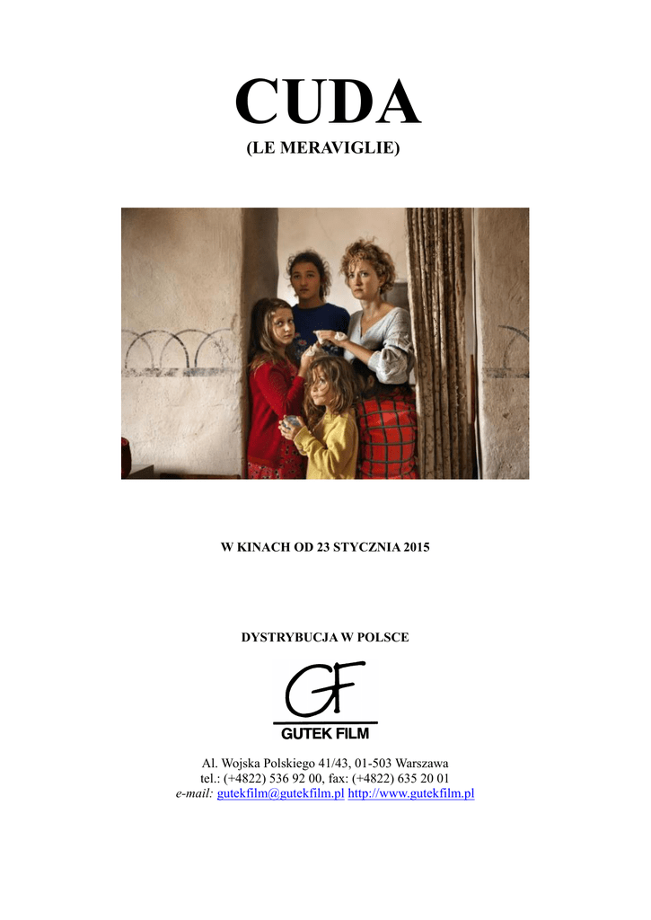CUDA (LE MERAVIGLIE) W KINACH OD 23 STYCZNIA 2015 DYSTRYBUCJA W POLSCE Al. Wojska Polskiego 41/43, 01-503 Warszawa tel.: (+4822) 536 92 00, fax: (+4822) 635 20 01 e-mail: [email protected] http://www.gutekfilm.pl CUDA LE MERAVIGLIE Reżyseria Alice Rohrwacher Scenariusz Alice Rohrwacher Montaż Marco Spoletini Zdjęcia Hélène Louvart W rolach głównych : Alba Rohrwacher Maria Alexandra Lungu Sam Louwyck Sabine Timoteo Agnese Graziani Monica Bellucci Angelica Gelsomina Wolfgang Cocò Marinella Milly Catena Producenci Carlo Cresto-Dina Karl „Baumi” Baumgartner Tiziana Soudani Michael Weber Produkcja Tempesta Amka Films Productions Rai Cinema Włochy / Szwajcaria / Niemcy rok produkcji: 2014 czas trwania: 110 min. 35 mm – Dolby Digital Kolor "Wielkie przeżycie: wciągająca, piękna opowieść" Jane Campion "Dawno nie byłam tak wzruszona… Genialny, pełen życia świat" Sophia Coppola "Na samym końcu popłakałem się" Nicolas Windig Refn OPIS FILMU Zwycięzca Grand Prix na festiwalu w Cannes. Film, który oczarował członków jury: Jane Campion oraz Sophię Coppolę, a Nicolasa Windinga Refna poruszył do łez. „Cuda” młodej reżyserki Alice Rohrwacher opowiadają prawdziwą historię jej dorastania w ekscentrycznej rodzinie, mieszkającej w wielkim, starym domu w Toskanii. Kiedy lato dobiegnie końca nic już nie będzie takie samo w życiu Gelsominy i jej trzech młodszych sióstr. Dziewczyna mieszka z dala od cywilizacji, w ukrytym zakątku na włoskiej prowincji, gdzie trudno jeszcze spotkać turystów. To właśnie tutaj przenieśli się jej rodzice, dawni członkowie hippisowskiej komuny, by żyć blisko natury i chronić swoje dzieci przed „upadkiem świata”. Tego lata, jak co roku, większość dni będzie upływała rodzinie na tradycyjnej produkcji miodu, z której z trudem udaje im się związać koniec z końcem. Jednak po raz pierwszy surowe reguły narzucone przez ojca ulegną rozluźnieniu. Gelsomina marzy bowiem, by uratować rodzinę przed bankructwem i zdobyć wielką nagrodę w telewizyjnym teleturnieju prowadzonym przez tajemniczą Milly Catenę (Monica Bellucci). Choć stoi to w całkowitej sprzeczności z poglądami i wartościami, które do tej pory wpajał w nią ojciec, dziewczyna za wszelką cenę będzie starała się przekonać go do tego pomysłu. REŻYSERKA O FILMIE BAŚŃ „Cuda” są filmem o życiu na wsi, o wyjątkowej miłości między ojcem i córkami, o tęsknocie za męskim potomkiem, o zwierzętach i małych ludzikach żyjących w telewizorze. To film, w którym bohaterowie mówią w dialekcie z prowincji Viterbo, ale kiedy się zdenerwują sięgają też po francuski i niemiecki. „Cuda” to baśń. AUTOBIOGRAFIZM Akcja filmu dzieje się w moim rodzinnym mieście, pośród moich krajan. To miasto znajduje się na włoskiej prowincji – między regionami Umbria-Lazio a Toskanią – a pszczoły to zwierzęta, które znam najlepiej. Wiem też sporo o rodzinach, których członkowie pochodzą z różnych kultur, nie tylko z powodu mojego niemiecko-francuskiego pochodzenia, ale też dlatego, że w okolicy zawsze było ich sporo. Ale poza tymi elementami ta historia nie jest autobiograficzna, choć oczywiście dość mi znajoma. Chciałam żeby główną bohaterką była najstarsza siostra i oczywiście wzorowałam ją na mojej siostrze Albie i tym, jak postrzegałam ją w dzieciństwie, ale szybko bym się znudziła, gdyby miał to być materiał tylko autobiograficzny. Szczególnie, że interesuje mnie głównie odkrywanie innych ludzi, a nie siebie. Kiedy piszę scenariusz szukam postaci, które mogą żyć długo po akcji filmu, które stymulują moją wyobraźnię. Wolę więc, żeby były mi obce, mogę je wtedy odkrywać w nieskończoność. PIERWSZY IMPULS W pewnym momencie zawsze ktoś mnie pyta skąd jestem. Oczywiście wolałabym odpowiedzieć „z Rzymu” albo „z Mediolaniu”, co zamykałoby temat. Najczęściej jednak kończę, opowiadając, że pochodzę z prowincji na granicy Umbria-Lazio i Toskanii, gdzie mieszkają ludzie z różnych kultur. Czasami zdarza się, że osoba, z którą rozmawiam, zna te regiony. „Tak, tak. Byłem w Civita w poprzednią niedzielę. Czułem się, jakbym na jeden dzień cofnął się do średniowiecza”. Właśnie takie rozmowy były pierwszym impulsem do zrealizowania „Cudów”. Uświadomiły mi one, że ludzie postrzegają wieś albo małe miasteczka jako nieskażone cywilizacją miejsca poza czasem, gdzie niewiele się zmieniło. Tymczasem, jeśli spojrzeć na nie od środka, okazuje się, że to więzienia, na które ludzie dobrowolnie się skazali, bo wiedzą, że dostaną przynajmniej jedną miskę z ciepłym posiłkiem dziennie. PSZCZOŁY I MIÓD Znam pszczoły dość dobrze i pracowałam przez chwilę przy produkcji miodu. Uwielbiam pszczoły, choć niełatwo było przekonać firmy ubezpieczeniowe, że aktorom nic się nie stanie podczas zdjęć. Bardzo mi zależało na pracy z żywymi owadami, bez sięgania po efekty specjalne. Chciałam uchwycić ich niezwykłą naturę, a także by aktorzy mieli fizyczny kontakt z nimi i z ulami. Potrzeba było do tego wielu prób. Bardzo byli z tego zadowoleni rodzice Marii Alexandy Lungu, która grała Gelsominę. Mówili, że nawet jeśli film się nie uda, to ich córka tyle się na planie nauczyła, że może zostać pszczelarką. GELSOMINA Nie wiedziałam do końca, jaka ta postać ma być, ale wiedziałam, że poznam ją, gdy tylko zobaczę. I tak właśnie się stało. Po miesiącach poszukiwań właściwej aktorki trafiliśmy w pewnej salce katechetycznej na Marię Alexandrę Lungu – i nie mieliśmy żadnych wątpliwości. Praca z nią była czystą przyjemnością. Maria niesłychanie szybko się uczyła, a przede wszystkim chciała pracować na planie, co jest najważniejsze. Kiedy zaczynaliśmy zdjęcia miała zaledwie 11 lat i żadnego aktorskiego doświadczenia, czy to w filmie, czy teatrze. Ma rumuńskie korzeni