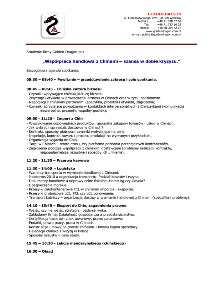 ul. Marcinkowskiego 12/4, 50-368 Wrocław Tel/faks: +48 71 328 07 68 Tel: +48 71 723 16 25 Mobile: +48 88 084 42 67 www.goldendragon.com.pl e-mail: [email protected] Szkolenie firmy Golden Dragon pt.: „Współpraca handlowa z Chinami – szansa w dobie kryzysu.” Szczegółowa agenda spotkania: 08:30 – 08:40 – Powitanie – przedstawienie zakresu i celu spotkania. 08:45 – 09:45 - Chińska kultura biznesu - Czynniki wpływające chińską kulturę biznesu. - Zwyczaje i etykieta w prowadzeniu biznesu w Chinach oraz w życiu codziennym. - Negocjacji z chińskimi partnerami (specyfika, protokół i etykieta, zagrożenia). - Czynniki sprzyjające powodzeniu w kontaktach interpersonalnych z Chińczykami (komunikacja niewerbalna, prezenty, wspólny posiłek). 09:50 - 11:20 - Import z Chin - Wyszukiwanie odpowiednich produktów, geografia zakupów towarów i usług w Chinach. - Jak wybrać i sprawdzić dostawcę w Chinach? - Kontrakt, sposoby płatności, czynniki wpływające na cenę. - Inspekcje, kontrola towaru i procesu produkcji na wybranych przykładach. - Organizacja wyjazdu do Chin. - Targi w Chinach – strata czasu, czy platforma poznania potencjalnych kontrahentów. - Zagrożenia podczas współpracy z chińskimi dostawcami (problemy realizacji kontraktu, najpopularniejsze oszustwa i sposoby ich unikania). 11:20 - 11:30 – Przerwa kawowa 11:30 - 14:00 - Logistyka - Warianty transportu w wymianie handlowej z Chinami. - Incoterms 2010 a organizacja transportu. Podział kosztów i ryzyka. - Dokumenty handlowe a odprawy celne fiskalne. Hamburg czy Gdynia? - Ubezpieczenia morskie. - Przesyłki całokontenerowe FCL w chińskim imporcie i eksporcie. - Przesyłki drobnicowe LCL. FCL czy LCL porównanie. - Transport Lotniczy – organizacja dostaw w wymianie handlowej z Chinami (specyfika i problemy). 14:10 - 15:40 – Eksport do Chin, zagadnienia prawne - Wejść, czy nie wejść, strategia i badania rynku. - Zakładamy firmę. Działalność gospodarcza a przedstawicielstwo. - Certyfikacja towarów, znak towarowy, prawo patentowe. - Podatki, prawo pracy, praca w Chinach. - Konstrukcja umowy na prawie chińskim. Umowa kupna sprzedaży. - Delegacja chińska z wizytą w Polsce. - Sposoby oszustw – case study. 15:45 – 16:30 - Lekcja mandaryńskiego (chińskiego) 16:30 – Obiad ul. Marcinkowskiego 12/4, 50-368 Wrocław Tel/faks: +48 71 328 07 68 Tel: +48 71 723 16 25 Mobile: +48 88 084 42 67 www.goldendragon.com.pl e-mail: [email protected] Prelegenci: Grzegorz Gołojuch (Golden Dragon i Beijing Huajin Engineering) Maria Chrzanowska (Kierownik Działu Frachtów Lotniczych Solid Logistics) Bolesław Chełkowski (Dyrektor Sprzedaży Solid Logistics) Mariusz Gumiński (Solid Logistics) Wei Xin (lektorka języka chińskiego Szkoła Języka Chińskiego Nihao) Szanowni Państwo, Proponujemy Państwu spotkanie w gronie fachowców, którzy przekażą praktyczną wiedzę dotyczącą szeroko pojętej wymiany handlowej z Chińską Republiką Ludową. Poruszane zagadnienia są odpowiedzią na potrzeby przedsiębiorców chcących nie tylko importować towary, surowce, usługi z Państwa Środka, ale również skierowane są do biznesmenów szukających nowych rynków zbytu. Przekażemy Państwu wiedzę jak działać i poruszać się na wymagającym chińskim rynku, aby znaleźć na nim miejsce dla swoich produktów i usług. Na spotkaniu przybliżymy zwyczaje i reguły wpływające na prowadzenie biznesu w Chinach, jak również specyfikę negocjacji z chińskimi partnerami. Przedstawimy Państwu komplet praktycznych zagadnień związanych z importem Państwa Środka, a więc między innymi gdzie poszukiwać i jak weryfikować dostawców, w jaki sposób przygotować odpowiednie dokumenty, jak skonstruować kontrakt i kontrolować proces importu na terenie Chin. Zaprezentujemy również potencjalne zagrożenia i sposoby ich uniknięcia. Pracownicy Solid-Logistics firmy spedycyjnej działającego od wielu lat w Chinach przedstawią cały proces logistyczny związany z wymianą handlową z Chinami. Opiszemy różne warianty transportu doradzając najlepsze rozwiązanie dla Państwa przedsięwzięcia. Poruszone zostaną również problemy kosztów, ryzyka, ubezpieczeń, poradzimy jak przygotować wymagane dokumenty oraz przybliżymy procedury związane z odprawą celną. W dalszej części szkolenia przedsiębiorcom planującym silniejszą obecność na chińskim rynku zaprezentujemy cały wachlarz zagadnień regulowanych przez chińskie prawo. Przedstawimy możliwości rozpoczęcia działalności gospodarczej na terenie Chin, zasady podczas konstruowania umów, przybliżymy prawo pracy, system podatkowy, bariery chroniące rynek, reguły rządzące ochroną własności intelektualnej. Na zakończenie szkolenia lektor z wrocławskiej Szkoły Języka Chińskiego Nihao przybliży podstawowe zasady języka mandaryńskiego (chińskiego) oraz poprowadzi lekcje pokazową tego języka. Wykłady poprowadzą pracownicy Golden Dragon i Solid-Logistics mający za sobą kilkunastoletnie doświadczenie w kontaktach handlowych z Chinami. Więcej informacji o naszej firmie znajdziecie Państwo na stronie www.goldendragon.com.pl Serdecznie Zapraszamy do wzięcia udziału w szkoleniu i przyszłej współpracy. Dominika Dujin-Gołojuch