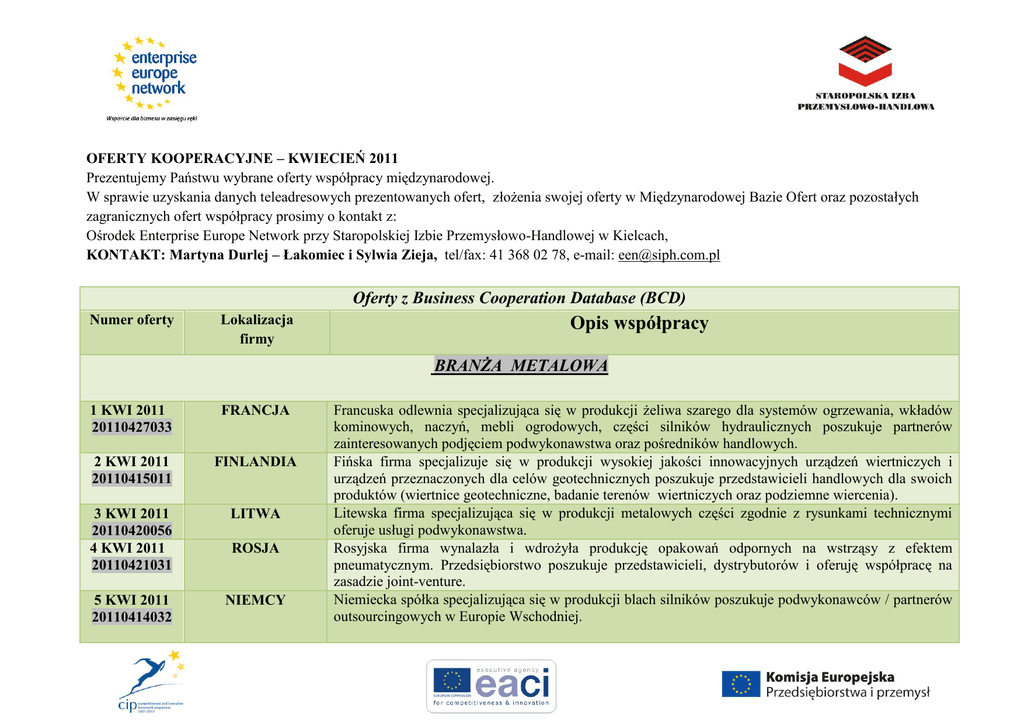 OFERTY KOOPERACYJNE – KWIECIEŃ 2011 Prezentujemy Państwu wybrane oferty współpracy międzynarodowej. W sprawie uzyskania danych teleadresowych prezentowanych ofert, złożenia swojej oferty w Międzynarodowej Bazie Ofert oraz pozostałych zagranicznych ofert współpracy prosimy o kontakt z: Ośrodek Enterprise Europe Network przy Staropolskiej Izbie Przemysłowo-Handlowej w Kielcach, KONTAKT: Martyna Durlej – Łakomiec i Sylwia Zieja, tel/fax: 41 368 02 78, e-mail: [email protected] Oferty z Business Cooperation Database (BCD) Numer oferty Lokalizacja firmy Opis współpracy BRANŻA METALOWA 1 KWI 2011 20110427033 FRANCJA 2 KWI 2011 20110415011 FINLANDIA 3 KWI 2011 20110420056 4 KWI 2011 20110421031 LITWA 5 KWI 2011 20110414032 NIEMCY ROSJA Francuska odlewnia specjalizująca się w produkcji żeliwa szarego dla systemów ogrzewania, wkładów kominowych, naczyń, mebli ogrodowych, części silników hydraulicznych poszukuje partnerów zainteresowanych podjęciem podwykonawstwa oraz pośredników handlowych. Fińska firma specjalizuje się w produkcji wysokiej jakości innowacyjnych urządzeń wiertniczych i urządzeń przeznaczonych dla celów geotechnicznych poszukuje przedstawicieli handlowych dla swoich produktów (wiertnice geotechniczne, badanie terenów wiertniczych oraz podziemne wiercenia). Litewska firma specjalizująca się w produkcji metalowych części zgodnie z rysunkami technicznymi oferuje usługi podwykonawstwa. Rosyjska firma wynalazła i wdrożyła produkcję opakowań odpornych na wstrząsy z efektem pneumatycznym. Przedsiębiorstwo poszukuje przedstawicieli, dystrybutorów i oferuję współpracę na zasadzie joint-venture. Niemiecka spółka specjalizująca się w produkcji blach silników poszukuje podwykonawców / partnerów outsourcingowych w Europie Wschodniej. 1 BRANŻA ODNAWIALNE ŹRÓDLA ENERGII 6 KWI 2011 20110407008 ROSJA 7 KWI 2011 20110418014 HISZPANIA 8 KWI 2011 20110419006 BUŁGARIA Rosyjska firma specjalizująca się w energooszczędnych technologiach i dostaw oprawy świateł i lamp LED, poszukuje rzetelnych i doświadczonych partnerów biznesowych we wszystkich krajach europejskich do współpracy handlowo - usługowej. Hiszpańska firma specjalizująca się w sektorze meteorologicznym, energetycznym i komunikacyjnym poszukuje dystrybutorów i podwykonawców do instalacji produktów. Firma produkuje maszty wiatrowe a także zajmuje się instalacją i podłączaniem różnego rodzaju sprzętu pomiarowego. Bułgarska firma działająca w sektorze energetycznym, posiadająca elektrownię fotowoltaiczną poszukuje partnerów do współpracy typu joint venture w sektorze odnawialnych źródeł energii oraz oferuje gotowe projekty dla potencjalnych inwestorów. BRANŻA DRZEWNA 9 KWI 2011 20110418042 10 KWI 2011 20110412013 11 KWI 2011 20110401024 12 KWI 2011 20110417001 13 KWI 2011 20110331022 14 KWI 2011 20110426020 15 KIE 2011 20110412006 SZWECJA ROSJA CHORWACJA CHORWACJA ŁOTWA ŁOTWA BELGIA Firma z południowej Szwecji produkująca nowoczesne szafy do suszenia odzieży poszukuje producenta zbiorników z tworzywa sztucznego, który służyłby do zbierania nadmiaru wody z suszarki. Firma z Rosji, specjalizująca się produkcji drewnianych pamiątek na rucjomej podstawie (produkty rosyjskiego rękodzieła z ludowymi dekoracyjami), poszukuje pośredników handlowych w Europie Chorwacki producent masywnych mebli dębowych i wyrobów fornirowanych poszukuje partnerów handlowych. Meble są produkowane z drewna sezonowanego od 50 do 100 i więcej lat. Chorwacki producent mebli kuchennych i łazienkowych poszukuje partnerów handlowych i oferuje usługi transportowo-logistyczne Łotewska firma z sektora drzewnego zajmująca się obróbką tarcicy i pracami stolarskimi poszukuje partnerów handlowych i oferuje usługi podwykonawstwa Łotewska firma z ponad 20-letnią historią, specjalizująca się w obróbce drewna poszukuje partnerów handlowych i oferuje usługi podwykonawstwa Belgijska firma, specjalizująca się w meblach drewnianych, poszukuje możliwości podwykonawstwa w obróbce drewna. 2 BRANŻA BUDOWLANA 16 KWI 2011 20110401010 17 KWI 2011 20110420033 RUMUNIA 18 KWI 2011 20110401002 19 KWI 2011 20110403003 AUSTRIA LITWA CHORWACJA 20 KWI 2011 20110408023 NIEMCY 21 KIE 2011 20110414009 22 KWI 2011 20110413026 BELGIA FRANCJA Rumuńskie przedsiębiorstwo specjalizujące się w instalacjach wodno-kanalizacyjnych, instalacjach klimatyzacji poszukuje partnerów handlowych oraz oferuje usługi podwykonawstwa. Litewska firma specjalizująca się we wznoszeniu, naprawie i izolacji dachów spadzistych i płaskich, w produkcji drewnianych więźb dachowych, w konstrukcji szkieletów domów, poszukuje oraz oferuje pośrednika handlowego i usług podwykonawstwa. Austriacka firma zajmująca się produktami budowlanymi do wzmacnianych konstrukcji betonowych poszukuje dostawców. Chorwacka firma specjalizująca się w projektowaniu i wykonawstwie instalacji elektrycznych, systemów do kompensacji mocy, utrzymywaniu zakładów przemysłowych i obiektów handlowych pod względem elektrotechnicznym. Firma poszukuje partnerów handlowych, do joint venture i oferuje usługi podwykonawstwa Niemiecka firma specjalizująca się w planowaniu i produkcji reklam świetlnych (neony) poszukuje podwykonawców z Polski do obróbki metalu. Od potencjalnego partnera firma oczekuje usług wykonania oraz dostarczenia gotowego produktu (wytwarzanego z użyciem maszyn CNC). Belgijski wytwórca mebli poszukuje możliwości podwykonawstwa od wydmuchiwacza. Francuski projektant i producent przenośnych systemów oświetlenia przeznaczonych dla profesjonalistów poszukuje partnerów działających w obszarze dostaw przemysłowych oraz budowlanych. BRANŻA TEKSTYLNA 23 KWI 2011 20110421002 24 KIE 2011 20110426015 GRECJA TURCJA Grecka firma produkująca szeroką gamę odzieży roboczej poszukuje partnerów do dystrybucji swoich produktów. Turecka firma, specjalizująca się w wytwar