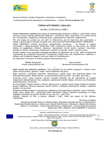 Warszawa, 26 maja 2008 r. Szanowni Państwo, Drodzy Przyjaciele, Animatorzy i Animatorki… z wielką przyjemnością zapraszamy na jubileuszowe – z okazji 10-lecia programu CAL – FORUM AKTYWNOŚCI LOKALNEJ Hucisko, 25-28 czerwca 2008 r. Forum Aktywności Lokalnej jest okazją do edukacyjnego spotkania z ludźmi z całej Polski, którzy pracują na rzecz rozwoju społeczności lokalnych – animują na małą i duŜą skalę, na co dzień mierzą się z wyzwaniami: współpracy, budowania grup, rozpoznawania oczekiwań, angaŜowania. FAL jest okazją do uczenia się, jak robić to efektywniej, ale teŜ skąd brać siłę, wytrwałość, a dbając o sprawy pilnie i bieŜące nie gubić celu, jakim jest AKTYWNA SPOŁECZNOŚĆ i WSPÓLNOTA. Wokół WSPÓLNOTY właśnie (prywatnej, geograficznej, duchowej… - do których w naszych CALowskich i okołoCALowskich działaniach razem zmierzamy) osnute są całe cztery dni. Będzie okazja do pogłębionej refleksji, skupienia, sprawdzania swoich granic, dyskusji, twórczości, kontaktu z kulturą i lokalnością, świętowania, spotkań z przyrodą, innymi i samym/ą sobą… PoniŜej program oraz wszystkie szczegóły potrzebne do zgłoszenia się na FAL. Mamy przyjemność organizować go ze śląskimi Partnerami i Przyjaciółmi (dzięki temu jest wspólnotowo i rodzinnie, a program jest wyjątkowo bogaty!) oraz przy wsparciu Grantodawców. Do zobaczenia w Hucisku! W imieniu Zespołu Stowarzyszenia CAL, Bohdan Skrzypczak Prezes Stowarzyszenia CAL Marta Henzler Dyrektorka Stowarzyszenia CAL *** Śląsk zawsze był miejscem spotkania. Tutaj spotykali się od wieków przybysze z róŜnych stron, ludzie róŜnych kultur, języków, religii. Tutaj znajdowali swój dom… Śląsk wyznacza i kształtuje charakter, temperaturę i jakość Ŝycia, jest przyczyną odkryć oraz doświadczenia piękna. RóŜnorodność to najcenniejszy skarb tej ziemi - jej część, jej uroda… Przymioty ziemi, nasza tradycja, kultura, przyjaźń ośmieliły nas do zaproszenia na wspólne świętowanie dziesięciolecia CALa, spotkanie, poznawanie skarbów Śląska, do serca Jury KrakowskoCzęstochowskiej, do Huciska. Bo to teŜ Śląsk! I jedyne miejsce w Polsce, gdzie prawie w jednym czasie moŜna chodzić po skałach, pływać Ŝaglówką, zobaczyć pustynię, poczuć klimat (i dotknąć) piastowskich zamków, nazbierać grzybów na całą zimę. Dodatkowa bliskość bogactw Częstochowy, aglomeracji Górnego Śląska, Beskidów, ziemi rybnickiej – kaŜde cenne, kaŜde inne – potwierdza tylko niezwykłość miejsca. Spośród wszystkiego, co mamy najlepsze staraliśmy się wybrać dla Was to naj, naj, naj – czyli CAL☺. Kochani, czekamy na Was „z pokorą, chlebem i solą”. Hotel jest więcej niŜ OK. Byliśmy, widzieliśmy… Partnerzy ze Śląska: Regionalny Ośrodek Kultury w Bielsku-Białej, Regionalny Ośrodek Kultury w Częstochowie, Regionalny Ośrodek Kultury w Katowicach, Miejski Dom Kultury w Blachowni, Miejski Dom Kultury „Batory” w Chorzowie, Gminny Ośrodek Kultury w Mykanowie, Centrum Rozwoju Inicjatyw Społecznych CRIS w Rybniku, firma HORIZONT w Zawierciu ________________________________________________ Spotkanie współfinansowane jest w ramach: Projekt ”Aktywnespołeczności.pl – panorama i potencjał lokalnej aktywności społecznej – współfinansowanego z budŜetu Programu Środki Przejściowe 2005 – umowa nr 10041/JFK/PPt-DG/2007-2005/017488.01.01.01/ngo/351 dotacji Województwa Śląskiego, projekt „Forum Aktywności Lokalnej” oraz projektu „Aktywne Społeczności 2”finansowanego z Funduszu ProBonus PROGRAM FORUM AKTYWNOŚCI LOKALNEJ 25.VI.2008 - środa Od 14:00 Przyjazd FALowiczów 15:00 Obiad 16:00-18:00 Warsztaty „integracja i refleksja nad WSPÓLNOTĄ” metodą OPEN SPACE TECHNOLOGY w plenerze, prowadzenie Jacek Gralczyk, animator, ekspert i trener Stowarzyszenia CAL 19:00 Kolacja 20:00 UROCZYSTE OTWARCIE FALA Otwarcie FALa: Bohdan Skrzypczak, prezes Stowarzyszenia CAL i Gospodarze – partnerzy ze Śląska Koncert Orkiestry Dętej z Mykanowa Orkiestra Dęta w Mykanowie powstała w 1910 r. W 1998 r. kapelmistrzem orkiestry został Krzysztof Witczak i jest nim do dnia dzisiejszego. W roku 2000 powstała przy orkiestrze szkółka nauki gry na instrumentach dętych i perkusyjnych oraz grupa maŜoretek, która prezentuje układy taneczne do muzyki wykonywanej przez orkiestrę. Orkiestra uczestniczy w Ŝyciu kulturalnym regionu, uświetniając wiele imprez, jest laureatem wielu prestiŜowych ogólnopolskich konkursów, jej największy sukces to I miejsce na XIX Ogólnopolskim Festiwalu Orkiestr OSP w Krynicy Górskiej. 10-lecie programu CAL – jubileusz Uroczyste wręczenie Certyfikatów Jakości CAL nowym ośrodkom pracującym metodą CAL Ognisko Inauguracja Kawiarenki Artystycznej „Na FALi” Kawiarenka Artystyczna „Na FALi” będzie miejscem spotkań, dyskusji, wymiany myśli, snucia refleksji, ale i artystycznych występów i przeŜyć, tworzenia sztuki itd. W Kinie „Na FALi”projekcje filmów o lokalności, aktywnych społecznościach – zachęcamy do przywiezienia filmów z Waszych projektów i środowisk! 26.VI.2008 – czwartek 9:00 Śniadanie 10:00-14:00 OD REFLEKSJI DO DZIAŁANIA (spotkania – do wyboru) (kaŜdy/a moŜe wybrać jedno spotkanie w tym czasie – patrz formularz zgłoszeniowy!) 2 1. Wyjazd do Częstochowy - zwiedzanie Klasztoru na Jasnej Górze oraz Starej Biblioteki Jasnogórskiej. Wykład Ojca dr Kazimierza Wilka „Etyczne dylematy animacji”. Jasna Góra – najsłynniejsze polskie sanktuarium (ok. 4 mln odwiedzających rocznie), główny cel pieszych pielgrzymek w Polsce (ok. 200 tys. pątników) i jedno z najczęściej odwiedzanych świętych miejsc chrześcijaństwa. Jasna Góra jest przy tym największym na świecie ośrodkiem kultu maryjnego związanego z kultem świętej ikony, a nie z objawieniami Matki BoŜej. Na obszarze ok. 5 ha znajduje się kaplica Cudownego 