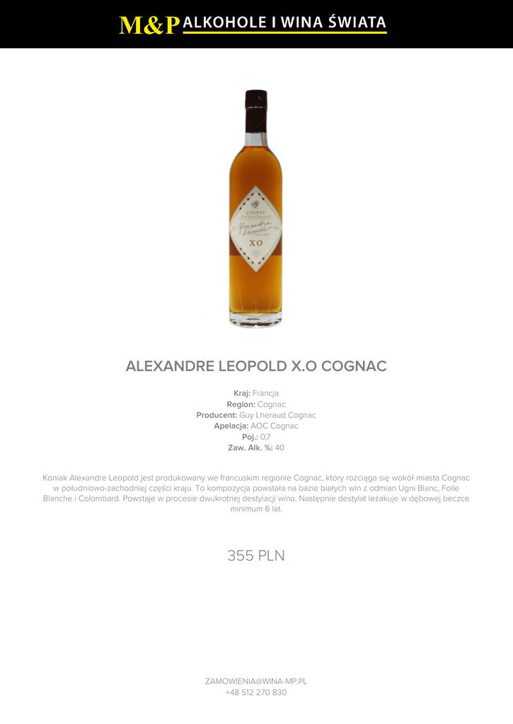 ALEXANDRE LEOPOLD X.O COGNAC 355 PLN