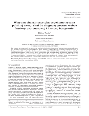 Psychologiczne Wstępna charakterystyka psychometryczna polskiej wersji Czasopismo skal do diagnozy postaw ... Psychological Journal DOI: 10.14691/CPPJ.21.2.219 Wstępna charakterystyka psychometryczna polskiej wersji skal do diagnozy postaw wobec kariery proteuszowej i kariery bez granic Elżbieta Turska* Uniwersytet Śląski, Katowice Marta Stasiła-Sieradzka Uniwersytet Śląski, Katowice INITIAL CHARACTERISTICS OF THE SCALES FOR DIAGNOSIS PROTEAN AND BOUNDARYLESS CAREER ATTITUDES The purpose of this article is to present the results in the initial adaptation of scale attitudes towards Protean and Boundaryless Career Attitudes (Briscoe, Hall, DeMuth, 2006) in Polish conditions. Conceptualization of distinguished models was based on the theory of Briscoe and Hall (1999; 2006). The adapted tool includes attitudes towards Protean Career which consists of two lower scales: Self- Directed Career Management Scale and Values Driven Scale and the ones towards Boundaryless Career Model created by Boundaryless Mindset Scale and Organizational Mobility Preference Scale. In confirmatory factor analysis the existence of the four-factor model was confirmed (N=451 respondents). The reliability and accuracy of all four scales was verified. Key words: Protean Career; Boundaryless Career Model; values in career; self- directed career management; psychological mobility; organizational mobility WPROWADZENIE Czasom, w których żyjemy towarzyszą głębokie przemiany społeczne i strukturalne w wymiarze globalnym, silnie determinujące wszystkie sfery życia człowieka i podejmowane przez niego działania. Jednym z obszarów, który uległ diametralnej zmianie stał się obszar zawodowej aktywności. Sytuacja transformacji wymusiła konieczność dostosowywania karier zawodowych wszystkich uczestników rynku pracy do nowych wymogów i oczekiwań organizacji, których głównym kontekstem funkcjonowania stała się permanentna zmiana, nieprzewidywalność, chaos (Beck, 2002; Guichard i Huteau 2005; Turska 2006). W efekcie od członków tych organizacji oczekuje się elastyczności, mobilności, otwartości, adaptacji do szybko zmieniającego się otoczenia. Warunki, w jakich funkcjonują współczesne organizacje znacznie zmieniły zarówno wymagania stawiane przed jednostką, jak również spowodowały zmianę sposobów realizowania zawodowej kariery (Stasiła-Sieradzka i Turska, 2010; Turska, 2014). Ponieważ obecnie coraz mniej prawdopodobna staje się praca i zatrudnienie w tej samej organizacji przez cały okres aktywności * Korespondencję dotyczącą artykułu można kierować na adres: Elżbieta Turska, Uniwersytet Śląski, ul. Grażyńskiego 53, 40126 Katowice. [email protected] zawodowej, to pracownik zmuszony jest coraz częściej w swojej karierze zawodowej wielokrotnie zmieniać pracę, dopasowywać się do nowych miejsc, form czy rodzajów zatrudnienia. Badacze problematyki kariery podkreślają, że współczesna kariera z modelu linearnego, realizowanego w ramach jednej organizacji, przekształca się w model „kariery bez granic” (boundaryless careers), wybiegającej poza ramy jednej organizacji czy jednego pracodawcy (por. Arthur, 1994; DeFillippi i Arthur, 1996; Briscoe i Hall, 1999; Hall, 2002; Briscoe i Hall, 2006; Bańka, 2006; Strykowska, 2012). Lipińska-Grobelny (2014) zwraca uwagę na zwiększającą się grupę tzw. pracowników portfolio realizujących wiele ról zawodowych czy też podejmujących pracę u więcej niż jednego pracodawcy. Taki sposób zawodowego funkcjonowania wydaje się szczególnie trudny dla starszych pracowników, których możliwości szybkiej adaptacji do niestabilnych warunków rynku pracy są zdecydowanie mniejsze, niż ludzi młodych. Odejście w przeszłość modelu tradycyjnej kariery organizacyjnej zachęca do poszukiwania nowych modeli aktywności zawodowej jednostki. Jedną z interesujących propozycji w tym zakresie stanowi koncepcja Briscoe i Halla (2006) oparta na dwóch modelach aktywności zawodowej: na modelu kariery proteuszowej Halla (1996) i modelu kariery bez granic Arthura (1994). Kariera proteuszowa i kariera bez granic to dwie koncepcje, które © Czasopismo Psychologiczne – Psychological Journal, 21, 2, 2015, 219-227 219 Elżbieta Turska, Marta Stasiła-Sieradzka w ostatnich latach w znaczącym stopniu wpłynęły na sposób myślenia o współczesnej karierze. W niniejszym artykule przedstawiono wyniki procesu wstępnej adaptacji skal do pomiaru postaw wobec kariery proteuszowej oraz kariery bez granic Briscoe, Halla i DeMuth (2006). KARIERA PROTEUSZOWA I KARIERA BEZ GRANIC – NOWE MODELE FUNKCJONOWANIA ZAWODOWEGO Briscoe i Hall (Briscoe i Hall, 1999; Hall, 2002; Briscoe i Hall, 2006) twierdzą, że nowe sposoby funkcjonowania zawodowego powinny opierać się na założeniu, że na kierunek, potencjał i sukces we współczesnej karierze wpływa mobilność stanowiąca podstawowy wymiar kariery bez granic oraz cechy kariery określanej pojęciem proteuszowej (protean careers) (Hall, 1996; Mirvis i Hall, 1996; Hall, Briscoe i Kram, 1997; Hall, 2002; Hall, 2004; Hall i Chandler, 2005). Kariera bez granic stanowi przeciwieństwo tradycyjnej kariery organizacyjnej – nie jest związana z jedną organizacją, brak w niej uporządkowanego ciągu określonych sekwencji, aktywności czy zadań, charakteryzuje ją zmienność, niestabilność, nieprzewidywalność (Arthur, 1994). Sullivan i Arthur (2006) wyróżniają w niej dwa wymiary: 1. Mobilność fizyczną (physical mobility) oznaczającą przekraczanie przez jednostkę określonych barier fizycznych (zmiany organizacji, zmiany pracodawcy, zmiany pracy itp.). 2. Mobilność psychologiczną (psychological mobility) oznaczającą zdolność jednostki do dokonywania zmian w karierze, otwartość na zmiany. Zdaniem autorów oba rodzaje mobilności mogą przybierać wartości od niskich do wysokich, co prowadzi do możliwości wyróżnienia ze względu na minimalne i maksymalne nas