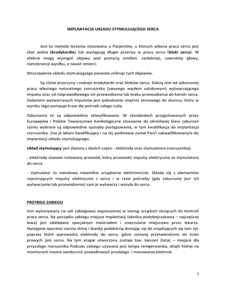 IMPLANTACJA UKŁADU STYMULUJĄCEGO SERCA Jest to metoda leczenia stosowana u Pacjentów, u których własna praca serca jest zbyt wolna (bradykardia) lub występują długie przerwy w pracy serca (bloki serca). W efekcie mogą wystąpić objawy pod postacią omdleń, zasłabnięć, zawrotów głowy, nietolerancji wysiłku, a nawet śmierci. Wszczepienie układu stymulującego pozwala uniknąć tych objawów. Są różne przyczyny i rodzaje bradykardii oraz bloków serca. Zależą one od zaburzonej pracy własnego naturalnego rozrusznika (zwanego węzłem zatokowym) wytwarzającego impulsy oraz od nieprawidłowego ich przewodzenia lub braku przewodzenia do komór serca. Zadaniem wytwarzanych impulsów jest pobudzanie mięśnia sercowego do skurczu, który w wyniku tego pompuje krew dla potrzeb całego ciała. Zaburzenia te są odpowiednio sklasyfikowane. W standardach przygotowanych przez Europejskie i Polskie Towarzystwo Kardiologiczne stosownie do określonej klasy zaburzeń rytmu wybrane są odpowiednie sposoby postępowania, w tym kwalifikacja do implantacja rozrusznika. Zna je lekarz kwalifikujący i na tej podstawie został Pan/i zakwalifikowany/a do implantacji układu stymulującego. Układ stymulujący jest złożony z dwóch części - elektrody oraz stymulatora (rozrusznika). - elektrodę stanowi izolowany przewód, który przewodzi impulsy elektryczne ze stymulatora do serca. - stymulator to metalowe niewielkie urządzenie elektroniczne. Składa się z elementów rejestrujących impulsy elektryczne z serca i w razie potrzeby (gdy zaburzone jest ich wytwarzanie lub przewodzenie) sam je wytwarza i wysyła do serca. PRZYBIEG ZABIEGU Jest wykonywany na sali zabiegowej wyposażonej w szereg urządzeń służących do kontroli pracy serca. Na początku zabiegu miejsce implantacji (okolica podobojczykowa – najczęściej lewa) jest obkładane specjalnym materiałem i znieczulane miejscowo przez lekarza. Następnie operator nacina skórę i tkankę podskórną dostając się do znajdujących się tam żył, poprzez które wprowadza elektrody do serca, gdzie zostaną przytwierdzone do ścian prawych jam serca. Na tym etapie utworzona zostaje tzw. kieszeń (loża) – miejsce dla przyszłego rozrusznika Podczas zabiegu używana jest lampa rentgenowska, dzięki której na monitorach można uwidocznić prawidłowość przebiegu i mocowania elektrod. 1 W następnym etapie założoną(e) elektrodę(y) podłączamy do rozrusznika, który umieszczamy w przygotowanej wcześniej loży. Jeśli pacjent ma wskazania to okołozabiegowo podawany jest antybiotyk. Ostatnim etapem jest zaszycie rany. Czas zabiegu zależny jest od typu wszczepialnego układu: - w jednojamowym (jedna elektroda umieszczona w przedsionku lub w komorze) trwa średnio około jednej godziny - w dwujamowym (dwie elektrody umieszczone w przedsionku i w komorze) trwa średnio około półtorej godziny Zabieg wymiany stymulatora wykonuje się w sytuacji stwierdzenia cech wyczerpującej się baterii rozrusznika. Nie wymieniamy samej baterii, ale cały rozrusznik; natomiast elektrody pozostawiamy nienaruszone (o ile nie doszło do ich uszkodzenia). Zabieg jest prostszy i trwa około 40 minut. Czas żywotności baterii rozrusznika wynosi średnio ok.7-9 lat i jest uzależniony od tego jak często rozrusznik się włącza (może trwać krócej). Fakt wyczerpania baterii rozrusznika stwierdza się podczas systematycznych kontroli w Poradni Rozruszników Serca. Od chwili pojawienia się sygnału zmniejszenia żywotności baterii do czasu wymiany pozostają jeszcze zwykle 2-3 miesiące prawidłowej pracy stymulatora. Po zabiegu należy pozostać w łóżku w pozycji leżącej przez kilka godzin. W tym czasie na okolicę rany przykładany jest ważący około kilograma woreczek, aby poprzez ucisk zmniejszyć ryzyko powstania krwiaka. Po zabiegu jeszcze w trakcie hospitalizacji kontrolowana jest praca układu stymulującego przy pomocy programatora. Czas pobytu w szpitalu po implantacji zwykle nie przekracza 3 dni, a po wymianie stymulatora wypis następuje w następnej dobie. MOŻLIWE POWIKŁANIA WYKONANIA BADANIA Powikłania mogą wystąpić na każdym etapie - podczas wykonywania zabiegu, w okresie okołooperacyjnym a także w odległym okresie po zabiegu. Stanowią ogółem kilka procent wszystkich zabiegów. Powikłania mogą być: - związane z nakłuciem żył - odma opłucnowa, krwiak opłucnej, uszkodzenie tętnicy podobojczykowej, - związane z elektrodą - uszkodzenie/przebicie ściany serca, przemieszczenie elektrody w sercu, stymulacja przepony, uszkodzenie zastawki trójdzielnej, zakrzepica żyły podobojczykowej 2 - związane z rozrusznikiem - złe podłączenie elektrod, migracja (przemieszczenie stymulatora), krwiak lub infekcja w miejscu loży. - inne - zaburzenia rytmu, obrzęk płuc, bóle dławicowe. Opisywano nieliczne zdarzenia wystąpienia zgonu. W odległym okresie może wystąpić uszkodzenie elektrody - najczęściej przetarcie, złamanie (częstym miejscem uszkodzenia jest okolica podobojczykowa), zapalenie wsierdzia prawego serca, sepsa. 3