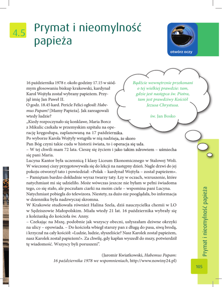 4.5 Prymat i nieomylność papieża 16 października 1978 r. około godziny 17.15 w siódBądźcie wewnętrznie przekonani mym głosowaniu biskup krakowski, kardynał o tej wielkiej prawdzie: tam, Karol Wojtyła został wybrany papieżem. Przygdzie jest następca św. Piotra, jął imię Jan Paweł II. tam jest prawdziwy Kościół O godz. 18.45 kard. Pericle Felici ogłosił: HabeJezusa Chrystusa. mus Papam! [Mamy Papieża]. Jak zareagowali wtedy ludzie? św. Jan Bosko „Kiedy rozpoczynało się konklawe, Maria Borcz z Mikulic czekała w przemyskim szpitalu na operację kręgosłupa, zaplanowaną na 17 października. Po wyborze Karola Wojtyły wstąpiła w nią nadzieja, że skoro Pan Bóg czyni takie cuda w historii świata, to i operacja się uda. – W tej chwili mam 72 lata. Cieszę się życiem i jako takim zdrowiem – uśmiecha się pani Maria. Lucyna Kantor była uczennicą I klasy Liceum Ekonomicznego w Stalowej Woli. W wieczonej ciszy przygotowywała się do lekcji na następny dzień. Nagle drzwi do jej pokoju otworzył tato i powiedział: «Polak – kardynał Wojtyła – został papieżem». – Pamiętam bardzo dokładnie wyraz twarzy taty. Łzy w oczach, wzruszenie, które natychmiast mi się udzieliło. Może wówczas jeszcze nie byłam w pełni świadoma tego, co się stało, ale poczułam ciarki na moim ciele – wspomina pani Lucyna. Natychmiast pobiegła do telewizora. Niestety, za dużo nie pooglądała, bo informacja w dzienniku była nadzwyczaj skromna. W Krakowie studiowała również Halina Szela, dziś nauczycielka chemii w LO w Sędziszowie Małopolskim. Miała wtedy 21 lat. 16 października wybrały się z koleżanką do kościoła św. Anny. – Czekając na Mszę, podobnie jak wszyscy obecni, usłyszałam dziwne okrzyki na ulicy – opowiada. – Do kościoła wbiegł starszy pan z długą do pasa, siwą brodą, i krzyczał na cały kościół: «Ludzie, ludzie, słyszeliście? Nasz Karolek został papieżem, nasz Karolek został papieżem!». Za chwilę, gdy kapłan wyszedł do mszy, potwierdził tę wiadomość. Wszyscy byli poruszeni”. (Jaromir Kwiatkowski, Habemus Papam: 16 października 1978 we wspomnieniach, http://www.nowiny24.pl) Prymat i nieomylność papieża otwórz oczy 105 Co dla Ciebie znaczy fakt, że papież jest widzialnym zastępcą Chrystusa na ziemi, głową Kościoła, którego jesteś częścią? otwórz umysł otwórz uszy W jaki sposób rozumiesz nieomylność papieża? „Papież, Biskup Rzymu i następca św. Piotra, jest trwałym i widzialnym źródłem i fundamentem jedności Kościoła. Jest Zastępcą Chrystusa, Zwierzchnikiem Kolegium Biskupów i Pasterzem całego Kościoła, wobec którego ma, z ustanowienia Bożego, pełną, najwyższą, bezpośrednią i powszechną władzę”. (KKKK 182) Prymat i nieomylność papieża „Nieomylność przysługuje Biskupowi Rzymu, jako najwyższemu pasterzowi i nauczycielowi Kościoła, lub Kolegium Biskupów w łączności z Papieżem, zgromadzonym na soborze powszechnym, gdy ogłaszają definitywnym aktem naukę dotyczącą wiary lub moralności, a także gdy Papież i biskupi, sprawując najwyższy Urząd Nauczycielski, przedkładają do wierzenia prawdy jako objawione przez Boga. Takie orzeczenia każdy wierny powinien przyjąć posłuszeństwem wiary”. (KKKK 185) 106 otwórz serce Boże Wszechmogący, któryś ustanowił Papieża widomą głową Kościoła świętego, otaczaj go zawsze swoją łaską i błogosławieństwem, udziel mu długiego życia, dobrego zdrowia i daj pociechę w cierpieniach. Spraw, aby przyczynił się do pokoju całej rodziny ludzkiej, wszystkich ludów i narodów. Daj także, aby za jego pontyfikatu wszyscy ludzie poczuli się dziećmi Jednego Ojca, a między sobą braćmi, by z powierzchni ziemi zniknęły wojny, a z serc ludzkich nienawiść, która jest ich źródłem. Matko Kościoła, Królowo Pokoju, prosimy Cię, uproś te łaski u Syna Twego, a Pana naszego Jezusa Chrystusa, Który żyje i króluje, przez wszystkie wieki wieków. Amen. „Pewnego razu Ojciec Święty Jan Paweł II siedział w swoim gabinecie i pracował. W jakimś momencie wykręcił numer szpitala w Szwajcarii, gdyż leżał tam jego chory przyjaciel, ks. biskup Andrzej Deskur. Bez trudności uzyskał rozmowę telefoniczną ze szpitalem i wtedy poprosił o połączenie z pokojem, gdzie leżał chory Biskup. Dociekliwa telefonistka zapytała: – A kto mówi? – Papież! – padła lapidarna odpowiedź. Panienka na chwilę zaniemówiła, a potem odpowiedziała rezolutnie: – Z pana taki papież, jak ze mnie cesarzowa chińska! Gdy wszystko wyszło na jaw, chciano ponoć zwolnić z pracy ową urzędniczkę, ale Ojciec Święty natychmiast się za nią wstawił, gdyż – jak sam wyznał – «setnie się ubawił»”. uśmiechnij się Papież – jest widzialną głową Kościoła na ziemi. Twoim zadaniem jest pozostawać w łączności z papieżem oraz całym Kościołem. SMS Prymat i nieomylność papieża (http://borowymlyn.parafia.info.pl) – słowo ma smak 107 słowniczek Dogmat – zasada teologiczna, objęta kanonem wiary, podana przez Kościół do wierzenia jako niewzruszona prawda, nie podlegająca krytyce ani dyskusji; twierdzenie przyjmowane bezkrytycznie za prawdę tylko na podstawie autorytetu, bez względu na zgodność z doświadczeniem i zdrowym rozsądkiem. (http://www.slownik-online.pl/kopalinski) Dogmat o nieomylności papieża – dogmat ogłoszony w roku 1870 na Soborze Watykańskim I w konstytucji dogmatycznej Pastor aeternus (Konstytucja o Kościele Chrystusowym). Dogmat ten odnosi się do tzw. nauczania ex cathedra. Nieomylność papieża należy rozumieć jako bezbłędność w sprawach wiary i obyczajów, nie zaś w sprawach codziennych. (www.szkolnictwo.pl) Ex cathedra [wym. eks katedra] – głosić coś, orzekać autorytatywnie, bezapelacyjnie, w sposób nie dopuszczający dyskusji. (http://www.slownik-online.pl/kopalinski) Prymat i nieomylność