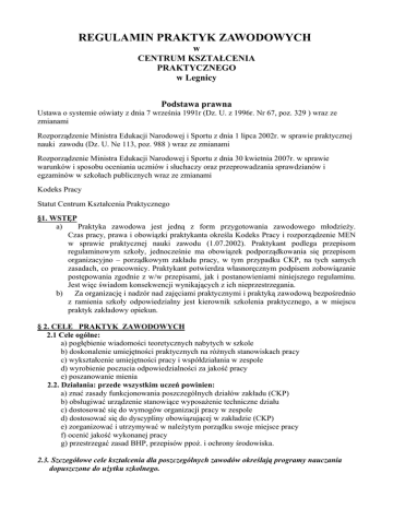 REGULAMIN PRAKTYK ZAWODOWYCH w CENTRUM KSZTAŁCENIA PRAKTYCZNEGO w Legnicy Podstawa prawna Ustawa o systemie oświaty z dnia 7 września 1991r (Dz. U. z 1996r. Nr 67, poz. 329 ) wraz ze zmianami Rozporządzenie Ministra Edukacji Narodowej i Sportu z dnia 1 lipca 2002r. w sprawie praktycznej nauki zawodu (Dz. U. Ne 113, poz. 988 ) wraz ze zmianami Rozporządzenie Ministra Edukacji Narodowej i Sportu z dnia 30 kwietnia 2007r. w sprawie warunków i sposobu oceniania uczniów i słuchaczy oraz przeprowadzania sprawdzianów i egzaminów w szkołach publicznych wraz ze zmianami Kodeks Pracy Statut Centrum Kształcenia Praktycznego §1. WSTĘP a) Praktyka zawodowa jest jedną z form przygotowania zawodowego młodzieży. Czas pracy, prawa i obowiązki praktykanta określa Kodeks Pracy i rozporządzenie MEN w sprawie praktycznej nauki zawodu (1.07.2002). Praktykant podlega przepisom regulaminowym szkoły, jednocześnie ma obowiązek podporządkowania się przepisom organizacyjno – porządkowym zakładu pracy, w tym przypadku CKP, na tych samych zasadach, co pracownicy. Praktykant potwierdza własnoręcznym podpisem zobowiązanie postępowania zgodnie z w/w przepisami, jak i postanowieniami niniejszego regulaminu. Jest więc świadom konsekwencji wynikających z ich nieprzestrzegania. b) Za organizację i nadzór nad zajęciami praktycznymi i praktyką zawodową bezpośrednio z ramienia szkoły odpowiedzialny jest kierownik szkolenia praktycznego, a w miejscu praktyk zakładowy opiekun. § 2. CELE PRAKTYK ZAWODOWYCH 2.1 Cele ogólne: a) pogłębienie wiadomości teoretycznych nabytych w szkole b) doskonalenie umiejętności praktycznych na różnych stanowiskach pracy c) wykształcenie umiejętności pracy i współdziałania w zespole d) wyrobienie poczucia odpowiedzialności za jakość pracy e) poszanowanie mienia 2.2. Działania: przede wszystkim uczeń powinien: a) znać zasady funkcjonowania poszczególnych działów zakładu (CKP) b) obsługiwać urządzenie stanowiące wyposażenie techniczne działu c) dostosować się do wymogów organizacji pracy w zespole d) dostosować się do dyscypliny obowiązującej w zakładzie (CKP) e) zorganizować i utrzymywać w należytym porządku swoje miejsce pracy f) ocenić jakość wykonanej pracy g) przestrzegać zasad BHP, przepisów ppoż. i ochrony środowiska. 2.3. Szczegółowe cele kształcenia dla poszczególnych zawodów określają programy nauczania dopuszczone do użytku szkolnego. § 3. OBOWIĄZKI UCZNIA 3.1. Przygotowanie do praktyki Uczeń ma obowiązek odpowiednio przygotować się do praktyki poprzez: a) zapoznanie się z informacjami przekazanymi przez kierownika szkolenia praktycznego na spotkaniu, które odbywa się nie później niż tydzień przed rozpoczęciem praktyki b) odbycie w wyznaczonym terminie szkolenia BHP w miejscu praktyk c) przygotowanie zeszytu zwanego dalej „dzienniczkiem praktyk” (jeśli nie zapewnia odpowiedniego dzienniczka szkoła). d) wpisanie/wklejenie do dzienniczka praktyk programu, który będzie realizowany podczas praktyki. 3.2. Dyscyplina w czasie odbywania praktyki zawodowej Uczeń ma obowiązek do zachowania dyscypliny, przez co rozumie się: a) właściwą postawę i kulturę osobistą b) właściwy ubiór (patrz: pkt.3.4) c) punktualne rozpoczynanie i kończenie zajęć, przestrzeganie czasu pracy d) dostosowanie się do ustalonego przez zakładowego (CKP) opiekuna, obowiązującego harmonogramu praktyk f) rzetelne wykonywanie zadań powierzonych przez opiekuna g) systematyczne odnotowywanie toku zajęć w dzienniczkach praktyk h) przedkładanie każdego dnia dzienniczka praktyk do kontroli zakładowemu (CKP) opiekunowi praktyk i) uzyskanie pozytywnej oceny wpisanej do dzienniczka praktyk, na podstawie obecności i egzaminu w formie pisemnej j) przekazanie w ustalonym terminie uzupełnionego dzienniczka praktyk wraz z wpisaną oceną do kierownika szkolenia praktycznego dokonującego wpisu w dzienniku lekcyjnym. 3.3. Wygląd Uczeń odbywający praktykę ma obowiązek przestrzegać zasad poprawnego wyglądu przez co rozumie się: a) szczególną dbałość o higienę osobistą b) niedopuszczalna biżuteria (łańcuszki, bransoletki, pierścionki, itp.) dotyczących 3.4. Strój Uczeń technikum powinien zgłosić się na dane stanowisko pracy w odpowiednim stroju, przez co rozumie się: - strój zgodny z wymogami obowiązującymi w danym zakładzie lub wskazany przez zakładowego opiekuna praktyk (CKP) 3.5 Prowadzenie dzienniczka praktyk 1.Uczniowie odbywający praktykę powinni posiadać: a) dzienniczek praktyki b) program praktyki c) standardy wymagań egzaminacyjnych potwierdzających kwalifikacje zawodowe 2. Uczeń zobowiązany jest do prowadzenia dzienniczka praktyk na bieżąco w zakładzie pracy(CKP) oraz przedstawiania go w czasie kontroli, celem sprawdzenia merytorycznego i kompletności ćwiczeń. 3. W ostatnim dniu praktyki dzienniczek należy złożyć u zakładowego opiekuna praktyk w celu wystawienia przez niego opinii o pracy i oceny. 3.6 Nieobecność na zajęciach musi być usprawiedliwiona. Podstawą do usprawiedliwienia nieobecności jest: a) zwolnienie lekarskie wklejone do zeszytu praktyk b) informacja do pracodawcy w pierwszym dniu niestawienia się na praktykę c) informacja do szkoły w pierwszym dniu niestawienia się na praktykę d) dostarczenie do szkoły kserokopii zwolnienia lekarskiego Nieobecność na praktykach zawodowych i zajęciach praktycznych musi być odpracowana w terminie i czasie wskazanym przez pracodawcę w porozumieniu ze szkołą. 3.7 Zaliczenie praktyki 1. Na ocenę końcową z praktyki zawodowej składają się oceny: - zakładowego (CKP) opiekuna praktyki na podstawie przeprowadzonego w ostatnim dniu praktyk egzaminu i sporządzonego z niego protokołu - obecności na praktyce - oceny prowadzenia dzienniczka praktyki. 2. Ocenę ustala opiekun praktyk na podstawie kryteriów określonych w załączniku nr 1 /ocenianie, klasyfikowanie i promowanie z 