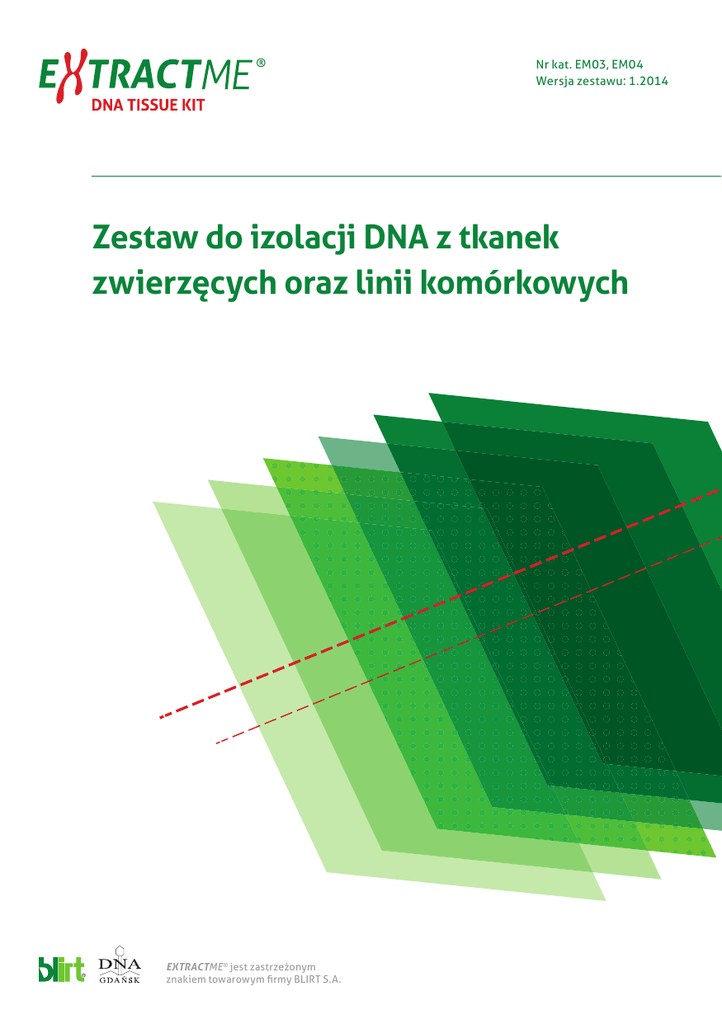 Nr kat. EM03, EM04 Wersja zestawu: 1.2014 Zestaw do izolacji DNA z tkanek zwierzęcych oraz linii komórkowych EXTRACTME® jest zastrzeżonym znakiem towarowym firmy BLIRT S.A. www.dnagdansk.com Nr kat. EM03, EM04 I. PRZEZNACZENIE ZESTAWU Zestaw EXTRACTME DNA TISSUE przeznaczony jest do szybkiej i wydajnej izolacji DNA o wysokiej czystości z tkanek stałych (świeżych, mrożonych, utrwalonych w formalinie lub zatopionych w parafinie), płynów fizjologicznych, włosów, ogonów gryzoni, owadów oraz linii komórkowych. Protokół izolacji i składy buforów zostały zoptymalizowane w celu osiągnięcia zarówno wysokiej wydajności, jak i czystości izolowanego DNA. Produkt przeznaczony jest wyłącznie do zastosowań badawczo–rozwojowych. II. SKŁAD I PRZECHOWYWANIE ZESTAWU LICZBA IZOLACJI 50 IZOLACJI 150 IZOLACJI 250 IZOLACJI 3 IZOLACJE (DEMO) Nr katalogowy EM03–050 EM03–150 EM03–250 EM03–D TL Buffer 20 ml 60 ml 100 ml 1,2 ml 1 szt. 3 szt. 5 szt. 1 szt. 200 µl 600 µl 1 ml 100 µl 1 szt. 3 szt. 5 szt. 1 szt. Proteinase Buffer 1,3 ml 3,9 ml 6,5 ml 200 µl TB Buffer (conc.) 8,8 ml 26,4 ml 44 ml 1,2 ml** TW1 Buffer (conc.)* 20 ml 60 ml 100 ml 2,1 ml** TW2 Buffer (conc.)* 8,2 ml 24,6 ml 41 ml 1,5 ml** Elution Buffer 12 ml 3 x 12 ml 5 x 12 ml 0,8 ml DNA Purification Columns 50 szt. 3 x 50 szt. 5 x 50 szt. 3 szt. Collection Tubes (2 ml) 50 szt. 3 x 50 szt. 5 x 50 szt. 3 szt. Bead-Beating Tubes* 50 szt. 3 x 50 szt. 5 x 50 szt. 3 szt. (Tissue Lysis Buffer) RNase A (lyophilized) RNase Buffer Proteinase K (lyophilized) * (Binding Buffer) (Wash Buffer 1) (Wash Buffer 2) do zestawu EXTRACTME Enzymy RNaza A oraz proteinaza K dostarczane są w postaci liofilizowanej. Każda probówka zawiera odpowiednią ilość enzymu do przeprowadzenia 50 izolacji DNA. Liofilizaty RNazy A i proteinazy K należy przechowywać w temp. +4°C. Przed pierwszym użyciem liofilizat RNazy A należy rozpuścić w 200 µl RNase Buffer (w zestawie DEMO w 100 µl buforu). Roztwór RNazy A należy przechowywać w temp. –20°C! 3 * Odnosi sie wyłącznie DNA TISSUE PLUS. Probówki z kulkami do homogenizacji (Bead-Beating Tubes) posiadają wypełnienie cyramiczne. Liofilizat proteinazy K należy rozpuścić w 1,3 ml Proteinase Buffer (w zestawie DEMO w 200 µl buforu). Roztwór proteinazy K należy przechowywać w temp. –20°C! Pozostałe składniki zestawu należy przechowywać w temp. pokojowej (15–25°C). Wszystkie roztwory z zestawu należy przechowywać szczelnie zamknięte, aby uniknąć zmiany stężeń w wyniku parowania. Odpowiednio przechowywany zestaw zachowuje stabilność przez okres minimum 12 miesięcy. Przed pierwszym użyciem do buforów TB, TW1 i TW2 należy dodać odpowiednią ilość 96–100% etanolu (informacja na etykietach oraz w poniższej tabeli). Po dodaniu etanolu zalecane jest oznaczenie butelki. ** Uwaga: w zestawie DEMO (EM03–D) bufory TB, TW1 i TW2 zawierają już etanol. * LICZBA IZOLACJI 50 IZOLACJI 150 IZOLACJI 250 IZOLACJI Nr katalogowy EM03–050 EM03–150 EM03–250 TB Buffer 8,8 ml 26,4 ml 44 ml Etanol 96–100% 13,2 ml 39,6 ml 66 ml Całkowita objętość 22 ml 66 ml 110 ml TW1 Buffer 20 ml 60 ml 100 ml Etanol 96–100% 20 ml 60 ml 100 ml Całkowita objętość 40 ml 120 ml 200 ml TW2 Buffer 8,2 ml 24,6 ml 41 ml Etanol 96–100% 19,2 ml 57,6 ml 96 ml Całkowita objętość 27,4 ml 82,2 ml 137 ml III. WYMAGANE MATERIAŁY I SPRZĘT www.dnagdansk.com pp pp 96–100% etanol cz.d.a. jałowe probówki wirownicze typu Eppendorf (1,5–2 ml) pp pp pp pp pp pipety automatyczne oraz odpowiednie końcówki do pipet rękawiczki jednorazowe mikrowirówka z rotorem na 1,5–2 ml probówki (>10 tys. rpm) termoblok lub łaźnia wodna (do 70°C) worteks 4 Nr kat. EM03, EM04 Opcjonalnie pp ksylen – bloczki parafinowe pp bufor PBS – linie komórkowe, tkanki w formalinie, płyny fizjologiczne pp pp pp pp pp pp pp pp pp pp przygotowanie: rozpuścić 8 g NaCl, 0,2 g KCl, 1,44 g Na2HPO 4 oraz 0,24 g KH2PO4 w 800 ml H2O. Dodać HCl do pH 7,4. Dopełnić do 1000 ml i autoklawować. Przechowywać w temp. +4°C. 1 M DTT – włosy przygotowanie: 1,54 g DTT rozpuścić w 10 ml H2O. Rozporcjować i przechowywać w temp. -20°C. nożyczki, skalpel probówki z kulkami ceramicznym homogenizator tkankowy na probówki 2 ml homogenizator nożowy termomikser o orbicie ruchu min. 2 mm moździerz z gładkim wylewem (50–75 ml) z dopasowanym pistonem ciekły azot lub suchy lód worteks z przystawką na probówki 2 ml wirówka z rotorem na probówki 10 –15 ml (płyny fizjologiczne, linie komórkowe). IV. ZASADA IZOLACJI Procedura oczyszczania DNA składa się z 5 etapów i jest przeprowadzana z wykorzystaniem minikolumn wirowniczych, zawierających odpowiednie złoże wydajnie i selektywnie wiążące kwasy nukleinowe. Pierwszym etapem jest homogenizacja tkanki, mająca na celu dezintegrację połączeń międzykomórkowych (tkanki nabłonkowe) oraz fragmentację wysokocząsteczkowych białek (tkanka mięśniowa, łączna). Następnie homogenat poddawany jest lizie enzymatycznej z wykorzystaniem zoptymalizowanego buforu TL oraz silnej proteazy (proteinazy K). Na tym etapie degradacji ulegają błony oraz wszystkie białka komórkowe. W przypadku tkanki aktywnej metabolicznie, RNA jest usuwane przy zastosowaniu RNazy A. Po zwirowaniu celem eliminacji niestrawionych resztek tkanki, supernatant zmieszany z solami chaotropowymi nanoszony jest na złoże minikolumny. Dwuetapowe przemywanie DNA związanego do złoża ma na celu usunięcie pozostałych zanieczyszczeń i/lub inhibitorów reakcji enzymatycznych. Oczyszczone DNA eluowane jest z minikolumny buforem o niskiej sile jonowej (Elution Buffer) lub wodą (pH 7,0–9,0) i jest gotowe do bezpośredniego wykorzystania w technikach biologii molekularnej (takich jak PCR, QPCR, Southern blotting, sekwencjonowanie DNA, trawienie enzymami restrykcyjnymi, ligacja DNA itp.) lub może być przechowywane do późniejszego użycia. 5 V. SPECYFIKACJA PRODUKTU MATER