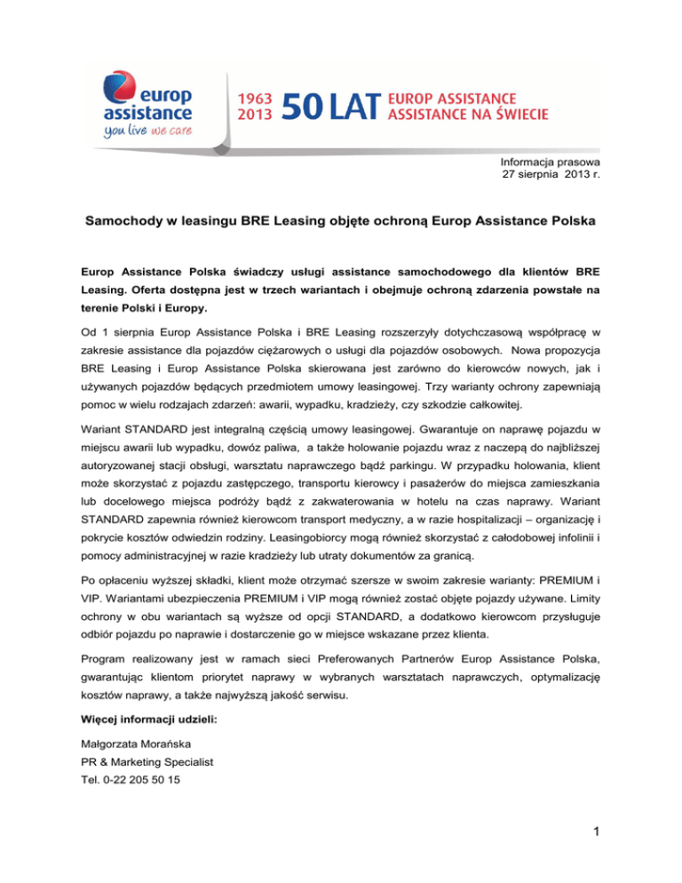 Informacja prasowa 27 sierpnia 2013 r. Samochody w leasingu BRE Leasing objęte ochroną Europ Assistance Polska Europ Assistance Polska świadczy usługi assistance samochodowego dla klientów BRE Leasing. Oferta dostępna jest w trzech wariantach i obejmuje ochroną zdarzenia powstałe na terenie Polski i Europy. Od 1 sierpnia Europ Assistance Polska i BRE Leasing rozszerzyły dotychczasową współpracę w zakresie assistance dla pojazdów ciężarowych o usługi dla pojazdów osobowych. Nowa propozycja BRE Leasing i Europ Assistance Polska skierowana jest zarówno do kierowców nowych, jak i używanych pojazdów będących przedmiotem umowy leasingowej. Trzy warianty ochrony zapewniają pomoc w wielu rodzajach zdarzeń: awarii, wypadku, kradzieży, czy szkodzie całkowitej. Wariant STANDARD jest integralną częścią umowy leasingowej. Gwarantuje on naprawę pojazdu w miejscu awarii lub wypadku, dowóz paliwa, a także holowanie pojazdu wraz z naczepą do najbliższej autoryzowanej stacji obsługi, warsztatu naprawczego bądź parkingu. W przypadku holowania, klient może skorzystać z pojazdu zastępczego, transportu kierowcy i pasażerów do miejsca zamieszkania lub docelowego miejsca podróży bądź z zakwaterowania w hotelu na czas naprawy. Wariant STANDARD zapewnia również kierowcom transport medyczny, a w razie hospitalizacji – organizację i pokrycie kosztów odwiedzin rodziny. Leasingobiorcy mogą również skorzystać z całodobowej infolinii i pomocy administracyjnej w razie kradzieży lub utraty dokumentów za granicą. Po opłaceniu wyższej składki, klient może otrzymać szersze w swoim zakresie warianty: PREMIUM i VIP. Wariantami ubezpieczenia PREMIUM i VIP mogą również zostać objęte pojazdy używane. Limity ochrony w obu wariantach są wyższe od opcji STANDARD, a dodatkowo kierowcom przysługuje odbiór pojazdu po naprawie i dostarczenie go w miejsce wskazane przez klienta. Program realizowany jest w ramach sieci Preferowanych Partnerów Europ Assistance Polska, gwarantując klientom priorytet naprawy w wybranych warsztatach naprawczych, optymalizację kosztów naprawy, a także najwyższą jakość serwisu. Więcej informacji udzieli: Małgorzata Morańska PR & Marketing Specialist Tel. 0-22 205 50 15 1 Informacja prasowa 27 sierpnia 2013 r. E-mail: [email protected] Grupa Europ Assistance, twórca idei assistance i założyciel tej branży na świecie, powstała w 1963 roku. Dziś jest jednym z liderów w zakresie kompleksowych usług assistance - niesienia natychmiastowej pomocy przez 24 godziny na dobę, 7 dni w tygodniu, w każdym miejscu na świecie. Corocznie Grupa Europ Assistance interweniowała w ponad 11 milionach spraw, w 208 krajach na 5 kontynentach. Działalność Grupy Europ Assistance obejmuje szeroko rozumianą pomoc assistance przede wszystkim w czterech dziedzinach: Podróż, Zdrowie, Samochód, Dom i Rodzina. Jednym z priorytetowych obszarów jej wzrostu jest stałe rozszerzanie palety usług z zakresu assistance medycznego, uwzględniających zmieniające się preferencje klientów oraz trendy społecznodemograficzne, wynikające m.in. z postępującej urbanizacji, wzrostu mobilności społeczeństwa oraz rosnącej średniej długości życia. Więcej informacji na temat Europ Assistance można znaleźć na stronach: www.europ-assistance.com www.europ-assistance.pl 2