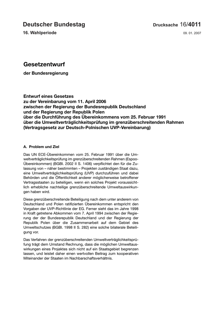Deutscher Bundestag 16. Wahlperiode Drucksache 16/4011 09. 01. 2007 Gesetzentwurf der Bundesregierung Entwurf eines Gesetzes zu der Vereinbarung vom 11. April 2006 zwischen der Regierung der Bundesrepublik Deutschland und der Regierung der Republik Polen über die Durchführung des Übereinkommens vom 25. Februar 1991 über die Umweltverträglichkeitsprüfung im grenzüberschreitenden Rahmen (Vertragsgesetz zur Deutsch-Polnischen UVP-Vereinbarung) A. Problem und Ziel Das UN ECE-Übereinkommen vom 25. Februar 1991 über die Umweltverträglichkeitsprüfung im grenzüberschreitenden Rahmen (EspooÜbereinkommen) (BGBl. 2002 II S. 1406) verpflichtet den für die Zulassung von – näher bestimmten – Projekten zuständigen Staat dazu, eine Umweltverträglichkeitsprüfung (UVP) durchzuführen und dabei Behörden und die Öffentlichkeit anderer möglicherweise betroffener Vertragsstaaten zu beteiligen, wenn ein solches Projekt voraussichtlich erhebliche nachteilige grenzüberschreitende Umweltauswirkungen haben wird. Diese grenzüberschreitende Beteiligung nach dem unter anderem von Deutschland und Polen ratifizierten Übereinkommen entspricht den Vorgaben der UVP-Richtlinie der EG. Ferner sieht das im Jahre 1998 in Kraft getretene Abkommen vom 7. April 1994 zwischen der Regierung der der Bundesrepublik Deutschland und der Regierung der Republik Polen über die Zusammenarbeit auf dem Gebiet des Umweltschutzes (BGBl. 1998 II S. 282) eine solche bilaterale Beteiligung vor. Das Verfahren der grenzüberschreitenden Umweltverträglichkeitsprüfung trägt dem Umstand Rechnung, dass die möglichen Umweltauswirkungen eines Projektes sich nicht auf ein Staatsgebiet begrenzen lassen, und leistet daher einen wertvollen Beitrag zum kooperativen Miteinander der Staaten im Nachbarschaftsverhältnis. Drucksache 16/4011 –2– Deutscher Bundestag – 16. Wahlperiode Zur effektiven Durchführung der grenzüberschreitenden Beteiligung entsprechend den rechtlichen Vorgaben sowie zur sachgerechten Verbindung der Verfahrensschritte in beiden Staaten haben die Bundesregierung und die Regierung der Republik Polen unter Beteiligung der primär betroffenen Bundesländer Brandenburg, Mecklenburg-Vorpommern und Sachsen eine Vereinbarung zur grenzüberschreitenden Umweltverträglichkeitsprüfung (Deutsch-Polnische UVP-Vereinbarung) erarbeitet und am 11. April 2006 in Neuhardenberg abgeschlossen. Die Inhalte dieser Vereinbarung entsprechen der geltenden deutschen Rechtslage. B. Lösung Durch das geplante Vertragsgesetz sollen die verfassungsrechtlichen Voraussetzungen nach Artikel 59 Abs. 2 Satz 1 des Grundgesetzes für die Ratifikation der Deutsch-Polnischen UVP-Vereinbarung herbeigeführt werden. C. Alternativen Keine D. Finanzielle Auswirkungen auf die öffentlichen Haushalte 1. Haushaltsausgaben ohne Vollzugsaufwand Bund, Ländern und Gemeinden entstehen durch die Ratifikation der Deutsch-Polnischen UVP-Vereinbarung keine zusätzlichen Kosten. 2. Vollzugsaufwand Ein erhöhter Verwaltungsaufwand für Bund, Länder und Gemeinden ist durch die Ratifikation der Deutsch-Polnischen UVP-Vereinbarung nicht zu erwarten, da eine entsprechende Beteiligung anderer Staaten bei Umweltverträglichkeitsprüfungen bereits durch das geltende deutsche Recht, durch das Espoo-Übereinkommen, durch die UVP-Richtlinie der EG und durch das bilaterale Umweltschutzabkommen vom 7. April 1994 vorgeschrieben ist. Sofern sich Kosten auf Grund der erforderlichen Übersetzungen von Unterlagen ergeben, sind diese Kosten über Gebühren refinanzierungsfähig bzw. müssen bereits jetzt nach der Verwaltungspraxis im gegenseitigen Verhältnis aufgewendet werden. E. Sonstige Kosten Durch die Deutsch-Polnische UVP-Vereinbarung sind grundsätzlich keine zusätzlichen Kosten für Unternehmen und Wirtschaft und damit Auswirkungen auf das Preisniveau und insbesondere auf die Verbraucherpreise zu erwarten, da eine entsprechende Beteiligung anderer Staaten bei Umweltverträglichkeitsprüfungen bereits durch das geltende deutsche Recht, durch das Espoo-Übereinkommen, durch die UVP-Richtlinie der EG und durch das bilaterale Umweltschutzabkommen vom 7. April 1994 vorgeschrieben ist. Soweit für erforderliche Übersetzungen über Gebührenerhebungen Kosten für private Vorhabenträger entstehen können, entspricht dies bereits der geltenden deutschen Rechtslage und Praxis und dient der Beschleunigung der Verfahren; insgesamt kommt allenfalls ein geringfügiger Mehraufwand im Rahmen der Verfahrenskosten in Betracht. Deutscher Bundestag – 16. Wahlperiode –3– Drucksache 16/4011 Deutscher Bundestag – 16. Wahlperiode –5– Drucksache 16/4011 Entwurf Gesetz zu der Vereinbarung vom 11. April 2006 zwischen der Regierung der Bundesrepublik Deutschland und der Regierung der Republik Polen über die Durchführung des Übereinkommens vom 25. Februar 1991 über die Umweltverträglichkeitsprüfung im grenzüberschreitenden Rahmen (Vertragsgesetz zur Deutsch-Polnischen UVP-Vereinbarung) Vom 2006 Der Bundestag hat mit Zustimmung des Bundesrates das folgende Gesetz beschlossen: Artikel 1 Der in Neuhardenberg am 11. April 2006 unterzeichneten Vereinbarung zwischen der Regierung der Bundesrepublik Deutschland und der Regierung der Republik Polen über die Durchführung des Übereinkommens vom 25. Februar 1991 über die Umweltverträglichkeitsprüfung im grenzüberschreitenden Rahmen (BGBl. 2002 II S. 1406) wird zugestimmt. Die Vereinbarung wird nachstehend veröffentlicht. Artikel 2 (1) Dieses Gesetz tritt am Tage nach seiner Verkündung in Kraft. (2) Der Tag, an dem die Vereinbarung nach ihrem Artikel 15 Abs. 1 in Kraft tritt, ist im Bundesgesetzblatt bekannt zu geben. Drucksache 16/4011 –6– Deutscher Bundestag – 16. Wahlperiode Begründung zum Vertragsgesetz I . A l l g e m e i n e r Te i l Die Vereinbarung zwischen der Regierung der Bundesrepublik Deutschland und der Regierung der Republik Polen über die Durchführung des Übereinkommens vom 25. Februar 1991 übe
