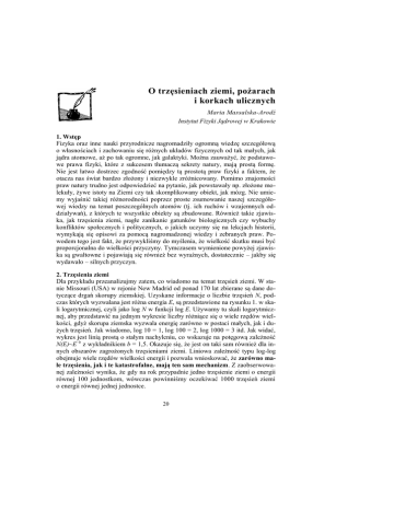 O trzęsieniach ziemi, pożarach i korkach ulicznych Maria Massalska-Arodź Instytut Fizyki Jądrowej w Krakowie 1. Wstęp Fizyka oraz inne nauki przyrodnicze nagromadziły ogromną wiedzę szczegółową o własnościach i zachowaniu się różnych układów fizycznych od tak małych, jak jądra atomowe, aż po tak ogromne, jak galaktyki. Można zauważyć, że podstawowe prawa fizyki, które z sukcesem tłumaczą sekrety natury, mają prostą formę. Nie jest łatwo dostrzec zgodność pomiędzy tą prostotą praw fizyki a faktem, że otacza nas świat bardzo złożony i niezwykle zróżnicowany. Pomimo znajomości praw natury trudno jest odpowiedzieć na pytanie, jak powstawały np. złożone molekuły, żywe istoty na Ziemi czy tak skomplikowany obiekt, jak mózg. Nie umiemy wyjaśnić takiej różnorodności poprzez proste zsumowanie naszej szczegółowej wiedzy na temat poszczególnych atomów (tj. ich ruchów i wzajemnych oddziaływań), z których te wszystkie obiekty są zbudowane. Również takie zjawiska, jak trzęsienia ziemi, nagłe zanikanie gatunków biologicznych czy wybuchy konfliktów społecznych i politycznych, o jakich uczymy się na lekcjach historii, wymykają się opisowi za pomocą nagromadzonej wiedzy i zebranych praw. Powodem tego jest fakt, że przywykliśmy do myślenia, że wielkość skutku musi być proporcjonalna do wielkości przyczyny. Tymczasem wymienione powyżej zjawiska są gwałtowne i pojawiają się również bez wyraźnych, dostatecznie – jakby się wydawało – silnych przyczyn. 2. Trzęsienia ziemi Dla przykładu przeanalizujmy zatem, co wiadomo na temat trzęsień ziemi. W stanie Missouri (USA) w rejonie New Madrid od ponad 170 lat zbierane są dane dotyczące drgań skorupy ziemskiej. Uzyskane informacje o liczbie trzęsień N, podczas których wyzwalana jest różna energia E, są przedstawione na rysunku 1. w skali logarytmicznej, czyli jako log N w funkcji log E. Używamy tu skali logarytmicznej, aby przedstawić na jednym wykresie liczby różniące się o wiele rzędów wielkości, gdyż skorupa ziemska wyzwala energię zarówno w postaci małych, jak i dużych trzęsień. Jak wiadomo, log 10 = 1, log 100 = 2, log 1000 = 3 itd. Jak widać, wykres jest linią prostą o stałym nachyleniu, co wskazuje na potęgową zależność N(E)~E–b z wykładnikiem b = 1,5. Okazuje się, że jest on taki sam również dla innych obszarów zagrożonych trzęsieniami ziemi. Liniowa zależność typu log-log obejmuje wiele rzędów wielkości energii i pozwala wnioskować, że zarówno małe trzęsienia, jak i te katastrofalne, mają ten sam mechanizm. Z zaobserwowanej zależności wynika, że gdy na rok przypadnie jedno trzęsienie ziemi o energii równej 100 jednostkom, wówczas powinniśmy oczekiwać 1000 trzęsień ziemi o energii równej jednej jednostce. 20 Rys. 1. Zależność log N od log E, gdzie N jest liczbą trzęsień ziemi, które wyzwalają energię równą E. Dane pochodzą z obserwacji zbieranych od 170 lat w rejonie New Madrid w stanie Missouri (USA) Oczywiście trzęsienia ziemi występują tam, gdzie płyty tektoniczne naciskają na siebie lub ślizgają się po sobie. Jednak nie ma potrzeby dopatrywania się specjalnych powodów uzasadniających występowanie dużych kataklizmów. Nie ma też jakiegoś typowego, średniego trzęsienia Ziemi. Gdy tak jest, mówimy, że układ charakteryzuje brak skali. To, z jak wielkim zdarzeniem mamy do czynienia, zależy od tego, jaka była wcześniejsza historia całej skorupy ziemskiej, gdyż jej poszczególne elementy silnie na siebie oddziałują. Ziemia jest przykładem układu złożonego, o którym będzie mowa poniżej. 3. Model organizowania się układu złożonego do stanu krytycznego Pokażę teraz najprostszy model, który pozwala prześledzić, jak pod wpływem zaburzenia zachowuje się układ złożony. Spróbujmy przeprowadzić doświadczenie polegające na sypaniu pryzmy piasku na platformie w dobrze zdefiniowany sposób, tj. jedno ziarenko na jednostkę czasu. Początkowo ziarna padają obok siebie, potem powstaje następna warstwa i stopniowo kolejne ziarenka zatrzymują się tam, gdzie upadną, jeżeli tylko uda im się uzyskać stabilne położenie. W przeciwnym razie mogą się ześlizgnąć do innego miejsca albo wywołać lawinę, czyli ześlizgiwanie się sąsiednich ziaren, a te następnych, tworząc hierarchiczny ciąg zdarzeń podobny do reakcji łańcuchowej. Lawinki są niewielkie i stopniowo narasta wysokość i nachylenie pryzmy. Równocześnie część ziarenek ześlizguje się poza platformę. Pomimo dalszego sypania piasku kąt nachylenia i wysokość pryzmy ustalają się. Właśnie od tego momentu każde dodanie nawet jednego ziarnka może wywołać lawinę dowolnej wielkości, gdyż w każdym momencie średnie prawdopodobieństwo tego, że ziarno się zatrzyma, jest takie samo, jak i tego, że zaczną się poruszać kolejne ziarna. A więc o tym, co się zdarzy, decyduje miejsce, do którego spadnie ziarno. To, jaka będzie odpowiedź układu na upadek tego pierwszego ziarna, zależy od całej historii układu. Równocześnie okazuje się, że rozkład wielkości lawin będzie zawsze stały: najwięcej będzie zdarzeń (lawin) małych, ale dopuszczone są również zdarzenia katastrofalne. Wszystko może się zdarzyć pod 21 wpływem jednego spadającego ziarnka. Gdy tak jest, mówimy, że układ organizuje się sam do stanu krytycznego, który charakteryzuje brak określonej skali dla powstających w nim lawin zarówno jeśli chodzi o ich wielkość, jak i czas trwania. Liczba ziaren N uczestniczących w kolejnych lawinach zmienia się w czasie t w sposób przypadkowy, co pokazuje rysunek 2. Rys. 2. Liczba ziaren N, które biorą udział w lawinach wywoływanych, gdy pryzma piasku jest zaburzana Przy modelowaniu trzęsień ziemi za pomocą wielu połączonych sprężynkami bloczków, które ślizgają się po nieruchomej płycie, można zarejestrować pod