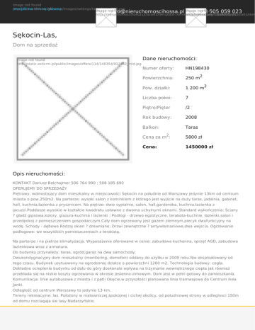 Image not found przejdź na stronę główną http://nieruchomoscihossa.pl/images/settings/logo_hossa300.png Image [email protected] not found Image +48 not found 505 059 023 http://nieruchomoscihossa.pl/assets/template-common/gfx/mail.png?1466025261 http://nieruchomoscihossa.pl/assets/tem Sękocin-Las, Dom na sprzedaż Image not found http://static.esticrm.pl/public/images/offers/114/140354/912462_mid.jpg Dane nieruchomości: Numer oferty: HN198430 Powierzchnia: 250 m Pow. działki: 1 200 m Liczba pokoi: 7 Piętro/Pięter /2 Rok budowy: 2008 Balkon: Taras 2 2 2 Cena za m : 5800 zł Cena: 1450000 zł Opis nieruchomości: KONTAKT Dariusz Bolchajmer 506 764 990 ; 508 185 690 OFERUJEMY DO SPRZEDAŻY Piętrowy, wolnostojący dom mieszkalny w miejscowości Sękocin na południe od Warszawy jedynie 13km od centrum miasta o pow.250m2. Na parterze: wysoki salon z kominkiem z którego jest wyjście na duży taras, jadalnia, gabinet, hall, kuchnia,łazienka z prysznicem. Na piętrze: dwie sypialnie, salon, hall,garderoba, kuchnia,łazienka z jacuzzi.Poddasze wysokie w kształcie kwadratu ustawne z dwoma uchylnymi oknami. Standard wykończenia: Ściany ? gładź gipsowa,kolory, glazura-kuchnia i lazienki ; Podłogi - drzewo egzotyczne, terakota-kuchnie, łazienki,salon i przedpokoj z pomieszczeniem gospodarczym.Cały dom ogrzewany jest gazem ziemnym,piecyk dwufunkcyjny na wodę. Schody - dębowe Rodzaj okien ? drewniane; Drzwi zewnętrzne ? antywłamaniowe,dwa wejscia. Ogrzewanie podłogowe: we wszystkich pomieszczeniach z terakotą. Na parterze i na pietrze klimatyzacja. Wyposażenie oferowane w cenie: zabudowa kuchenna, sprzęt AGD, zabudowa lazienkowa wraz z armatura. Do budynku przynależy: taras, ogród,garaz na dwa samochody. Dwukondygnacyjny dom mieszkalny (monitoring, domofon) oddany do użytku w 2009 roku.Nie eksploatowany od tego czasu. Budynek usytuowany na ogrodzonej działce o powierzchni 1200 m2. Technologia budowy: cegła. Dokładne ocieplenie budynku od dołu do góry doskonale wpływa na trzymanie wewnętrznego ciepła jak również przekłada się na niskie koszty ogrzewania w okresie jesienno-zimowym. Dom jest w pełni gotowy do zamieszkania. Komunikacja: linie autobusowe z miasta i z pętli Okęcie,w przyszłości planowana linia tramwajowa do Centrum Ikea Janki. Odległość od centrum Warszawy to jedynie 13 km. Tereny rekreacyjne: las. Położony w malowniczej,spokojnej i cichej okolicy, od południowej strony w odleglosci 150m od domu rozciagaja sie lasy Nadarzyńskie. Image not found przejdź na stronę główną http://nieruchomoscihossa.pl/images/settings/logo_hossa300.png Image [email protected] not found Image +48 not found 505 059 023 http://nieruchomoscihossa.pl/assets/template-common/gfx/mail.png?1466025261 http://nieruchomoscihossa.pl/assets/tem Punkty usługowe w pobliżu: centrum handlowe Janki w odległości 2,5km o domu. Najbliższy sklep oddalony jest o 500m od domu. W podobnej odległości tzn ok 500m znajduje się przedszkole,szkoła. Przystanki w obie strony są również w odległości ok 600m od domu. Bardzo atrakcyjna nieruchomość w przyzwoitej cenie. POLECAM I ZAPRASZAM DO OGLĄDANIA Oferta prezentowana jest bezpłatnie, w towarzystwie pośrednika, który osobiście dokonał wizyty w oferowanym lokalu i jest w stanie udzielić Państwu rzetelnych informacji na jego temat. Pośrednik w obrocie nieruchomościami licencja nr 693 Dariusz Bolchajmer 508 185 690, 506 764 990 [email protected] NASZA FIRMA ISTNIEJE NA RYNKU OD 1995 roku, zaufaj naszemu doświadczeniu. Image not found Image not found Image not found Image not found http://static.esticrm.pl/public/images/offers/114/140354/912462_mid.jpg http://static.esticrm.pl/public/images/offers/114/140354/912463_mid.jpg http://static.esticrm.pl/public/images/offers/114/140354/912464_mid.jpg http://static.esticrm.pl/public/images/offers/114/14035 Image not found Image not found Image not found Image not found http://static.esticrm.pl/public/images/offers/114/140354/912466_mid.jpg http://static.esticrm.pl/public/images/offers/114/140354/912467_mid.jpg http://static.esticrm.pl/public/images/offers/114/140354/912468_mid.jpg http://static.esticrm.pl/public/images/offers/114/14035 Image not found Image not found Image not found Image not found http://static.esticrm.pl/public/images/offers/114/140354/912470_mid.jpg http://static.esticrm.pl/public/images/offers/114/140354/912471_mid.jpg http://static.esticrm.pl/public/images/offers/114/140354/912472_mid.jpg http://static.esticrm.pl/public/images/offers/114/14035 Image not found Image not found Image not found Image not found http://static.esticrm.pl/public/images/offers/114/140354/912474_mid.jpg http://static.esticrm.pl/public/images/offers/114/140354/912475_mid.jpg http://static.esticrm.pl/public/images/offers/114/140354/912476_mid.jpg http://static.esticrm.pl/public/images/offers/114/14035