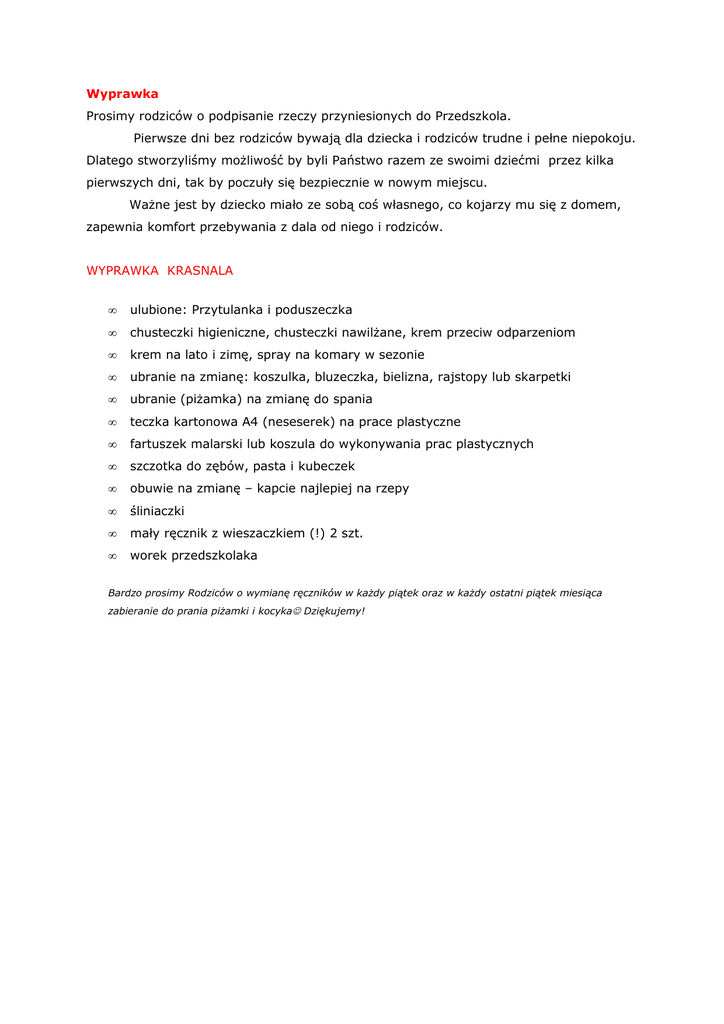 Wyprawka Prosimy rodziców o podpisanie rzeczy przyniesionych do
