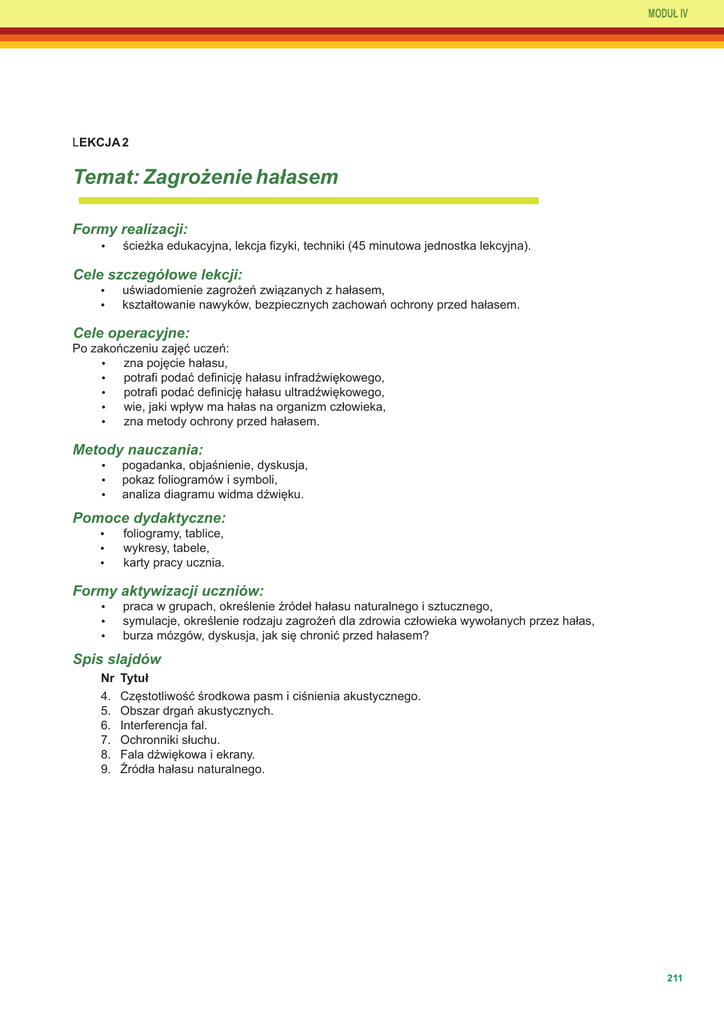 MODUŁ IV LEKCJA 2 Temat: Zagrożenie hałasem Formy realizacji: ? ścieżka edukacyjna, lekcja fizyki, techniki (45 minutowa jednostka lekcyjna). Cele szczegółowe lekcji: ? ? uświadomienie zagrożeń związanych z hałasem, kształtowanie nawyków, bezpiecznych zachowań ochrony przed hałasem. Cele operacyjne: Po zakończeniu zajęć uczeń: zna pojęcie hałasu, ? potrafi podać definicję hałasu infradźwiękowego, ? potrafi podać definicję hałasu ultradźwiękowego, ? wie, jaki wpływ ma hałas na organizm człowieka, ? zna metody ochrony przed hałasem. ? Metody nauczania: ? ? ? pogadanka, objaśnienie, dyskusja, pokaz foliogramów i symboli, analiza diagramu widma dźwięku. Pomoce dydaktyczne: ? ? ? foliogramy, tablice, wykresy, tabele, karty pracy ucznia. Formy aktywizacji uczniów: ? ? ? praca w grupach, określenie źródeł hałasu naturalnego i sztucznego, symulacje, określenie rodzaju zagrożeń dla zdrowia człowieka wywołanych przez hałas, burza mózgów, dyskusja, jak się chronić przed hałasem? Spis slajdów Nr 4. 5. 6. 7. 8. 9. Tytuł Częstotliwość środkowa pasm i ciśnienia akustycznego. Obszar drgań akustycznych. Interferencja fal. Ochronniki słuchu. Fala dźwiękowa i ekrany. Źródła hałasu naturalnego. 211 ZAGROŻENIA ZBIOROWE... PLAN ZAJĘĆ ZE WSKAZÓWKAMI METODYCZNYMI Lp . 1. 2. 3. 4. 5. 6. 7. Czynności Czynności organizacyjne. Zapoznanie z definicjami hałasu, infradźwiękami i ultradźwiękami. Podział źródeł hałasu. „Burza mózgów" na temat źródeł hałasu naturalnego i sztucznego. Uczniowie wymieniają przykłady i zapisują je w karcie pracy. W przypadku różnic wymagany jest komentarz nauczyciela. Prezentacja slajdu nr 9 (źródła hałasu naturalnego). Prezentacja slajdu nr 6, pogadanka nauczyciela na temat interferencji, odbicia i ugięcia fal. Informacja o rozporządzeniu Rady Ministrów w sprawie pracy wzbronionej młodocianym i kobietom w ciąży ze względu na ekspozycję na hałas. Pogadanka nauczyciela na temat ujemnego wpływu hałasu na organizm człowieka. „Burza mózgów" na temat, jak zabezpieczyć się przed hałasem? Uczniowie wymieniają przykłady i zapisują je w karcie pracy. W przypadku różnic wymagany jest komentarz nauczyciela. Prezentacja slajdu nr 7 i 8. Podsumowanie lekcji, zwrócenie szczególnej uwagi na bezpieczne zachowanie. Zadanie pracy domowej - rozwiązanie krzyżówki. Czas 3 min. 5 min. 7 min. 10 min. 7 min. 10 min. 3 min. FORMY AKTYWIZACJI UCZNIÓW: Jakie są źródła hałasu naturalnego i sztucznego? Uczniowie w grupach przygotowują odpowiedzi, wymieniają przykłady i zapisują je w karcie pracy. Źródła hałasu dzielimy na: a) źródła naturalne: wybuchy wulkanów, ? trzęsienia ziemi, ? turbulencje powietrzne i wodne, ? grzmoty, ? gwałtowne wiatry, ? wodospady, ? burze geomagnetyczne, ? załamania fal morskich przy brzegu, ? meteoryty, ? góry lodowe. ? sztuczne (techniczne) b) ruch drogowy (samochody, tramwaje, autobusy itd.), ? pociągi, ? samoloty, ? obiekty przemysłowe (maszyny, silniki, sprężarki), ? urządzenia domowe (pompy, hydrofory, sprzęt AGD itp.), ? odbiorniki radiowe i telewizyjne itp. ? 212 MODUŁ IV MATERIAŁ POMOCNICZY DLA NAUCZYCIELA 1. Hałas Hałasem określa się każdy niepożądany dźwięk, który może być uciążliwy lub szkodliwy dla zdrowia lub zwiększać ryzyko wypadku przy pracy. 2. Drgania akustyczne Drgania akustyczne polegają na ruchu drgającym cząsteczek ośrodka sprężystego względem położenia równowagi. Powstają chwilowe zagęszczenia i rozrzedzenia cząsteczek ośrodka, powodujące lokalne zmiany ciśnienia ośrodka względem ciśnienia statycznego panującego w ośrodku. Rozprzestrzenianie się drgań akustycznych nazywamy falą akustyczną. W gazach i cieczach kierunek drgań cząsteczek ośrodka jest zgodny z kierunkiem rozchodzenia się fali akustycznej (fala podłużna). W ciałach stałych kierunek drgań cząsteczek ośrodka może być równoległy lub prostopadły do kierunku rozchodzenia się fali (fale poprzeczne). Prędkość drgań cząstki ośrodka nazywamy prędkością akustyczną. Ucho człowieka odbiera zmiany ciśnienia ośrodka sprężystego powodowane rozchodzeniem się fal akustycznych o częstotliwości od 20 Hz do 20 kHz. Drgania akustyczne o częstotliwości poniżej 20 Hz nazywane są infradźwiękami, a o częstotliwości powyżej 20 kHz ultradźwiękami. ? Hałas infradźwiękowy to rozprzestrzenianie się w powietrzu infradźwięków o częstotliwości z zakresu 1 do 20 Hz i niskich częstotliwościach słyszalnych. Sztuczne źródła hałasu infradźwiękowego to: - sprężarki tłokowe, - okrętowe silniki wysokoprężne, - lotnicze silniki odrzutowe, - urządzenia ciepłownicze, kotły, kominy, - piece hutnicze, elektryczne piece łukowe, - przemysłowe wentylatory, turbodmuchawy, ssawy, - młyny koksowe i młoty kuźnicze. ? Hałas ultradźwiękowy to rozprzestrzenianie się w powietrzu ultradźwięków o częstotliwościach z zakresu 10 kHz do 40 kHz nie wywołujące wrażenia słuchowego u człowieka. Sztuczne źródła hałasu ultradźwiękowego to: - płuczki, myjki ultradźwiękowe wykorzystujące zjawisko kawitacji akustycznej, - zgrzewarki ultradźwiękowe wykorzystujące zjawisko tarcia, - drążarki ultradźwiękowe do obróbki kwarcu, szkła, kamieni naturalnych, - uboczny czynnik przepływu gazów i mechanicznych prędkości obrotowych. ? Hałas to rozprzestrzenianie się dźwięków o częstotliwościach z zakresu od 20 do 20000 Hz. 3. Ciśnienie akustyczne Jest to różnica między chwilową wartością ciśnienia ośrodka rozchodzącej się fali akustycznej a ciśnieniem statycznym (atmosferycznym) w tym samym punkcie, gdy w ośrodku nie rozprzestrzeniają się drgania akustyczne. 2 Jednostką ciśnienia akustycznego jest Pascal (1Pa = 1N/m ). 4. Natężenie dźwięku Jest to ilość energii akustycznej przepływająca przez jednostkę powierzchni w jednostce czasu. Jednostką