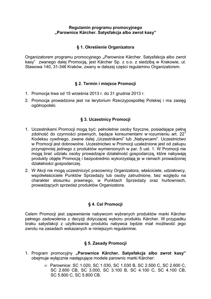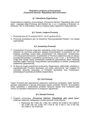 Regulamin programu promocyjnego „Parownice Kärcher. Satysfakcja albo zwrot kasy” § 1. Określenie Organizatora Organizatorem programu promocyjnego „Parownice Kärcher. Satysfakcja albo zwrot kasy” zwanego dalej Promocją, jest Kärcher Sp. z o.o. z siedzibą w Krakowie, ul. Stawowa 140, 31-346 Kraków, zwany w dalszej części regulaminu Organizatorem. § 2. Termin i miejsce Promocji 1. Promocja trwa od 15 września 2013 r. do 31 grudnia 2013 r. 2. Promocja prowadzona jest na terytorium Rzeczypospolitej Polskiej i ma zasięg ogólnopolski. § 3. Uczestnicy Promocji 1. Uczestnikami Promocji mogą być: pełnoletnie osoby fizyczne, posiadające pełną zdolność do czynności prawnych, będące konsumentami w rozumieniu art. 221 Kodeksu cywilnego, zwane dalej „Uczestnikami” lub „Nabywcami”. Uczestnictwo w Promocji jest dobrowolne. Uczestnictwo w Promocji uzaleŜnione jest od zakupu przynajmniej jednego z produktów wymienionych w par. 5 ust. 1. W Promocji nie mogą brać udziału osoby prowadzące działalność gospodarczą, które nabywają produkty objęte Promocją i bezpośrednio wykorzystają je w ramach prowadzonej działalności gospodarczej. 2. W Akcji nie mogą uczestniczyć pracownicy Organizatora, właściciele, udziałowcy, współwłaściciele Punktów SprzedaŜy lub osoby zatrudnione, bez względu na charakter stosunku prawnego, w Punktach SprzedaŜy oraz hurtowniach, prowadzących sprzedaŜ produktów Organizatora. § 4. Cel Promocji Celem Promocji jest zapewnienie nabywcom wybranych produktów marki Kärcher pełnego zadowolenia z decyzji dotyczącej wyboru produktu Kärcher. W przypadku braku satysfakcji z uŜytkowania produktu nabywca będzie miał moŜliwość jego zwrotu na zasadach wskazanych w niniejszym regulaminie. § 5. Zasady Promocji 1. Program promocyjny „Parownice Kärcher. Satysfakcja albo zwrot kasy” obejmuje wyłącznie następujące modele parownic marki Kärcher: • Parownice: SC 1.020, SC 1.030, SC 1.030 B, SC 2.500 C, SC 2.600 C, SC 2.600 CB, SC 3.000, SC 3.100 B, SC 4.100 C, SC 4.100 CB, SC 5.800 C, SC 5.800 CB. 2. Organizator zastrzega sobie prawo do podejmowania innych promocyjnych dotyczących produktów uczestniczących w Promocji. działań 3. Programem objęte są wyłącznie produkty, spełniające łącznie poniŜsze warunki: • produkty nowe, • zakupione w okresie od 15 września 2013 r. do 31 grudnia 2013 r. • zakupione przez Uczestnika Promocji, • nabyte za cenę brutto nie wyŜszą niŜ: Model SC 1.020 SC 1.030 SC 1.030 B SC 2.500 C SC 2.600 C SC 2.600 CB SC 3.000 SC 3.100 B SC 4.100 C SC 4.100 CB SC 5.800 C SC 5.800 CB Nr kat. 1.512-227.0 1.512-280.0 1.512-231.0 1.512-350.0 1.512-360.0 1.512-361.0 1.512-290.0 1.512-390.0 1.512-370.0 1.512-371.0 1.439-130.0 1.439-150.0 Cena brutto 489,00 zł 619,00 zł 799,00 zł 899,00 zł 1 089,00 zł 1 299,00 zł 599,00 zł 996,00 zł 1 199,00 zł 1 402,00 zł 1 499,00 zł 1 699,00 zł • nabyte w punktach sprzedaŜy marki Kärcher terytorium Rzeczypospolitej Polskiej • W przypadku braku satysfakcji z uŜytkowania zakupionego produktu marki Kärcher objętego Promocją, Nabywca moŜe zwrócić zakupiony produkt poprzez przesłanie go na adres: znajdujących się na Kärcher Sp. z o.o. z siedzibą w Krakowie, ul. Stawowa 140, 31-346 Kraków. 4. Zwrot produktów objętych Promocją w ramach niniejszej promocji moŜliwy jest tylko w ciągu 14 dni od daty zakupu, a o zachowaniu terminu do zwrotu produktu decyduje data widniejąca na dowodzie nadania przesyłki. 5. KaŜdy Nabywca moŜe zwrócić produkt objęty promocją tylko jeden raz. Niedozwolony jest ponowny zwrot któregokolwiek produktu objętego promocją przez tego samego Nabywcę. 6. Koszty przesłania produktu ponosi Nabywca. Przesyłki za zaliczeniem pocztowym lub z jakąkolwiek inną formą płatności przerzuconej na adresata nie będą akceptowane. 7. Zwrot produktu jest moŜliwy wyłącznie pod warunkiem równoczesnego spełnienia poniŜszych warunków: a. przesłanie produktu z zachowaniem terminu do zwrotu (punkt 4) i na adres określony w § 5 punkt 3 regulaminu, b. zwracany produkt powinien być czysty, niezniszczony, przesłany w oryginalnym opakowaniu, wraz ze wszystkimi akcesoriami, będącymi na oryginalnie na jego wyposaŜeniu, c. przekazanie wraz z produktem prawidłowo, kompletnie i czytelnie wypełnionej karty gwarancyjnej, która zawiera: numer katalogowy produktu, jego nazwę, datę i miejsce zakupu, pieczęć sklepu oraz podpis sprzedawcy potwierdzającą prawdziwość dokonanego zakupu, d. przekazanie wraz z produktem oryginalnego dowodu zakupu produktu (dowodem zakupu mogą być jedynie paragon lub faktura na osobę fizyczną nie prowadzącą działalności gospodarczej), e. przekazanie wraz z produktem prawidłowo wypełnionego formularza zwrotu (załącznik nr 1 niniejszego regulaminu), który dostępny jest na stronie internetowej www.parownica.pl 8. Organizator zwraca Nabywcy kwotę brutto zakupu produktu znajdującą się na dowodzie zakupu w terminie 28 dni od dnia otrzymania kompletnej przesyłki od Uczestnika Promocji (zawierającej zwracany produkt, oryginalny dowód zakupu, kartę gwarancyjną) w postaci przelewu bankowego na rachunek bankowy wskazany przez Nabywcę. Wysokość zwracanej kwoty brutto zakupu nie moŜe być wyŜsza niŜ cena detaliczna zawarta w cenniku w pkt 3,§ 5. 9. Zwrot ceny zakupu produktu nie obejmuje kosztów towarzyszących związanych z zakupem produktu, takich jak koszty przesyłki, koszty dojazdu do sklepu, koszt przesłania zgłoszenia. 10. Uprawnienie Nabywcy do zwrotu produktu w ramach promocji „Parownice Kärcher. Satysfakcja albo zwrot kasy” nie dotyczy towarów, co do których poziom satysfakcji z ich uŜytkowania został obniŜony ze względu na ich mechaniczne uszkodzenia oraz wady wynikłe na skutek: • niewłaściwego lub niezgodnego z instrukcją uŜytkowania, przechowywania lub konserwacji; • niewłaściwej lub niezgodnej z instrukcją i