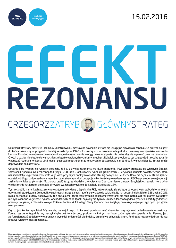 15.02.2016 Od czasu katastrofy mostu w Tacoma, w konstruowaniu mostów na poważnie zwraca się uwagę na zjawisko rezonansu. Co prawda nie jest do końca jasne, czy w przypadku tamtej katastrofy w 1940 roku rzeczywiście rezonans odegrał kluczową rolę, ale zjawisko weszło do kanonu. Podobno w wojsku surowo zabronione jest maszerowanie w nogę przez mosty właśnie po to, aby nie wywołać zjawiska rezonansu. Chodzi o to, aby nie doszło do wzmacniania drgań wywołanych rytmicznym ruchem. Największy problem w tym, że gdy jedna osoba zacznie wzbudzać rezonans w konstrukcji kładki, pozostali przechodnie automatycznie dostosowują się do drgań, wzmacniając je. To zaś może doprowadzić do katastrofy. Ostatnie kilka tygodni na rynkach pokazało, że i tu zjawisko rezonansu ma duże znaczenie. Inwestorzy drepczący po własnych śladach sprowadzili spadki o skali zbliżonej do kryzysu 2008 roku, rozbujawszy rynek do granic krachu. Oczywiście musiała powstać teoria, która uzasadniałaby wyprzedaż. Powstało więc kilka, przy czym finalnym akordem stał się pomysł, ze Deutsche Bank nie będzie w stanie spłacić odsetek od długu podporządkowanego. Zaiste, ekstrawagancka koncepcja w kontekście prowadzenia przez EBC bezprecedensowej operacji zasilania rynków w płynność. Można postawić tezę, że chodziło o wypłacalność w rozumieniu Umowy Bazylejskiej. Jednak i tu trudno wróżyć rychłą katastrofę, bo relacja aktywów ważonych ryzykiem do kapitału przekracza 13%. Tym co zrobiło na rynkach pozytywne wrażenie były dane o japońskim PKB, które okazały się słabsze od oczekiwań. Wzbudziło to wielki optymizm i oczekiwania, że trzeci kwartał recesji z rzędu zmusi japońskie władze do działania. Na ich poczet indeks Nikkei 225 zyskał 7,2%. Rynki Zachodniej Europy podchwyciły ten entuzjazm i rozpoczęły tydzień solidnymi wzrostami. Na razie natomiast tak dużych wzrostów nie było widać na większości rynków wschodzących, choć spadki pojawiły się tylko w Chinach. Można to jednak zrzucić na karb tygodniowej przerwy związanej z chińskim Nowym Rokiem. Ponieważ 15 lutego Stany Zjednoczone świętują, na reakcje największego rynku przyjdzie nam poczekać. Czy to już koniec spadków? Wydaje się, że najbliższych kilka sesji powinno mieć charakter przynajmniej umiarkowanie wzrostowy. Koniec zeszłego tygodnia wyznaczył chyba już twarde dno, poziom na którym na inwestorów spłynęło opamiętanie. Pewne, jest że funkcjonować będziemy w warunkach wysokiej zmienności, ale indeksy stopniowo odzyskają grunt. Po drodze możemy jednak nie raz przeżyć rynkowy efekt rezonansu. Niniejszy dokument jest jedynie materiałem informacyjnym do użytku odbiorcy. Nie powinien być rozumiany jako materiał o charakterze doradczym lub jako podstawa do podejmowania decyzji inwestycyjnych. Nie powinien też być rozumiany jako rekomendacja inwestycyjna. Wszystkie opinie i prognozy przedstawione w tym opracowaniu są jedynie wyrazem opinii autorów w dniu publikacji i mogą ulec zmianie bez zapowiedzi. Skarbiec TFI SA nie ponosi odpowiedzialności za jakiekolwiek decyzje inwestycyjne podjęte na podstawie niniejszego opracowania. Wymagane prawem informacje dotyczące subfunduszy, w tym o czynnikach ryzyka inwestycyjnego znajdują się w prospekcie informacyjnym SKARBIEC FIO i Kluczowych Informacjach dla Klientów, dostępnych w siedzibie SKARBIEC TFI SA w serwisie skarbiec.pl i w sieci sprzedaży. Subfundusze nie gwarantują osiągnięcia określonego celu i wyniku inwestycyjnego, a uczestnik ponosi ryzyko utraty części wpłaconych środków.