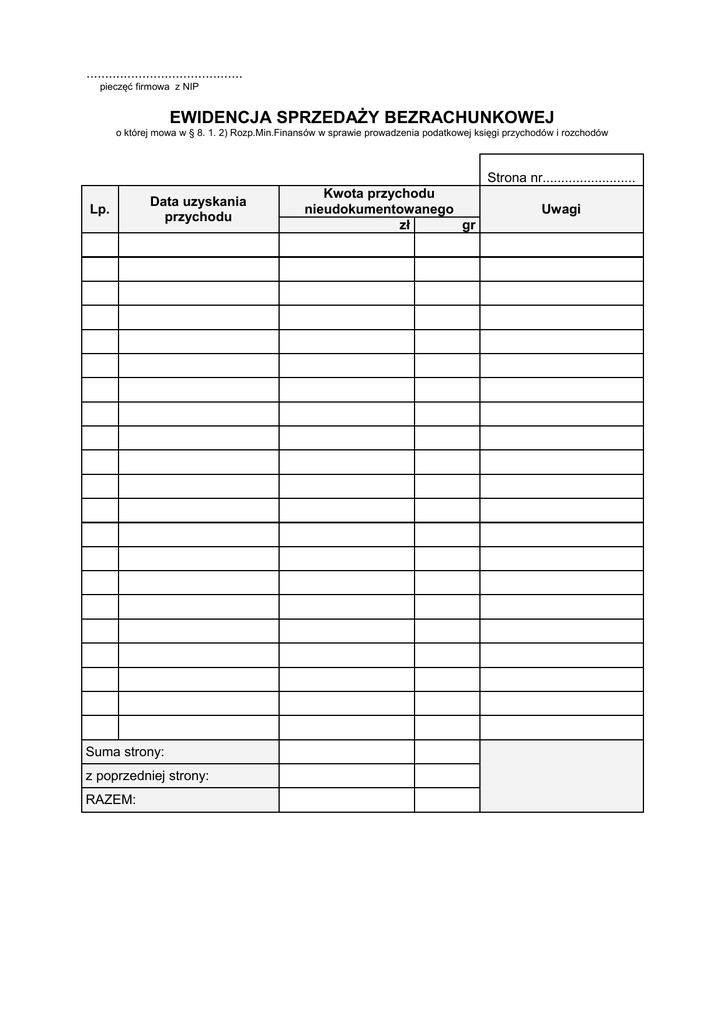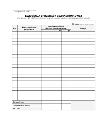 .......................................... pieczęć firmowa z NIP EWIDENCJA SPRZEDAŻY BEZRACHUNKOWEJ o której mowa w § 8. 1. 2) Rozp.Min.Finansów w sprawie prowadzenia podatkowej księgi przychodów i rozchodów Strona nr......................... Lp. Data uzyskania przychodu Suma strony: z poprzedniej strony: RAZEM: Kwota przychodu nieudokumentowanego zł gr Uwagi