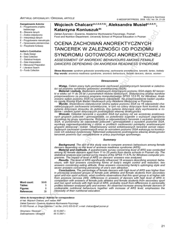 Medycyna Sportowa © MEDSPORTPRESS, 2008; 1(6); Vol. 24, 21-29 tio np roh ibit Zak³ad ¯ywnoœci i ¯ywienia, Akademia Wychowania Fizycznego, Poznañ Food and Nutrition Department, University School of Physical Education in Poznan OCENA ZACHOWAÑ ANOREKTYCZNYCH TANCEREK W ZALE¯NOŒCI OD POZIOMU SYNDROMU GOTOWOŒCI ANOREKTYCZNEJ Author’s Contribution A – Study Design B – Data Collection C – Statistical Analysis D – Data Interpretation E – Manuscript Preparation F – Literature Search G – Funds Collection ASSESSMENT OF ANOREXIC BEHAVIOURS AMONG FEMALE DANCERS DEPENDING ON ANOREXIA READINESS SYNDROME S³owa kluczowe: syndrom gotowoœci anorektycznej, zachowania anorektyczne, tancerki, taniec, kobiety Key words: anorexia readiness syndrome, anorexic behaviours, female dancers, dance, women ibu Streszczenie al us This copy is for personal use only - distribution prohibited. - eo nly -d istr Wstêp. Celem pracy by³o porównanie zachowañ anorektycznych tancerek w zale¿noœci od poziomu syndromu gotowoœci anorektycznej (SGA). Materia³ i metody. Badaniami ankietowymi dotycz¹cymi poziomu SGA objêto 92 tancerki w wieku od 11 do 25 lat z poznañskich klubów tanecznych. Statystyczn¹ analizê wyników przeprowadzono za pomoc¹ programu komputerowego SPSS 12,0 PL for Windows. Analizowano wp³yw poziomu SGA na uzyskane odpowiedzi. Na przeprowadzenie badañ uzyskano zgodê Komisji Etyki Badañ Naukowych przy Akademii Medycznej w Poznaniu. Wyniki. Stwierdzono statystycznie istotny wp³yw poziomu SGA na 16 odpowiedzi charakteryzuj¹cych zachowania anorektyczne, w tym na cztery dotycz¹ce form kontroli, dwa pytania dotycz¹ce stosunku do jedzenia, trzy pytania dotycz¹ce stylu wychowania w rodzinie i siedem pytañ dotycz¹cych postrzegania w³asnej atrakcyjnoœci. Wnioski. Odsetek tancerek o wysokim SGA by³ wy¿szy ni¿ we wczeœniej analizowanych grupach judoczek i gimnazjalistek, co potwierdza sugestie o wy¿szym zagro¿eniu anoreksj¹ tej grupy sportowców. Ró¿nice w odpowiedziach tancerek o wysokim poziomie SGA, w porównaniu do odpowiedzi judoczek i gimnazjalistek o wysokim poziomie SGA, wynikaj¹ najprawdopodobniej z ró¿nic w profilach osobowoœci pomiêdzy analizowanymi grupami dziewcz¹t i kobiet. Obserwowany wœród ankietowanych tancerek wzrost niepo¿¹danych zachowañ ¿ywieniowych wraz ze wzrostem poziomu SGA wskazuj¹ na koniecznoœæ ich edukacji ¿ywieniowej. Natomiast polepszenie postrzegania w³asnej atrakcyjnoœci tancerek powinno byæ uwzglêdnione w pracy psychologa sportowego. Summary 5649 5 0 39 op Word count: Tables: Figures: References: y is - for pe rs on Background. The aim of this study was to compare anorexic behaviours among female dancers depending on the level of anorexia readiness syndrome (ARS). Material and methods. A questionnaire survey concerning level of ARS was conducted among 92 female dancers aged from 11 to 25 years from dance schools in Poznañ city. The statistical analysis was carried out by means of the SPSS 11.5 PL for Windows computer programme. The impact of level of ARS on dancers' answers was analysed. Results. The level of ARS significantly influenced 16 answers describing anorexic behaviours, with four answers concerning forms of body's weight control and reduction, two answers concerning eating attitude, three answers concerning family's upbringing style and seven answers concerning perceiving of one's own attraction. Conclusions. The percentage of female dancers with high level of ARS was higher than in previously analysed groups of female judo athletes and female students from secondary sport and non sport schools, what confirms observations that this sport group is at higher risk from anorexia nervosa (AN). Differences in answers of dancers with high level of ARS in comparison with answers of female judo athletes and female students from secondary sport and non sport schools with high level of ARS, probably result from differences in personality profiles between analysed girls and women. An observed increase among female dancers of undesirable nutritional behaviours together with increase of ARS level, emphasizes the necessity of their nutritional education. Th is c Adres do korespondencji / Address for correspondence dr hab. Wojciech Chalcarz, prof. nadzw. AWF Zak³ad ¯ywnoœci i ¯ywienia, Akademia Wychowania Fizycznego 61-555 Poznañ, ul. Droga Dêbiñska 7, tel./fax: (0-61) 835-52-87, e-mail: [email protected] Otrzymano / Received Zaakceptowano / Accepted 02.10.2007 r. 05.12.2007 r. - This copy is for personal use only - distribution prohibited. ed . Wojciech Chalcarz(A,C,D,E,F,G), Aleksandra Musie³(C,D,E,F), Katarzyna Koniuszuk(B) Zaanga¿owanie Autorów A – Przygotowanie projektu badawczego B – Zbieranie danych C – Analiza statystyczna D – Interpretacja danych E – Przygotowanie manuskryptu F – Opracowanie piœmiennictwa G – Pozyskanie funduszy This copy is for personal use only - distribution prohibited. - This copy is for personal use only - distribution prohibited. - ARTYKU£ ORYGINALNY / ORIGINAL ARTICLE 21 Background Prowadzone przez lata badania na tancerzach i tancerkach wskazuj¹ na zwiêkszon¹ wœród nich sk³onnoœæ do wystêpowania zaburzeñ od¿ywiania siê w porównaniu do populacji ogólnej. Wiêkszoœæ dotychczasowych badañ skupia³a siê na objawach charakterystycznych dla anoreksji [1,2, 3]. Tylko kilka badañ dokumentowa³o bulimiê [2,4,5] poœród tancerzy baletowych, a bardzo ma³o wiadomo jest na temat rozpowszechnienia zaburzeñ od¿ywiania wœród tancerzy [2,4,6]. Silniejsze zachowania anorektyczne obserwowane s¹ czêœciej wœród tancerek ni¿ tancerzy oraz wœród profesjonalnych tancerzy ni¿ osób tañcz¹cych amatorsko [1,7,8]. Poza tym nie zanotowano przypadków anoreksji ani bulimii wœród czarnoskórych tancerzy [7,9]. U baletnic cierpi¹cych na anoreksjê stan zdrowia czêsto wydaje siê poprawiaæ [10,11], nawet bez medycznej interwencji, mimo ¿e upoœledz