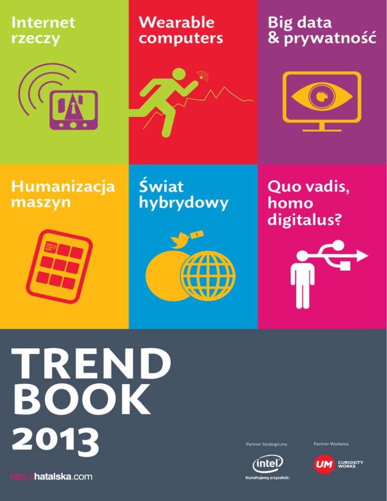 Internet rzeczy Wearable computers Big data & prywatność Kiedy firmy wiedzą o nas więcej niż my sami, czyli big data i prywatność W przypadku tzw. big data nie chodzi tylko o ogrom informacji, które generujemy. Bardziej istotne są dwie inne kwestie. Pierwsza – że marketerzy mają do dyspozycji tzw. nieustrukturyzowane dane. Druga – że konsumenci mają świadomość postępującej utraty prywatności. Humanizacja maszyn Świat hybrydowy Trend book 2013 1 Quo vadis, homo digitalus? Partner Strategiczny Partner Wydania Trendbook 2013 Chciałabym gorąco podziękować Intel Polska, Partnerowi Strategicznemu TrendBooka 2013, za fantastyczną, niezwykle merytoryczną i owocną współpracę. To dzięki tej współpracy miałam możliwość być w styczniu na International CES, na którym zresztą wykluł się w mojej głowie ostateczny kształt tegorocznego TrendBooka. Intel wspierał mnie również swoją wiedzą, raportami i danymi we wszystkich obszarach, o których piszę w tym roku. Nie ma co ukrywać, mówiąc o internecie rzeczy, inteligentnym świecie, humanizacji urządzeń – nie można mieć bardziej kompetentnego partnera niż technologicznego lidera tego typu rozwiązań. Gorąco dziękuję polskiemu oddziałowi Universal McCann, Partnerowi Wydania, za pomoc i merytoryczne wsparcie we wszystkich tych obszarach, w których rozwiązania technologiczne przekładam na rozwiązania marketingowe. Dziękuję również wszystkim ekspertom komentującym trendy w tegorocznym TrendBooku – za poświęcony czas oraz chęć dzielenia się swoim doświadczeniem i wiedzą. 2 Trendbook 2013 Wstęp Zastanawiałam się ostatnio, jak to się stało, że tak dużo miejsca poświęcam nowym technologiom. Przecież główny obszar moich zainteresowań to wciąż niestandardowa reklama, szeroko pojęta komunikacja marketingowa i nowe trendy. Zdziwiło mnie bowiem, kiedy w marcowym Pressie, Piotr Stasiak, odpowiadający w Ringier Axel Springer Polska za rozwój Newsweek.pl oraz Forbes.pl, wymienił mojego bloga (obok m.in. Antyweba i Spider’s Weba) jako tego, z którego dowiaduje się o nowych technologiach. W styczniu tego roku, dzięki współpracy z Intel Polska (Partnerem Strategicznym TrendBooka 2013), pojechałam też na International CES – największe na świecie targi poświęcone nowym technologiom. Od dwóch lat śledziłam, co dzieje się na tej imprezie, w swoich wystąpieniach i wpisach na blogu wielokrotnie nawiązywałam do informacji stamtąd, a i tak miałam wątpliwości, czy jest to wydarzenie dla mnie. Wątpliwości te okazały się jednak zupełnie niepotrzebne, bo jako przedstawicielka branży mediowo-reklamowej nie byłam na CES sama. W Vegas pojawiły się największe agencje reklamowe, domy mediowe i same media. I właśnie w Vegas urodził się pierwszy kształt tegorocznego TrendBooka. Jeśli do tego, co napisałam powyżej, dołożyć prognozę Gartnera, według której do 2017 roku dyrektor marketingu ma wydawać na rozwiązania IT więcej pieniędzy niż dyrektor IT, wszystko układa się w spójną całość. Współczesny marketing zdecydowanie się zmienił. Jego przyszłość nierozerwalnie wiąże się z najnowszymi osiągnięciami technicznymi i – bardziej niż tego chcielibyśmy – analizą danych, zwłaszcza tych niestrukturyzowanych. Agencje reklamowe, także w Polsce, 3 stawiają na kompetencje związane z rozwijaniem i wdrażaniem nowych technologii. Coraz głośniej bowiem mówi się o tym, że w teamie odpowiedzialnym za kampanie, oprócz kreatywnego i copywritera, równie istotny jest informatyk. Nic Według Gartnera więc dziwnego, że ja sama – do 2017 roku dyrektor pisząc o niestandardowych marketingu ma wydakampaniach, odwołuję się wać na rozwiązania IT do nowych technologii i że nowym technologiom więcej pieniędzy niż właśnie poświęcony jest dyrektor IT. w całości TrendBook 2013. W tym roku w TrendBooku trendów tradycyjnie jest pięć, ale po raz pierwszy wszystkie krążą wokół jednego tematu – internetu. I to nie takiego, który znamy z kabla czy urządzenia mobilnego, ale – wszechobecnego. Głęboko wierzę bowiem, że mając do czynienia z trzecią falą internetu – tzw. internetem rzeczy – coraz szybciej zbliżamy się do ery post-mobile. Z tego powodu hasłem przewodnim tegorocznego TrendBooka jest zdanie, które padło podczas jednego z paneli na tegorocznym CES: Stop talking about smartphones and start talking about the connected world. Dobrej lektury i wielu inspiracji. Natalia Hatalska Gdańsk, kwiecień 2013 Trendbook 2013 Co się sprawdziło z prognoz na 2012 rok? 4 Trendbook 2013 Co się sprawdziło z prognoz na 2012 rok? Social media clutter Nie da się ukryć, w 2012 roku w Polsce i na świecie social media przestały kojarzyć się wyłącznie z Facebookiem. Według czerwcowego raportu comscore Pinterest był w ubiegłym roku najszybciej rosnącym serwisem społecznościowym (przyrost YoY +4000% - por. wykres 1). Na fali wznoszącej był także Instagram, który w pierwszej połowie roku Facebook kupił za milliard dolarów. Sporo mówiło się też o Google +, który według grudniowych danych Global Web Index Google+ jest obecnie drugim najpopularniejszym globalnie serwisem społecznościowym. Na Zachodzie coraz głośniej mówi się o tym, że młodzi internauci znudzeni są Facebookiem, obecnie na topie jest Instagram Wykres 1 Liczba użytkowników Pinteresta (w tysiącach) w okresie marzec 2011-maj 2012. Pinterest był w ubiegłym roku najszybciej rosnącym serwisem społecznościowym. Źródło: Comscore, czerwiec 2012 5 Trendbook 2013 Co się sprawdziło z prognoz na 2012 rok? Wykres 2 Użytkowanie Twittera w Polsce wyraźnie zaczyna rosnąć. Źródło: Wave 6: Biznes w społecznościach, Universal McCann, listopad 2012 Myśląc o korzystaniu z internetu, które z tych rzeczy kiedykolwiek robiłeś(-aś)? zacząłem/ zaczęłam pisać bloga wrzucałem(-am) zdjęcia do serwisu, kt