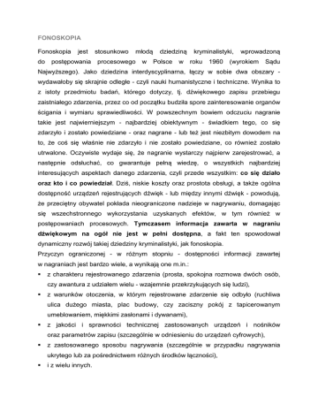 FONOSKOPIA Fonoskopia do jest postępowania stosunkowo młodą procesowego dziedziną w Polsce kryminalistyki, w roku 1960 wprowadzoną (wyrokiem Sądu Najwyższego). Jako dziedzina interdyscyplinarna, łączy w sobie dwa obszary wydawałoby się skrajnie odległe - czyli nauki humanistyczne i techniczne. Wynika to z istoty przedmiotu badań, którego dotyczy, tj. dźwiękowego zapisu przebiegu zaistniałego zdarzenia, przez co od początku budziła spore zainteresowanie organów ścigania i wymiaru sprawiedliwości. W powszechnym bowiem odczuciu nagranie takie jest najwierniejszym - najbardziej obiektywnym - świadkiem tego, co się zdarzyło i zostało powiedziane - oraz nagrane - lub też jest niezbitym dowodem na to, że coś się właśnie nie zdarzyło i nie zostało powiedziane, co również zostało utrwalone. Oczywiste wydaje się, że nagranie wystarczy najpierw zarejestrować, a następnie odsłuchać, co gwarantuje pełną wiedzę, o wszystkich najbardziej interesujących aspektach danego zdarzenia, czyli przede wszystkim: co się działo oraz kto i co powiedział. Dziś, niskie koszty oraz prostota obsługi, a także ogólna dostępność urządzeń rejestrujących dźwięk - lub między innymi dźwięk - powodują, że przeciętny obywatel pokłada nieograniczone nadzieje w nagrywaniu, domagając się wszechstronnego wykorzystania uzyskanych efektów, w tym również w postępowaniach procesowych. Tymczasem informacja zawarta w nagraniu dźwiękowym na ogół nie jest w pełni dostępna, a fakt ten spowodował dynamiczny rozwój takiej dziedziny kryminalistyki, jak fonoskopia. Przyczyn ograniczonej - w różnym stopniu - dostępności informacji zawartej w nagraniach jest bardzo wiele, a wynikają one m.in.: z charakteru rejestrowanego zdarzenia (prosta, spokojna rozmowa dwóch osób, czy awantura z udziałem wielu - wzajemnie przekrzykujących się ludzi), z warunków otoczenia, w którym rejestrowane zdarzenie się odbyło (ruchliwa ulica dużego miasta, plac budowy, czy zaciszny pokój z tapicerowanym umeblowaniem, miękkimi zasłonami i dywanami), z jakości i sprawności technicznej zastosowanych urządzeń i nośników oraz parametrów zapisu (szczególnie w odniesieniu do urządzeń cyfrowych), z zastosowanego sposobu nagrywania (szczególnie w przypadku nagrywania ukrytego lub za pośrednictwem różnych środków łączności), i z wielu innych. Należy również mieć świadomość, że ogromną rolę odgrywa także wiele czynników związanych z osobami nagrywanymi oraz słuchaczami. Wobec powyższych trudności, rozwiązaniem jest przedsięwzięcie takich działań, które są w stanie zwiększyć dostępność informacji zawartej w nagraniach, przy równoczesnej eliminacji błędów tego działania. Jak wykazuje kilkudziesięcioletnia praktyka, już w przypadku ograniczeń na poziomie średnim, w tym celu konieczne jest zaangażowanie osób o szczególnych cechach słuchu, właściwej wiedzy i doświadczeniu zawodowym, dysponujących odpowiednim zapleczem technicznym i lokalowym. Tylko tak kompleksowe potraktowanie tematu pozwoli osiągnąć pożądany efekt. Dysponując takim potencjałem przede wszystkim można liczyć na: spisanie treści utrwalonych wypowiedzi, w maksymalnym, dającym się ustalić zakresie, wraz z przyporządkowaniem każdej wypowiedzi konkretnemu mówcy, ustalenie, jaka jest liczba wypowiadających się osób, ustalenie, jaki jest stan emocjonalny wypowiadających się osób, ustalenie, czy wypowiedzi konkretnego mówcy są wypowiedziami osoby wskazanej do badań, scharakteryzowanie miejsca, w którym odbywało się nagrane zdarzenie, czy nagranie poddawane było montażowi i innym podobnym zabiegom (w przypadku nagrań analogowych), i wiele innych ustaleń. Nie każda sprawa wymaga tak rozległych badań, co dobrze jest brać pod uwagę, decydując o zakresie ewentualnie zlecanych badań. Warto w tym momencie skorzystać z pomocy doświadczonego biegłego, który po zapoznaniu się ze specyfiką sprawy, może właściwie ukierunkować i zaproponować najbardziej optymalne spektrum badań. Poniżej przykładowe polecenia: Spisanie treści dowodowej rozmowy. Ustalenie, czy wszystkie dowodowe rozmowy przeprowadził jeden, ten sam mężczyzna. Ustalenie liczby osób biorących udział w dowodowych rozmowach. Określenie/scharakteryzowanie miejsca przeprowadzenia dowodowej rozmowy. Ustalenie, czy w dowodowej rozmowie brał udział Jan Kowalski. Ustalenie, czy dowodowe nagranie jest nagraniem autentycznym. (tylko w przypadku nagrań analogowych utrwalonych na taśmach magnetofonowych) - (w celu ustalenia, czy dowodowe nagranie magnetofonowe nie powstało w wyniku montażu) Ustalenie, czy dowodowe nagranie jest nagraniem oryginalnym. (tylko w przypadku nagrań analogowych utrwalonych na taśmach magnetofonowych) (w celu ustalenia, czy dowodowe nagranie magnetofonowe jest nagraniem pierwszym, utrwalonym w trakcie trwania zdarzenia) Ustalenie, czy nagranie zarejestrowane na taśmie kasetowej jest kopią dowodowego nagrania zarejestrowanego na taśmie mikrokasetowej. oraz wykaz często zlecanych czynności: Wykonanie kopii dowodowego nagrania: − w celu zmiany nośnika lub w celu zabezpieczenia przed utratą zapisu (np. pamięci telefonów, faksów, nietypowych urządzeń rejestrujących, niektórych typów tzw. dyktafonów cyfrowych itp.): Wykonanie kopii dowodowego nagrania na inną taśmę kasetową / płytę CD/ itp. − w celu zmiany formatu (w przypadku nagrań cyfrowych): Wykonanie kopii dowodowego nagrania na płytę CD-R, w formacie możliwym do odtworzenia przez oprogramowanie komputerowe powszechnego użytku. Pobieranie materiału porównawczego do indywidualnych badań identyfikacyjnych osób.