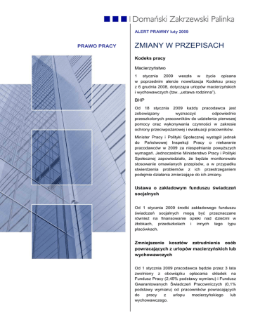 ALERT PRAWNY luty 2009 PRAWO PRACY ZMIANY W PRZEPISACH Kodeks pracy Macierzyństwo 1 stycznia 2009 weszła w Ŝycie opisana w poprzednim alercie nowelizacja Kodeksu pracy z 6 grudnia 2008, dotycząca urlopów macierzyńskich i wychowawczych (tzw. „ustawa rodzinna”). BHP Od 18 stycznia 2009 kaŜdy pracodawca jest zobowiązany wyznaczyć odpowiednio przeszkolonych pracowników do udzielenia pierwszej pomocy oraz wykonywania czynności w zakresie ochrony przeciwpoŜarowej i ewakuacji pracowników. Minister Pracy i Polityki Społecznej wystąpił jednak do Państwowej Inspekcji Pracy o niekaranie pracodawców w 2009 za niespełnianie powyŜszych wymagań. Jednocześnie Ministerstwo Pracy i Polityki Społecznej zapowiedziało, Ŝe będzie monitorowało stosowanie omawianych przepisów, a w przypadku stwierdzenia problemów z ich przestrzeganiem podejmie działania zmierzające do ich zmiany. Ustawa o zakładowym funduszu świadczeń socjalnych Od 1 stycznia 2009 środki zakładowego funduszu świadczeń socjalnych mogą być przeznaczane równieŜ na finansowanie opieki nad dziećmi w Ŝłobkach, przedszkolach i innych tego typu placówkach. Zmniejszenie kosztów zatrudnienia osób powracających z urlopów macierzyńskich lub wychowawczych Od 1 stycznia 2009 pracodawca będzie przez 3 lata zwolniony z obowiązku opłacania składek na Fundusz Pracy (2,45% podstawy wymiaru) i Fundusz Gwarantowanych Świadczeń Pracowniczych (0,1% podstawy wymiaru) od pracowników powracających do pracy z urlopu macierzyńskiego lub wychowawczego. MoŜliwość przechowywania nośnikach elektronicznych list płac na 1 stycznia 2009 weszła w Ŝycie nowelizacja ustawy o rachunkowości, zgodnie z którą przedsiębiorcy prowadzący księgi rachunkowe mogą, po zatwierdzeniu sprawozdania finansowego za poprzedni rok, zapisać listy płac na nośnikach elektronicznych. Warunkiem stosowania tej metody przechowywania danych jest posiadanie urządzeń pozwalających na odtworzenie list płac w postaci wydruku. Nowe zasady udzielania zezwoleń na pracę 1 lutego 2009 zmieniły się przepisy dotyczące legalizacji zatrudnienia cudzoziemców w Polsce. NajwaŜniejsza zmiana polega na uproszczeniu i skróceniu procedury ubiegania się o zezwolenie na pracę w Polsce poprzez ograniczenie wymaganych przy wniosku dokumentów, skrócenie okresu oczekiwania na opinię starosty i rezygnacja z wymogu opinii starosty w niektórych przypadkach. PROGNOZOWANE ZMIANY W PRZEPISACH Kodeks pracy Zgodnie z rozpatrywanym obecnie nowelizacji Kodeksu pracy, pracodawca mógł wypowiedzieć umowy o pracę uzyskania przez pracownika emerytalnych. projektem nie będzie z powodu uprawnień JeŜeli projekt ten wejdzie w Ŝycie, pracownik zwolniony z powodu uzyskania prawa do emerytury będzie mógł dochodzić przed sądem pracy uznania wypowiedzenia za bezskuteczne, przywrócenia do pracy albo odszkodowania. Na marginesie pragniemy zauwaŜyć, Ŝe w styczniu 2009 roku Sąd NajwyŜszy wydał niepublikowaną jeszcze uchwałę, zgodnie z którą takŜe na gruncie obecnego stanu prawnego osiągnięcie przez pracownika wieku emerytalnego nie moŜe stanowić wyłącznego powodu rozwiązania stosunku pracy przez pracodawcę. Taką praktykę Sąd NajwyŜszy uznał bowiem za względu na wiek. pośrednią dyskryminację ze Ustawa o zakładowym funduszu świadczeń socjalnych Projekt zmiany ustawy zakłada poszerzenie katalogu działalności, która moŜe być finansowana ze środków zakładowego funduszu świadczeń socjalnych o usługi szkoleniowe i opłacanie abonamentu medycznego dla osób w wieku powyŜej 50 roku Ŝycia. Zmniejszenie kosztów zatrudniania w wieku przedemerytalnym osób Projekty zmiany ustaw zakładają poszerzenie zakresu zwolnienia pracodawców od obowiązku opłacania składek na Fundusz Pracy i Fundusz Gwarantowanych Świadczeń Pracowniczych o pracowników, którym brakuje nie więcej niŜ 4 lata do osiągnięcia wieku emerytalnego. Rondo ONZ 1, 00-124 Warszawa tel.: (+48) 22 557 76 00 fax: (+48) 22 557 76 01 ul. Paderewskiego 8, 61-770 Poznań tel.: (+48) 61 642 49 00 fax: (+48) 61 642 49 50 ul. Powstańców Śląskich 2-4, 53-333 Wrocław tel.: (+48) 71 712 47 00 fax: (+48) 71 712 47 50 Szosa Chełmińska 17, 87-100 Toruń tel.: (+48) 56 622 00 53 fax: (+48) 56 621 95 83 ul. Traugutta 25, 90-113 Łódź tel.: (+48) 42 637 25 80 fax: (+48) 42 637 30 13 www.dzp.pl