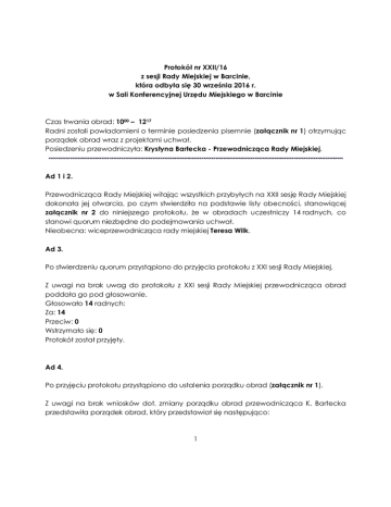 Protokół nr XXII/16 z sesji Rady Miejskiej w Barcinie, która odbyła się 30 września 2016 r. w Sali Konferencyjnej Urzędu Miejskiego w Barcinie Czas trwania obrad: 1000 – 1217 Radni zostali powiadomieni o terminie posiedzenia pisemnie (załącznik nr 1) otrzymując porządek obrad wraz z projektami uchwał. Posiedzeniu przewodniczyła: Krystyna Bartecka - Przewodnicząca Rady Miejskiej. Ad 1 i 2. Przewodnicząca Rady Miejskiej witając wszystkich przybyłych na XXII sesję Rady Miejskiej dokonała jej otwarcia, po czym stwierdziła na podstawie listy obecności, stanowiącej załącznik nr 2 do niniejszego protokołu, że w obradach uczestniczy 14 radnych, co stanowi quorum niezbędne do podejmowania uchwał. Nieobecna: wiceprzewodnicząca rady miejskiej Teresa Wilk. Ad 3. Po stwierdzeniu quorum przystąpiono do przyjęcia protokołu z XXI sesji Rady Miejskiej. Z uwagi na brak uwag do protokołu z XXI sesji Rady Miejskiej przewodnicząca obrad poddała go pod głosowanie. Głosowało 14 radnych: Za: 14 Przeciw: 0 Wstrzymało się: 0 Protokół został przyjęty. Ad 4. Po przyjęciu protokołu przystąpiono do ustalenia porządku obrad (załącznik nr 1). Z uwagi na brak wniosków dot. zmiany porządku obrad przewodnicząca K. Bartecka przedstawiła porządek obrad, który przedstawiał się następująco: 1 1. Otwarcie. 2. Stwierdzenie quorum. 3. Przyjęcie protokołu z XXI sesji Rady Miejskiej. 4. Ustalenie porządku obrad. 5. Informacja w Barcinie nt. działalności Miejsko-Gminnego wraz ze sprawozdaniem z Ośrodka realizacji Pomocy Społecznej Gminnego Programu Przeciwdziałania Przemocy w Rodzinie. 6. Sprawozdanie Burmistrza z działalności w okresie międzysesyjnym. 7. Zgłaszanie interpelacji i zapytań. 8. Podjęcie uchwał: 8.1. w sprawie zmian w statucie Biblioteki Publicznej Miasta i Gminy Barcin im. Jakuba Wojciechowskiego; 8.2. w sprawie zmian statutu Miejskiego Domu Kultury w Barcinie; 8.3. w sprawie w sprawie zmian w budżecie uchwalonym Uchwałą Nr XIV/126/2015 Rady Miejskiej w Barcinie z dnia 17 grudnia 2015 r.; 8.4. w sprawie zmian w Wieloletniej Prognozie Finansowej Gminy Barcin uchwalonej Uchwałą Nr XIV/127/2015 Rady Miejskiej w Barcinie z dnia 17 grudnia 2015 roku. 9. Informacja Przewodniczącego Rady Miejskiej o działaniach podejmowanych w okresie międzysesyjnym. 10. Odpowiedzi na interpelacje. 11. Wolne wnioski, zapytania i informacje. 12. Zakończenie obrad. Ad 5. Informacja dyrektor MGOPS nt. działalności Miejsko-Gminnego Ośrodka Pomocy Społecznej w Barcinie wraz ze sprawozdaniem z realizacji Gminnego Programu Przeciwdziałania Przemocy w Rodzinie stanowi załącznik nr 3 do protokołu. Przebieg dyskusji: 2 Radny Krzysztof Harenda: „Ja mam pytanie odnośnie osób bezdomnych w naszej gminie. Stosunkowo niedawno doszły do mnie informacje, że w Piechcinie powstał problem z 1 bezdomnym, który tak naprawdę miejski ośrodek pomocy społecznej w Barcinie zaproponował, że tak powiem, umieszczenie tej osoby w ośrodku pod Szubinem, nie znam dokładnej miejscowości, ale był problem z dowiezieniem tej osoby. Ta osoba też nie jest w stanie w żaden sposób tam dotrzeć, jak sama określa. I tu chciałem zapytać, jak w ogóle cała sprawa bezdomności ma się w Barcinie i jak wygląda ten konkretny przypadek, ponieważ tu mamy zgłoszenie od mieszkańców.” Dyrektor MGOPS w Barcinie Dorota Dokładna: „Rzeczywiście problem bezdomności jest jednym z trudniejszych problemów. Nie dlatego, że może jest to największy problem, ale tak naprawdę osobom bezdomnym pomaga się najtrudniej z uwagi na to, że oni nie są gotowi przyjąć tych oferowanych form pomocy, jakie dla nich przygotowujemy bądź wykupujemy w formie zabezpieczenia im schronienia. Zgadza się, mamy takie sytuacje trudne, w których to osoby bezdomne trzeba przekonywać dłuższy okres czasu, aby skorzystały ze schronienia, po czym te osoby są albo docierają same, albo staramy się tutaj ze strażą miejską organizować dojazd i dowóz tych osób do placówek. No, niestety, część z tych osób po krótkim okresie pobytu z uwagi na panujące zasady funkcjonowania w tych placówkach trafia z powrotem na nasz teren. Problem osób bezdomnych to jest problem kilkunastu osób. Większość przebywa już w placówkach, jest umieszczona od wielu, wielu miesięcy, ale jest jeszcze grupa osób, które możecie państwo tutaj widywać i o których los się bardzo tutaj martwimy cały czas proponując im pomoc. Myślę, że przyjdzie taka chwila i taki moment, w którym to samorząd będzie też musiał o jakichś tutaj formach lokalnych wsparcia dla tej grupy osób pomyśleć, mam na myśli tutaj ogrzewalnię bądź noclegownię z uwagi na to, że rzeczywiście te osoby w okresie zimowym wracają, narażone są na zamarznięcia i problem praktycznie nie rozwiąże się dopóki my tutaj nie stworzymy takich warunków, żeby przynajmniej w jakimś takim niezbędnym minimum tym osobom pomóc. No, są to osoby, które z uwagi na uzależnienie od substancji psychoaktywnych do nich trudno, że tak powiem, z tą ofertą wsparcia dotrzeć. No tak sobie radzimy. Radzimy sobie w każdym przypadku takie jakie są okoliczności. Mamy tutaj do dyspozycji straż miejską, tak że jeżeli jest taka potrzeba, to korzystamy z pomocy i są wizytowane miejsca, w których osoby bezdomne przebywają i w miarę potrzeb, możliwości korzystamy z dowozu właśnie straży. Tak że tu mogę tyle powiedzieć. Jest za chwilę okres zimowy, więc pewnie będzie to znowu problem dostrzegalny przez państwa.” Ad 6. Burmistrz Michał Pęziak przedstawiając sprawozdanie ze swojej działalności w okresie międzysesyjnym (załącznik nr 4) powiedział: „Tradycyjnie zacznę od zamówień publicznych. Pierwsze z nich dotyczyło przetargu nieograniczonego na budowę 3 parkingu i utwardzenia terenu z kostki betonowej na terenie miasta Barcin. Wpłynęło 5 ofert, wybrano ofertę firmy PKK-Bud Przemysław Kawka z B