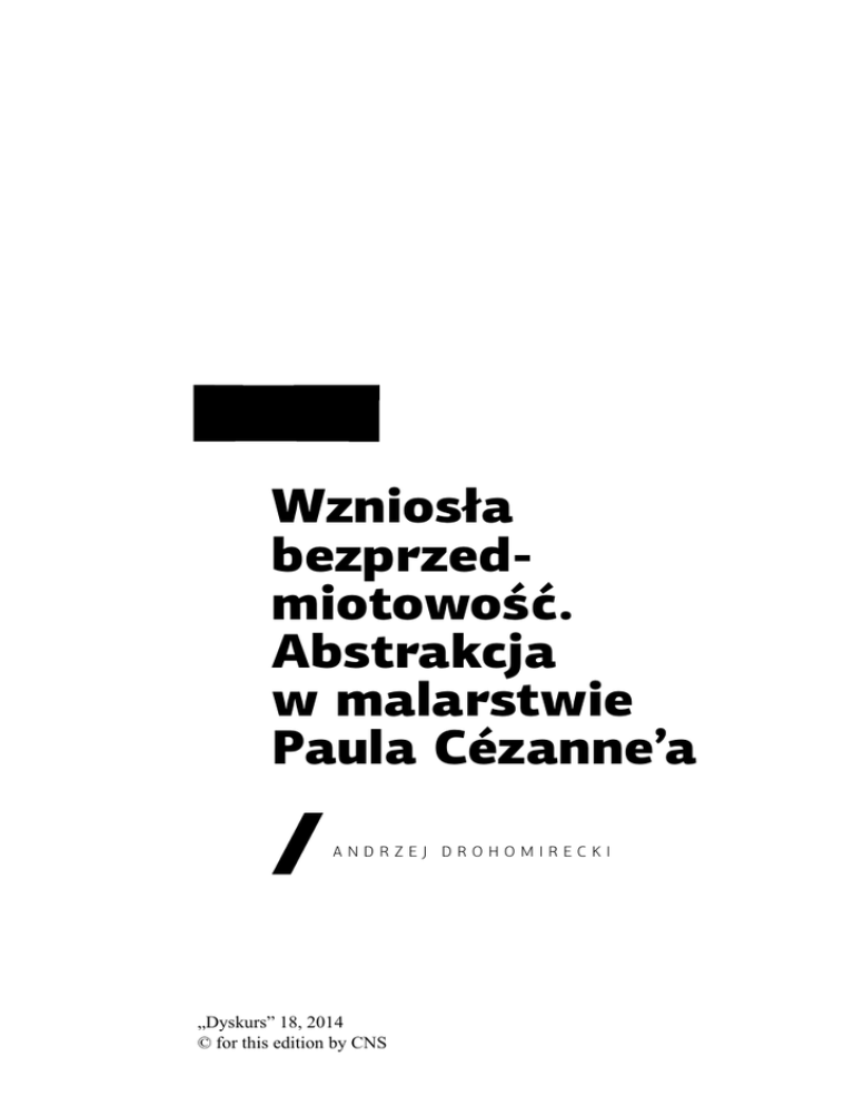 Wzniosła bezprzedmiotowość. Abstrakcja w malarstwie Paula Cézanne’a Andrzej Drohomirecki „Dyskurs” 18, 2014 © for this edition by CNS #10 201 W W dniu, w którym pan Paul Cézanne osiągnie pełnię swoich możliwości, stworzy dzieła wysokiej klasy. Emile Zola Drzewa, krzewy i domy zapuszczają korzenie wśród geometrycznych form, które odsłaniają odosobnione miejsca zrobione jakby z klocków porozrzucanych w dziecięcym nieporządku. Nierzeczywisty plac zabaw przypomina zdziczałe resztki jakiegoś ogrodu, bez najmniejszej wzmianki o wietrze, o pogodzie, bez miłych widoków na wodę i wzburzone niebezpiecznie fale. Wszystko to z potrzeby namalowania dziewiczości świata, jego atawistycznej, prymarnej formy, którą Paul Cézanne próbował uchwycić za cenę mimetyczności malarstwa oraz przyjaźni z dawnym kolegą i wielkim realistą; Emilem Zolą. „Dyskurs” 18, 2014 © for this edition by CNS 202 Andrzej Drohomirecki Cóż zatem oznaczają te labirynty bez Minotaura, geometryczne figury obojętne na malownicze krajobrazy przyrody, łączące w sobie pustkę i świat odbity w materialnym a-priori? Być może gesty pierwotnych impulsów ukazują nieodkrytą prawdę, ukryty sens? A może odnoszą się do wyższej ogólności, wydobywają istotę malarstwa? Czy możliwe jest odtworzenie obrazu rzeczywistości przy jednoczesnej rezygnacji ze środków, które pozwalają to osiągnąć? Idąc tropem teoretyków niemieckiego Oświecenia chciałoby się powiedzieć, że malarstwo Cézanne’a – podobnie jak kolejne nurty sztuki współczesnej, dla których powstania stało się ono impulsem – jest „drugą naturą”, „sztucznym dziełem wyobraźni”. Maurice Merleau-Ponty twierdził, że obrazy Cézanne’a wywołują wrażenie natury dziwacznej, podczas gdy fotografie tego samego krajobrazu ukazują pracę człowieka, jego twory i wszechobecność. Cézanne nie chciał nigdy malować jak „dzikus”, pragnął zespolić rozum, ideę, naukę, perspektywę, tradycję ze światem naturalnym, który mają tłumaczyć, chciał z naturą skonfrontować nauki „które zeń wyszły”1. Malarz idzie jednak jeszcze o krok dalej niż sugeruje to Merleau-Ponty. Cézanne podejmuje próbę rozwiązania starego problemu możliwości połączenia poezji i malarstwa, przyczyniając się przy tym do pogłębienia izolacji tego drugiego. Dojrzałe obrazy artysty zdradzają rygorystyczną próbę „malowania poezji”, zmuszania obrazu, aby stał się ejdetyczny i całościowy, a jednocześnie rezygnował z procesu figuratywnego oraz stałych umożliwiających jego opis i analizę. Propozycja Cézanne’a przypomina inną słynną próbę pojednania malarstwa i poezji autorstwa Lessinga, wedle którego o pięknie tableau nie decyduje urok zatrzymanej chwili, ale sugerowane przez obraz trwanie. Wszystkie próby malarskie Cézanne’a unaoczniają konieczność przemiany wyglądu w proces plastycznego ujawnienia wnętrza, istoty rzeczy. Wywracając swoje wnętrze ku widowiskowości, malarstwo wychodzi ze sfery mimetyczno-linearnej w kierunku abstrakcji, używając przy tym prostych kształtów i jednorodnych ruchów. W Słowniku języka polskiego czytamy, że słowo „abstrakcja” oznacza „pojęcie oderwane, luźno związane z rzeczywistością; zasada nie mająca związku z życiem; pomysł nie do urzeczywistnienia”. W tym samym słowniku czytamy również, że abstrahowaniem nazywamy „działanie myślowe, polegające na wyodrębnianiu cech istotnych, jakiego przedmiotu lub zjawiska od cech nieistotnych, przygodnych”2. Jak powszechnie wiadomo, pojęcie „abstrakcja” pochodzi z łacińskiego „Dyskurs” 18, 2014 © for this edition by CNS 203 Wzniosła bezprzedmiotowość czasownika abstrahere, który oznacza „odrywanie”. W języku filozofii pojęcie „abstrakcja” uważa się za przeciwieństwo pojęcia „konkret”, choć istnieją stanowiska krytyczne, wedle których dialektyka pojęć abstrakcja-konkret jest wyłącznie sztuczną konstrukcją myślową 3. Dzieło sztuki określa się przymiotnikiem „abstrakcyjne”, kiedy spełnia ono pewne historyczne i konstrukcyjne wymogi estetyczne. Powszechnie przyjmuje się, że malarstwo abstrakcyjne narodziło się z kubistycznej ucieczki przed perspektywą liniową jako konieczność odrzucenia wszelkiej formy i dyscypliny narzucanej przez malarstwo tradycyjne. Abstrakcjonizm utożsamiany jest z niefiguratywnym, płaskim, tj. dwuwymiarowym przedstawieniem osiąganym za pomocą gwałtownych ruchów pędzla i wyraźnych zarysów konturów. Postrzeganie malarstwa abstrakcyjnego wyłącznie przez pryzmat niefiguratywności (lub bezprzedmiotowości) charakterystycznej dla dzieł Wassiliy’a Kandinsky’ego, Pieta Mondriana, Władysława Strzemińskiego czy Jacksona Pollocka uważam za niepełne, a nawet – do pewnego stopnia – nieuzasadnione. Złożoność kategorii obrazu abstrakcyjnego oddaje Roman Ingarden, który sformułował siedem sposobów jego rozumienia. Wśród nich czytamy, że obrazem abstrakcyjnym możemy nazywać taki obraz, „na którym nie pojawiają się przedmioty przedstawione, rzeczy i ludzie”. Obraz abstrakcyjny charakteryzuje się również „wyizolowaniem” z całego swojego otoczenia, jako swoisty zestrój jakościowy. O abstrakcyjności w obrazie decyduje również sam sposób jego doświadczania; aby go ujrzeć, trzeba przy uchwytywaniu plam barwnych abstrahować od pełnionych przez nie formalnie funkcji konstytuowania wyglądów. Obraz taki można rozumieć również jako pokaz idealnego zestroju czystych jakości ( jakby „idei” platońskich). W innym całkowicie znaczeniu obraz jest „abstrakcyjny” – kontynuuje Ingarden – jeżeli zawiera wprawdzie przedmioty przedstawione, ale zarazem są one tak przedstawione, iż są w różnych swych szczegółach „uproszczone” lub gdy występują w nim znaczne deformacje kształtu i ewentualnie barwy przedmiotów przedstaw