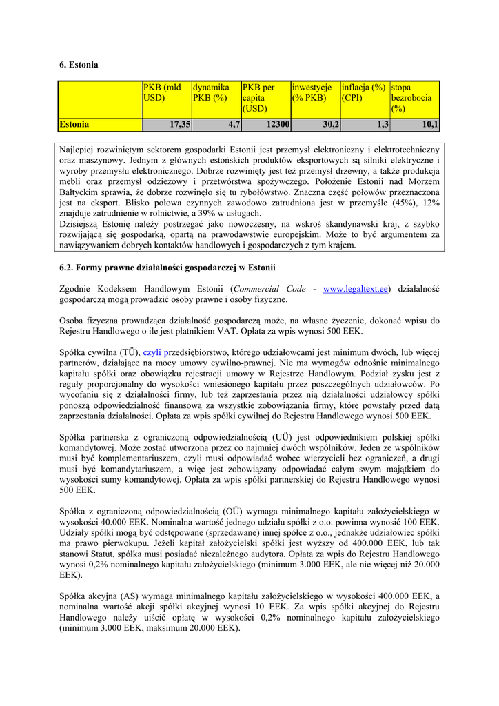 6. Estonia PKB (mld USD) Estonia 17,35 dynamika PKB (%) 4,7 PKB per capita (USD) 12300 inwestycje (% PKB) 30,2 inflacja (%) stopa (CPI) bezrobocia (%) 1,3 10,1 Najlepiej rozwiniętym sektorem gospodarki Estonii jest przemysł elektroniczny i elektrotechniczny oraz maszynowy. Jednym z głównych estońskich produktów eksportowych są silniki elektryczne i wyroby przemysłu elektronicznego. Dobrze rozwinięty jest też przemysł drzewny, a także produkcja mebli oraz przemysł odzieżowy i przetwórstwa spożywczego. Położenie Estonii nad Morzem Bałtyckim sprawia, że dobrze rozwinęło się tu rybołówstwo. Znaczna część połowów przeznaczona jest na eksport. Blisko połowa czynnych zawodowo zatrudniona jest w przemyśle (45%), 12% znajduje zatrudnienie w rolnictwie, a 39% w usługach. Dzisiejszą Estonię należy postrzegać jako nowoczesny, na wskroś skandynawski kraj, z szybko rozwijającą się gospodarką, opartą na prawodawstwie europejskim. Może to być argumentem za nawiązywaniem dobrych kontaktów handlowych i gospodarczych z tym krajem. 6.2. Formy prawne działalności gospodarczej w Estonii Zgodnie Kodeksem Handlowym Estonii (Commercial Code - www.legaltext.ee) działalność gospodarczą mogą prowadzić osoby prawne i osoby fizyczne. Osoba fizyczna prowadząca działalność gospodarczą może, na własne życzenie, dokonać wpisu do Rejestru Handlowego o ile jest płatnikiem VAT. Opłata za wpis wynosi 500 EEK. Spółka cywilna (TÜ), czyli przedsiębiorstwo, którego udziałowcami jest minimum dwóch, lub więcej partnerów, działające na mocy umowy cywilno-prawnej. Nie ma wymogów odnośnie minimalnego kapitału spółki oraz obowiązku rejestracji umowy w Rejestrze Handlowym. Podział zysku jest z reguły proporcjonalny do wysokości wniesionego kapitału przez poszczególnych udziałowców. Po wycofaniu się z działalności firmy, lub też zaprzestania przez nią działalności udziałowcy spółki ponoszą odpowiedzialność finansową za wszystkie zobowiązania firmy, które powstały przed datą zaprzestania działalności. Opłata za wpis spółki cywilnej do Rejestru Handlowego wynosi 500 EEK. Spółka partnerska z ograniczoną odpowiedzialnością (UÜ) jest odpowiednikiem polskiej spółki komandytowej. Może zostać utworzona przez co najmniej dwóch wspólników. Jeden ze wspólników musi być komplementariuszem, czyli musi odpowiadać wobec wierzycieli bez ograniczeń, a drugi musi być komandytariuszem, a więc jest zobowiązany odpowiadać całym swym majątkiem do wysokości sumy komandytowej. Opłata za wpis spółki partnerskiej do Rejestru Handlowego wynosi 500 EEK. Spółka z ograniczoną odpowiedzialnością (OÜ) wymaga minimalnego kapitału założycielskiego w wysokości 40.000 EEK. Nominalna wartość jednego udziału spółki z o.o. powinna wynosić 100 EEK. Udziały spółki mogą być odstępowane (sprzedawane) innej spółce z o.o., jednakże udziałowiec spółki ma prawo pierwokupu. Jeżeli kapitał założycielski spółki jest wyższy od 400.000 EEK, lub tak stanowi Statut, spółka musi posiadać niezależnego audytora. Opłata za wpis do Rejestru Handlowego wynosi 0,2% nominalnego kapitału założycielskiego (minimum 3.000 EEK, ale nie więcej niż 20.000 EEK). Spółka akcyjna (AS) wymaga minimalnego kapitału założycielskiego w wysokości 400.000 EEK, a nominalna wartość akcji spółki akcyjnej wynosi 10 EEK. Za wpis spółki akcyjnej do Rejestru Handlowego należy uiścić opłatę w wysokości 0,2% nominalnego kapitału założycielskiego (minimum 3.000 EEK, maksimum 20.000 EEK). Przedstawicielstwo. W celu założenia przedstawicielstwa wymagane są następujące dokumenty: wniosek firmy, wyciąg z rejestru handlowego, zezwolenie na powołanie przedstawicielstwa (filii), postanowienie o powołaniu dyrektorów przedstawicielstwa, kopię aktu założycielskiego firmy, dane adresowe. Przedstawicielstwo może podjąć swoją działalność od momentu jego wniesienia do Rejestru Handlowego, przy czym nie posiada ono osobowości prawnej. Księgowość przedstawicielstwa powinna być prowadzona niezależnie od firmy, a poświadczony notarialnie bilans roczny wymaga zgłoszenia do Rejestru Handlowego po zakończeniu roku obrachunkowego. 6.3. Podatek dochodowy od osób prawnych Osoby prawne zwolnione są od obowiązku podatkowego w przypadku zainwestowania wypracowanego zysku w rozwój firmy. Nie dotyczy to sytuacji, kiedy zysk przeznaczany jest na wypłatę dywidendy lub wynagrodzeń. 6.4. Podatek od towarów i usług (VAT) W Estonii obowiązują trzy stawki podatku VAT: stawka podstawowa VAT 18%, stawka zredukowana VAT 5% i stawka VAT 0%. 6.5. Ważne adresy • Wydział Ekonomiczno – Handlowy Ambasady RP: www.poola.ee Narva mnt 9A 10 503 Tallinn P.O. box 240 tel. +372 6604 378