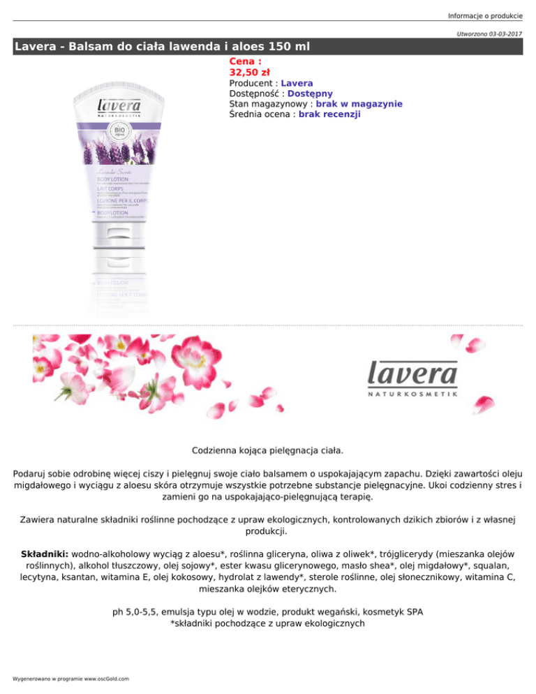 Informacje o produkcie Utworzono 03-03-2017 Lavera - Balsam do ciała lawenda i aloes 150 ml Cena : 32,50 zł Producent : Lavera Dostępność : Dostępny Stan magazynowy : brak w magazynie Średnia ocena : brak recenzji Codzienna kojąca pielęgnacja ciała. Podaruj sobie odrobinę więcej ciszy i pielęgnuj swoje ciało balsamem o uspokajającym zapachu. Dzięki zawartości oleju migdałowego i wyciągu z aloesu skóra otrzymuje wszystkie potrzebne substancje pielęgnacyjne. Ukoi codzienny stres i zamieni go na uspokajająco-pielęgnującą terapię. Zawiera naturalne składniki roślinne pochodzące z upraw ekologicznych, kontrolowanych dzikich zbiorów i z własnej produkcji. Składniki: wodno-alkoholowy wyciąg z aloesu*, roślinna gliceryna, oliwa z oliwek*, trójglicerydy (mieszanka olejów roślinnych), alkohol tłuszczowy, olej sojowy*, ester kwasu glicerynowego, masło shea*, olej migdałowy*, squalan, lecytyna, ksantan, witamina E, olej kokosowy, hydrolat z lawendy*, sterole roślinne, olej słonecznikowy, witamina C, mieszanka olejków eterycznych. ph 5,0-5,5, emulsja typu olej w wodzie, produkt wegański, kosmetyk SPA *składniki pochodzące z upraw ekologicznych Wygenerowano w programie www.oscGold.com
