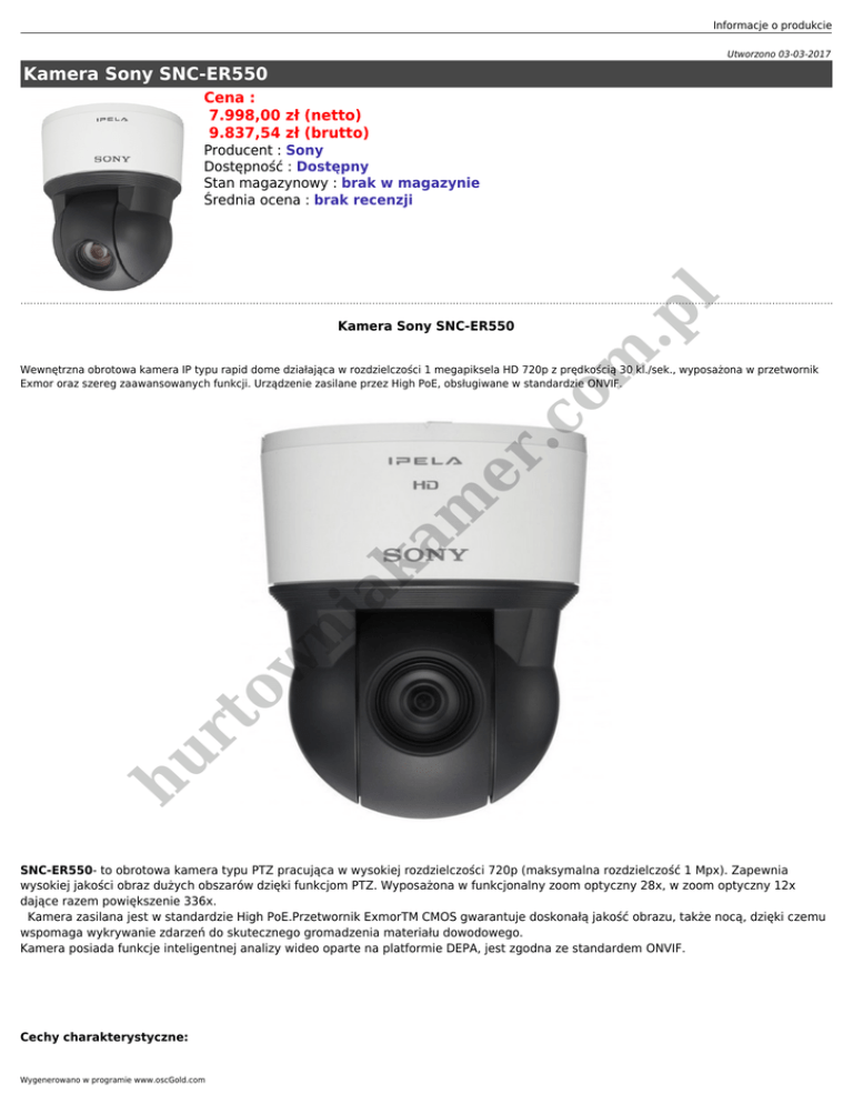 Informacje o produkcie Utworzono 03-03-2017 Kamera Sony SNC-ER550 Cena : 7.998,00 zł (netto) 9.837,54 zł (brutto) er .c om Kamera Sony SNC-ER550 .p l Producent : Sony Dostępność : Dostępny Stan magazynowy : brak w magazynie Średnia ocena : brak recenzji hu rt ow ni ak am Wewnętrzna obrotowa kamera IP typu rapid dome działająca w rozdzielczości 1 megapiksela HD 720p z prędkością 30 kl./sek., wyposażona w przetwornik Exmor oraz szereg zaawansowanych funkcji. Urządzenie zasilane przez High PoE, obsługiwane w standardzie ONVIF. SNC-ER550- to obrotowa kamera typu PTZ pracująca w wysokiej rozdzielczości 720p (maksymalna rozdzielczość 1 Mpx). Zapewnia wysokiej jakości obraz dużych obszarów dzięki funkcjom PTZ. Wyposażona w funkcjonalny zoom optyczny 28x, w zoom optyczny 12x dające razem powiększenie 336x. Kamera zasilana jest w standardzie High PoE.Przetwornik ExmorTM CMOS gwarantuje doskonałą jakość obrazu, także nocą, dzięki czemu wspomaga wykrywanie zdarzeń do skutecznego gromadzenia materiału dowodowego. Kamera posiada funkcje inteligentnej analizy wideo oparte na platformie DEPA, jest zgodna ze standardem ONVIF. Cechy charakterystyczne: Wygenerowano w programie www.oscGold.com ● ● ● ● ● ● ● ● ● ● ● ● ● ● ● ● ● ● er .c om ● zoom optyczny x28, cyfrowy x12 rozdzielczość 1MPix (1280x720) przy 30 kl./s w kompresji H.264 przetwornik 1/4" Exmor CMOS minimalne oświetlenie 0.7 lx (30 IRE, F1.35, 1/30 sek.) w trybie dziennym kolorowym minimalne oświetlenie 0.07 lx (30 IRE, F1.35, 1/30 sek.) w trybie nocnym cz/b szeroki zakres dynamiki WDR (86 dB) mechaniczny filtr podczerwieni funkcja cyfrowej redukcji szumu kompresja obrazu H.264, MPEG-4 lub MJPEG obiektyw o zmiennej ogniskowej 3.5-98 mm zakres obrotu w poziomie 360 stopni zakres obrotu w pionie 210 stopni szybkość obrotu do 300 stopni na sekundę dwukierunkowe audio w kompresji G.711 i G.726 wejście i wyjście audio typu mini-jack 3.5mm 2 wejścia i 1 wyjście alarmowe slot na karty SD/SDHC zgodność ze standardem kamer sieciowych ONVIF zasilanie 24VAC (max 25W, 1.04A), 12VDC, hPOE zakres temperatur pracy od -5 do +50 stopni C .p l ● rt ow ni ak am Kamera może być zastosowana na zewnątrz (montaż w zewnętrznej obudowie) hu Zewnętrzna kamera szybkoobrotowa IP SNC-ER550 OUTDOOR Sony to zaawansowane technologicznie urządzenie sieciowe, które umożliwia prowadzenie efektywnego nadzoru wideo rozległych obszarów dzięki wysokiej klasy funkcjom panoramowania, przechylania i powiększania (Pan/Tilt/Zoom). W kamerze zastosowano 28-krotny zoom optyczny, który w połączeniu z doskonałej jakości obrazem w rozdzielczości HD 720p (częstotliwość odświeżania 30 kl./s), umożliwia bardzo dokładną identyfikację ludzkich twarzy, zdarzeń alarmowych oraz informacji alfanumerycznych. er .c om .p l Informacje o produkcie hu rt ow ni ak am Za generowanie pozbawionego szumów obrazu z bardzo dużą ilością detali oraz wiernie odwzorowaną kolorystyką jest odpowiedzialny zaawansowany Exmor CMOS©. W kamerze zastosowano optyczną funkcję Dzień/Noc, która poprzez automatyczne przełączanie trybów pracy (kolorowy – dzień / monochromatyczny – noc), zapewnia skuteczny nadzór wideo w trybie całodobowym. Dodatkowym atutem omawianego produktu jest technologia Wide-D, która poszerza zakres dynamiki kamery w celu zwiększenia widoczności obrazów o wysokim lub niskim kontraście. Zwiększoną skuteczność działania systemów monitoringu IP budowanych na bazie kamery PTZ SNC-ER550 zapewnia system inteligentnej analizy obrazu DEPA Sony. Łatwą instalację oraz zmniejszone koszty wdrożenia są możliwe dzięki opcji zasilania hPoE - zasilana przy użyciu kabla do transmisji danych. Specyfikacja: Kamera ● ● ● ● Przetwornik: 1 /4 -typeExmor CMOS Rozdzielczość: 1,43 Mpx Minimalne oświetlenie: Color: 1.0lx (F1.35, shutter 1/30sec, AGC ON, 50IRE[IP]), B/W: 0.1lx (F1.35, shutter 1/30sec, AGC ON, Night Mode, 50IR [IP]), Color: 0.7lx (F1.35, shutter 1/30sec, AGC ON, 30IRE[IP]), B/W: 0.07lx (F1.35, shutter 1/30sec, AGC ON, Night Mode, 30IRE[IP]) Czas migawki: 1/1 to 1/10,000 s Wygenerowano w programie www.oscGold.com ● ● ● ● ● ● ● ● ● ● ● ● ● ● Kontrola czasu ekspozycji: Full auto, Shutter priority, Iris priority, Manual Balans bieli: Auto, ATW, Indoor, Outdoor, One-push, Manual, lampa sodowa Obiektyw: Auto-focus, Zbliżeniowy Przybliżenie: optyczne: 28x, cyfrowe: 12x, całkowite: 336x Kąt widzenia w poziomie: 55.9° to 2.1° Długość ogniskowej: f=3.5 to 98 mm F1.35 to F3.7 Minimalny dystans: 10mm (wide) do 1500mm (tele) Obrót: 360° Szybkość obrotu: 300°/s. (max) Nachylenie: 210° Szybkość nachylenia: 300°/s (max) Liczba presetów: 256 Objazd: 5 ● ● Dzień/Noc: Tak Wide-D: tak (86 dB) Redukcja szumów: Tak er .c om ● .p l Cechy Kamery Obraz ● ● ● ● Rozdzielczość: 1280×720, 1024×576, 800×600, 800×480, 768×576, 720×576, 704×576, 720×480, 640×480, 640×368, 384×288, 320×240, 320×192 Kompresja: H.264, MPEG-4, JPEG Strumieniowanie: podwójny strumień Klatkowanie: 30 fps (H.264/MPEG-4/JPEG) Audio: G.711/G.726 ni ak am ● Analiza Wideo: ● Detekcja Ruchu: TAK Sieć ● ● ● Protokoły: IPv4, IPv6, TCP, UDP, ARP, ICMP, IGMP, HTTP, HTTPS, FTP (client/server), SMTP, DHCP, DNS, NTP, RTP/RTCP, RTSP, SNMP(MIB-2) Onvif: Tak Liczba użytkowników: 5 Potwierdzenie autentyczności: IEEE802.1X ow ● Interface ● ● ● Ethernet: 10BASE-T / 100BASE-TX (RJ-45) Slot kart: SD/SDHC Wyjście mikrofonowe: Mini-jack (monaural) Audio Out: Mini-jack (monaural), Max ouput level: 1 Vrms Wejścia/Wyjścia alarmowe: 2xwejście, 1xwyjście rt ● hu ● Pozostałe informacje ● ● ● ● ● ● ● ● Waga: 1,7 kg Wymiary: ø147.4 x 190.9 mm Zasilanie: PoE+ Maksymalny pobór mocy: 25W Temperatura startu: 0°C do 50°C Temperatura działania: -5°C do +50°C Temperatura przechowywania: -20°C do +60°C Certyf