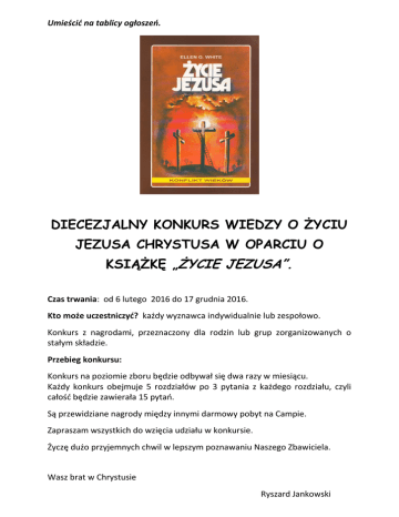 Umieścić na tablicy ogłoszeń. DIECEZJALNY KONKURS WIEDZY O ŻYCIU JEZUSA CHRYSTUSA W OPARCIU O KSIĄŻKĘ „ŻYCIE JEZUSA”. Czas trwania: od 6 lutego 2016 do 17 grudnia 2016. Kto może uczestniczyć? każdy wyznawca indywidualnie lub zespołowo. Konkurs z nagrodami, przeznaczony dla rodzin lub grup zorganizowanych o stałym składzie. Przebieg konkursu: Konkurs na poziomie zboru będzie odbywał się dwa razy w miesiącu. Każdy konkurs obejmuje 5 rozdziałów po 3 pytania z każdego rozdziału, czyli całość będzie zawierała 15 pytań. Są przewidziane nagrody między innymi darmowy pobyt na Campie. Zapraszam wszystkich do wzięcia udziału w konkursie. Życzę dużo przyjemnych chwil w lepszym poznawaniu Naszego Zbawiciela. Wasz brat w Chrystusie Ryszard Jankowski