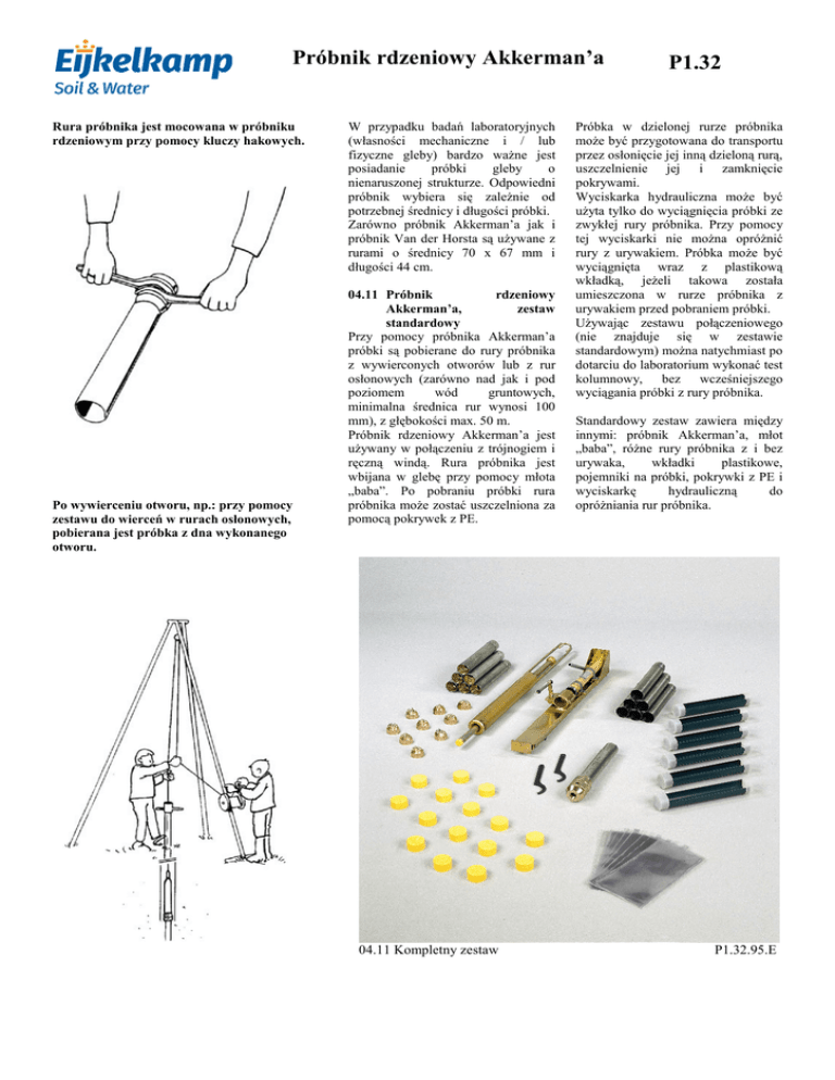 Próbnik rdzeniowy Akkerman’a Rura próbnika jest mocowana w próbniku rdzeniowym przy pomocy kluczy hakowych. Po wywierceniu otworu, np.: przy pomocy zestawu do wierceń w rurach osłonowych, pobierana jest próbka z dna wykonanego otworu. W przypadku badań laboratoryjnych (własności mechaniczne i / lub fizyczne gleby) bardzo ważne jest posiadanie próbki gleby o nienaruszonej strukturze. Odpowiedni próbnik wybiera się zależnie od potrzebnej średnicy i długości próbki. Zarówno próbnik Akkerman’a jak i próbnik Van der Horsta są używane z rurami o średnicy 70 x 67 mm i długości 44 cm. 04.11 Próbnik rdzeniowy Akkerman’a, zestaw standardowy Przy pomocy próbnika Akkerman’a próbki są pobierane do rury próbnika z wywierconych otworów lub z rur osłonowych (zarówno nad jak i pod poziomem wód gruntowych, minimalna średnica rur wynosi 100 mm), z głębokości max. 50 m. Próbnik rdzeniowy Akkerman’a jest używany w połączeniu z trójnogiem i ręczną windą. Rura próbnika jest wbijana w glebę przy pomocy młota „baba”. Po pobraniu próbki rura próbnika może zostać uszczelniona za pomocą pokrywek z PE. 04.11 Kompletny zestaw P1.32 Próbka w dzielonej rurze próbnika może być przygotowana do transportu przez osłonięcie jej inną dzieloną rurą, uszczelnienie jej i zamknięcie pokrywami. Wyciskarka hydrauliczna może być użyta tylko do wyciągnięcia próbki ze zwykłej rury próbnika. Przy pomocy tej wyciskarki nie można opróżnić rury z urywakiem. Próbka może być wyciągnięta wraz z plastikową wkładką, jeżeli takowa została umieszczona w rurze próbnika z urywakiem przed pobraniem próbki. Używając zestawu połączeniowego (nie znajduje się w zestawie standardowym) można natychmiast po dotarciu do laboratorium wykonać test kolumnowy, bez wcześniejszego wyciągania próbki z rury próbnika. Standardowy zestaw zawiera między innymi: próbnik Akkerman’a, młot „baba”, różne rury próbnika z i bez urywaka, wkładki plastikowe, pojemniki na próbki, pokrywki z PE i wyciskarkę hydrauliczną do opróżniania rur próbnika. P1.32.95.E Próbnik rdzeniowy Akkerman’a Rura próbnika jest wbijana w glebę przy pomocy młota „baba”. P1.32 04.14 Próbnik rdzeniowy Van der Horst’a Próbnik rdzeniowy Van der Horst’a jest używany do ręcznego napełniania rur próbnika. Próbki można pobierać z wywierconych otworów, rur osłonowych (minimalna średnica 75 mm) lub z dna kanałów, jezior, itd., z głębokości do około 10 m. stalowego młota z systemem absorpcyjnym, młota „baba”, próbnika rdzeniowego Van der Horsta, rur próbnika z i bez urywaka, wkładek plastikowych, pojemników na próbki, pokrywek z PE, wyciskarki hydraulicznej i innych akcesoriów. Kompletny zestaw jest dostarczany w aluminiowej skrzyni transportowej. Odmiennie do próbnika Akkerman’a próbnik rdzeniowy Van der Horst’a jest wkładany do otworu na żerdziach. Zastosowanie obydwu próbników rdzeniowych Próbnik może być wbity w glebę przy pomocy stalowego młota z systemem absorpcyjnym lub młota „baba”. Gdy próbka znajdzie się w rurze próbnika, woda i powietrze znajdujące się ponad próbką mogą opuścić próbnik przez zawór zwrotny. Po pobraniu próbki próbnik jest wyciągany z gleby za pomocą specjalnej wyciągarki. Standardowy zestaw składa się między innymi z: uchwytu z głowicą do pobijania, żerdzi wydłużających, Próbki pobrane przy pomocy obydwu próbników rdzeniowych w praktyce są zazwyczaj używane do: Pomiary techniczne gleby (odporność na ściskanie, ścinanie). Badania własności fizycznych gleby. Określanie składu granulometrycznego gleby. Analizy chemiczne, np.: test kolumnowy. Badania wizualne. Badania profilu glebowego. Próbka jest wyciągana z rury próbnika przy pomocy wyciskarki hydraulicznej. Próbnik Van der Horst’a z rurą Przedstawicielstwo firmy Eijkelkamp Soil & Water w Polsce: GEOMOR-TECHNIK Sp. z o.o., ul. Modra 30, 71-220 Szczecin, tel. 91-482-00-90, tel./fax. 91-482-60-87, e-mail: [email protected] internet: www.geomor.com.pl Zestaw do testu kolumnowego Młot „baba”