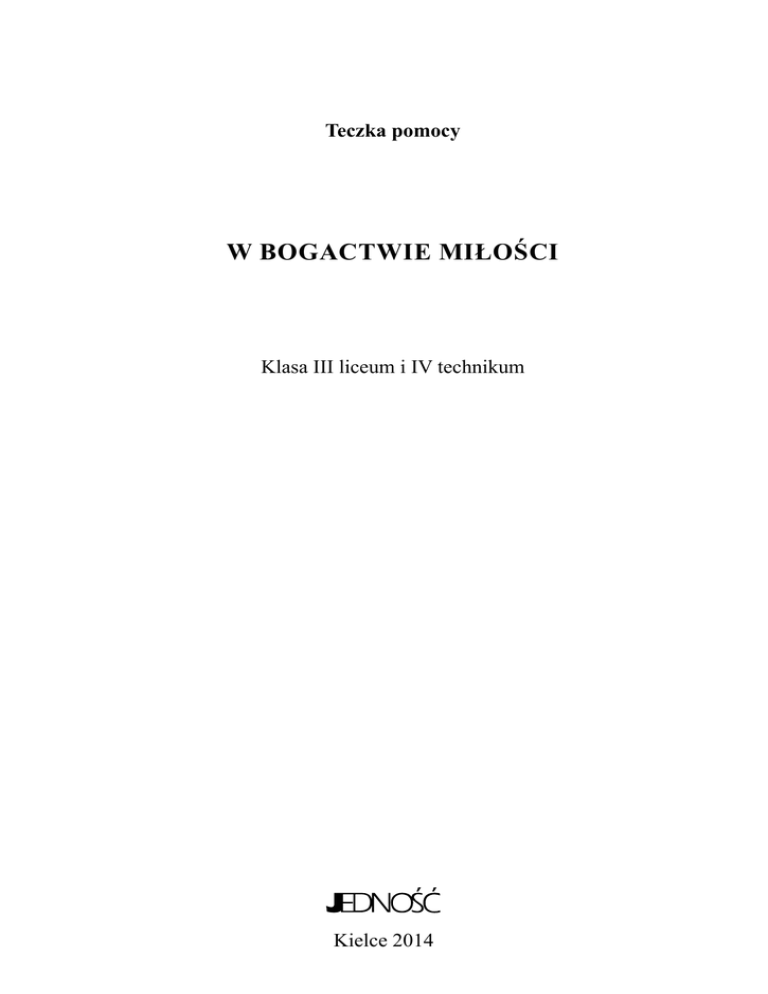 Teczka pomocy W BOGACTWIE miłości Klasa III liceum i IV technikum Kielce 2014 Teczka pomocy dydaktycznych do nauczania religii rzymskokatolickiej na terenie całej Polski, z zachowaniem praw biskupów diecezjalnych, przeznaczona jest dla klas III liceum i IV technikum i może być stosowana jako pomoc uzupełniająca do podręcznika nr AZ-43-03/12-KI-1/14. Recenzenci dr Ewa Jancewicz ks prof. dr hab. Jan Kochel Redakcja Elżbieta Kondrak Wybór materiałów ks. dr Jarosław Czerkawski Elżbieta Ćwierz Michał Ćwierz Anna Gajda-Baran ks. dr Miłosz Hołda Andrzej Kobiałka Elżbieta Kondrak Zbigniew Kopeć Anna Korotkiewicz – Łomża Katarzyna Kościołek – Lublin Konsultacja ks. dr Karol Zegan Korekta Elżbieta Lubowiecka Redakcja techniczna Wiktor Idzik Projekt okładki Justyna Kułaga-Wytrych © Copyright Wydawnictwo „JEDNOŚĆ”, Kielce 2014 Wydawnictwo JEDNOŚĆ 25-013 Kielce, ul. Jana Pawła II nr 4 Dział sprzedaży tel. 041 349 50 50 Redakcja tel. 041 368 11 10 www.jednosc.com.pl e-mail: [email protected] ks. dr Tomasz Lenczewski – Kalisz ks. dr Krzysztof Mielnicki – Drohiczyn Bogusław Nosek Kamilla Rokosz ks. dr Piotr Sobczak – Tarnów ks. dr Marek Studenski – Bielsko Biała Ewa Stolarska ks. dr Adam Wilczyński Danuta Zasada-Seweryn Iwona Zielonka Spis treści Temat 1. Teksty biblijne do pracy w grupach ................................................................................................................................ 4 Temat 2. Zestaw pytań do pracy w grupach .................................................................................................................................. 7 Temat 3. Karta pracy . ...................................................................................................................................................................8 Temat 4. Teksty do wykorzystania dla ucznia ............................................................................................................................... 9 Temat 5. Karta pracy (Cechy typowe dla kobiety i mężczyzny) ................................................................................................... 13 Temat 6. Karta pracy (Cechy miłości według św. Pawła) ............................................................................................................. 14 Temat 7. Teksty do pracy w grupach ............................................................................................................................................. 15 Temat 8. Teksty biblijne . .............................................................................................................................................................. 17 Tekst luk . ........................................................................................................................................................................ 16 Temat 9. Teksty do wykorzystania dla ucznia ............................................................................................................................... 19 Zadania do pracy w grupach ........................................................................................................................................... 20 Temat 10. Teksty do pracy w grupach ........................................................................................................................................... 22 Temat 12. Ankieta (Stanowisko wobec działań biomedycznych); Teksty do wykorzystania dla katechety.................................. 24 Temat 13. Karta obserwacji cyklu kobiety .................................................................................................................................... 27 Plansza: Zapłodnienie – zagnieżdżenie ........................................................................................................................ 28 Plansza: Zmiany w jajniku w czasie cyklu płodowego ................................................................................................ 30 Plansza: Fizjologiczne zmiany w cyklu miesiączkowym (naturalne) .......................................................................... 32 Teksty do wykorzystania dla katechety ........................................................................................................................ 34 Temat 14. Plansza: Cykl w czasie stosowania pigułki hormonalnej ............................................................................................. 36 Plansza: Działanie pigułki hormonalnej ....................................................................................................................... 38 Teksty do wykorzystania dla katechety ........................................................................................................................ 40 Temat 15. Plansza: Zarodek w wieku około 1 miesiąca ................................................................................................................ 42 Plansza: Dziecko w wieku około 8 tygodni życia płodowego . .................................................................................... 44 Plansza: Dziecko w wieku płodowym 11 tygodni ........................................................................................................ 46 Plansza: Dziecko w wieku trzech i pół miesiąca życia płodowego .............................................................................. 48 Plansza: Ciało dziecka po aborcji metodą zasysania (w wieku 8 tygodni) .................................................................. 50 Plansza: Ciało dziecka po aborcji metodą zasysania (w wieku 10 tygodni) ................................................................ 52 Plansza: Ciało dziecka po zabiegu aborcyjnym przez zastosowanie prostaglandyn .................................................... 54 Plansza: Ciało dziecka po aborcji przez zastosowanie stężonego roztworu soli ..............