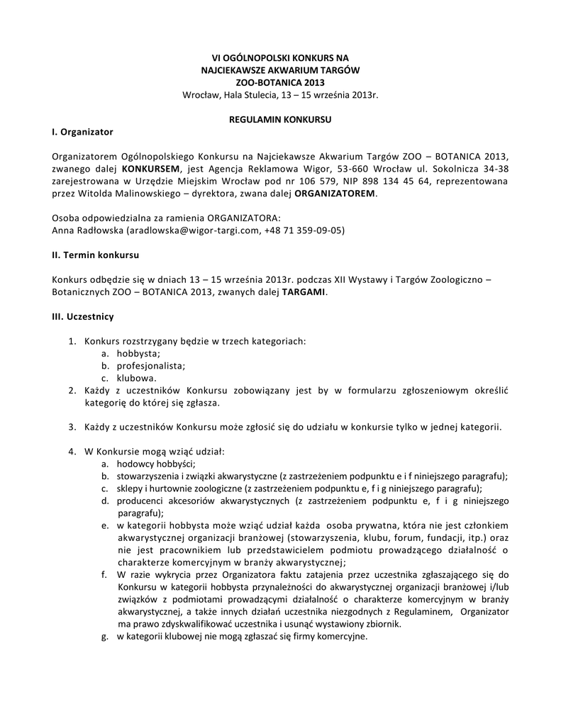 VI OGÓLNOPOLSKI KONKURS NA NAJCIEKAWSZE AKWARIUM TARGÓW ZOO-BOTANICA 2013 Wrocław, Hala Stulecia, 13 – 15 września 2013r. REGULAMIN KONKURSU I. Organizator Organizatorem Ogólnopolskiego Konkursu na Najciekawsze Akwarium Targów ZOO – BOTANICA 2013, zwanego dalej KONKURSEM, jest Agencja Reklamowa Wigor, 53-660 Wrocław ul. Sokolnicza 34-38 zarejestrowana w Urzędzie Miejskim Wrocław pod nr 106 579, NIP 898 134 45 64, reprezentowana przez Witolda Malinowskiego – dyrektora, zwana dalej ORGANIZATOREM. Osoba odpowiedzialna za ramienia ORGANIZATORA: Anna Radłowska ([email protected], +48 71 359-09-05) II. Termin konkursu Konkurs odbędzie się w dniach 13 – 15 września 2013r. podczas XII Wystawy i Targów Zoologiczno – Botanicznych ZOO – BOTANICA 2013, zwanych dalej TARGAMI. III. Uczestnicy 1. Konkurs rozstrzygany będzie w trzech kategoriach: a. hobbysta; b. profesjonalista; c. klubowa. 2. Każdy z uczestników Konkursu zobowiązany jest by w formularzu zgłoszeniowym określić kategorię do której się zgłasza. 3. Każdy z uczestników Konkursu może zgłosić się do udziału w konkursie tylko w jednej kategorii. 4. W Konkursie mogą wziąć udział: a. hodowcy hobbyści; b. stowarzyszenia i związki akwarystyczne (z zastrzeżeniem podpunktu e i f niniejszego paragrafu); c. sklepy i hurtownie zoologiczne (z zastrzeżeniem podpunktu e, f i g niniejszego paragrafu); d. producenci akcesoriów akwarystycznych (z zastrzeżeniem podpunktu e, f i g niniejszego paragrafu); e. w kategorii hobbysta może wziąć udział każda osoba prywatna, która nie jest członkiem akwarystycznej organizacji branżowej (stowarzyszenia, klubu, forum, fundacji, itp.) oraz nie jest pracownikiem lub przedstawicielem podmiotu prowadzącego działalność o charakterze komercyjnym w branży akwarystycznej; f. W razie wykrycia przez Organizatora faktu zatajenia przez uczestnika zgłaszającego się do Konkursu w kategorii hobbysta przynależności do akwarystycznej organizacji branżowej i/lub związków z podmiotami prowadzącymi działalność o charakterze komercyjnym w branży akwarystycznej, a także innych działań uczestnika niezgodnych z Regulaminem, Organizator ma prawo zdyskwalifikować uczestnika i usunąć wystawiony zbiornik. g. w kategorii klubowej nie mogą zgłaszać się firmy komercyjne. 5. Wszystkich uczestników Konkursu obowiązuje ścisły zakaz prowadzenia jakichkolwiek działań o charakterze promocyjnym, marketingowym lub reklamowym. Wyjątek stanowi możliwość umieszczenia informacji o firmie, która użyczyła STOWARZYSZENIU zbiornik do konkursu. Informacja musi być umieszczona tylko i wyłącznie na powierzchni zbiornika. Maksymalny jej rozmiar to 10 x 5 cm. Treść informacji: ZBIORNIK UŻYCZYŁA „nazwa firmy” W przypadku stwierdzenia przez Organizatora prowadzenia przez uczestnika w/wym. działań, Organizator obciąży uczestnika karą 1000 zł (słownie: tysiąc złotych) netto oraz zażąda zwrotu kosztów za powierzchnię udostępnioną pod zbiornik w wysokości trzykrotnie wyższej od ceny z karty zgłoszeniowej. IV. Zgłoszenia 1. Do Konkursu można zgłaszać akwaria słodkowodne oraz słonowodne, bez ograniczeń w pojemności/ rozmiarze zbiornika. 2. Każdy uczestnik ma prawo zgłosić swoje akwarium do Konkursu tylko w jednej kategorii, z zastrzeżeniem, że akwaria zgłoszone do kategorii klubowej mogą brać udział w kategorii profesjonalista. 3. W Konkursie nie mogą brać udziału pracownicy Organizatora oraz członkowie ich rodzin. W rozumieniu niniejszego Regulaminu za członków rodzin pracowników Organizatora uznaje się wstępnych, zstępnych, rodzeństwo oraz małżonka, a także wstępnych, zstępnych oraz rodzeństwo małżonka pracownika. 4. Zgłoszenie do udziału w Konkursie następuje poprzez wysłanie wypełnionego formularza zgłoszeniowego, stanowiącego załącznik do niniejszego Regulaminu pocztą elektroniczną na adres [email protected]. 5. Zgłoszenie do udziału w Konkursie jest jednoznaczne z akceptacją warunków niniejszego Regulaminu oraz zgody na gromadzenie i przetwarzanie przez Organizatora na potrzeby Konkursu danych osobowych zgodnie z ustawą z dnia 29 sierpnia 1997r. O ochronie danych osobowych (Dz. U. nr 133, poz. 883). 6. Zgłoszenie do udziału w Konkursie jest równoznaczne z wyrażeniem zgody na publikację zdjęć z wystawy akwariów przez Organizatora. V. Warunki uczestnictwa 1. W kategorii hobbysta jeden uczestnik może dokonać zgłoszenia tylko jednego zbiornika. 2. W kategorii profesjonalista jeden uczestnik może zgłosić dowolną ilość akwariów. 3. W kategorii klubowej jeden uczestnik może zgłosić dowolną ilość akwariów. 4. Uczestnik we własnym zakresie zapewnia sobie zbiornik (akwarium) oraz jego wyposażenie , z zastrzeżeniem, że w kategorii klubowej Organizator może udzielić uczestnikom pomocy w zakresie zapewnienia zbiorników. 5. Organizator zapewnia uczestnikom: a. bezpłatną powierzchnię wystawienniczą pod zgłoszone akwarium; b. bezpłatne przyłącze prądu dla każdego uczestnika Konkursu; c. w razie braku stolika bądź postumentu pod akwarium: stół do ekspozycji zbiornika; d. możliwość przygotowania zbiorników do udziału w Konkursie podczas dni technicznych przed otwarciem targów i wystawy. 6. Zgłoszone do Konkursu akwarium weźmie udział w Wystawie Akwarystycznej, która stanowi integralną część Targów. VI. Kryteria oceny 1. Ocena zbiorników biorących udział w Konkursie w kategorii hobbysta. a. Ocenie podlegać będą: i. kompozycja akwarium; ii. kreatywność i oryginalność twórcy; iii. kondycja roślin; iv. kondycja i dobór ryb; v. ogólne wrażenie estetyczne. b. Ocena zgłoszonych zbiorników dokonywana będzie w drodze głosowania odwiedzających Targi na specjalnie przygotowanych ankietach. c. Głosowanie trwa od momentu oficjalnego ogłoszenia rozpoczęcia Konkursu do dnia 15 września 2013r. d. Zwycięzcą Konkursu zostanie uczestnik, na kt