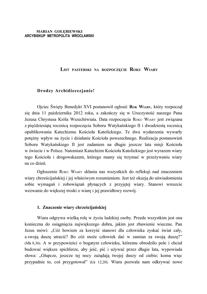 MARIAN GOŁĘBIEWSKI ARCYBISKUP METROPOLITA WROCŁAWSKI LIST PASTERSKI NA ROZPOCZĘCIE ROKU WIARY Drodzy Archidiecezjanie! Ojciec Święty Benedykt XVI postanowił ogłosić ROK WIARY, który rozpoczął się dnia 11 października 2012 roku, a zakończy się w Uroczystość naszego Pana Jezusa Chrystusa Króla Wszechświata. Data rozpoczęcia ROKU WIARY jest związana z pięćdziesiątą rocznicą rozpoczęcia Soboru Watykańskiego II i dwudziestą rocznicą opublikowania Katechizmu Kościoła Katolickiego. Te dwa wydarzenia wywarły potężny wpływ na życie i działanie Kościoła powszechnego. Realizacja postanowień Soboru Watykańskiego II jest zadaniem na długie jeszcze lata misji Kościoła w świecie i w Polsce. Natomiast Katechizm Kościoła Katolickiego jest wyrazem wiary tego Kościoła i drogowskazem, którego mamy się trzymać w przeżywaniu wiary na co dzień. Ogłoszenie ROKU WIARY skłania nas wszystkich do refleksji nad znaczeniem wiary chrześcijańskiej i jej właściwym rozumieniem. Jest też okazją do uświadomienia sobie wymagań i zobowiązań płynących z przyjętej wiary. Stanowi wreszcie wezwanie do większej troski o wiarę i jej prawidłowy rozwój. 1. Znaczenie wiary chrześcijańskiej Wiara odgrywa wielką rolę w życiu ludzkiej osoby. Przede wszystkim jest ona konieczna do osiągnięcia największego dobra, jakim jest zbawienie wieczne. Pan Jezus mówi: „Cóż bowiem za korzyść stanowi dla człowieka zyskać świat cały, a swoją duszę utracić? Bo cóż może człowiek dać w zamian za swoją duszę?” (Mk 8,36). A w przypowieści o bogatym człowieku, któremu obrodziło pole i chciał budować większe spichlerze, aby jeść, pić i używać przez długie lata, wypowiada słowa: „Głupcze, jeszcze tej nocy zażądają twojej duszy od ciebie; komu więc przypadnie to, coś przygotował” (Łk 12,20). Wiara pozwala nam odkrywać nowe 2 horyzonty życia i uzdalnia do patrzenia w przyszłość poza granice doczesności. Przyjęcie wiary prowadzi do poznania i osiągnięcia prawdziwego dobra, to jest pełni życia, które ma się stać udziałem każdego człowieka, ponieważ Pan Bóg pragnie, by wszyscy ludzie zostali zbawieni i doszli do poznania prawdy (por. 1Tm 2,4). Ale tylko ten, „kto uwierzy i przyjmie chrzest będzie zbawiony, a kto nie uwierzy będzie potępiony” (Mk 16,16). Tak więc, wiara nadaje sens życiu człowieka i otwiera drogę zbawienia wiecznego. Wiara chrześcijańska daje też moc do dobrego przeżywania naszej codzienności i do uczciwego wypełniania wszystkich obowiązków, a w chwilach trudnych daje siłę do rozwiązywania problemów i nie poddawania się przygnębieniu lub rozpaczy. Jest ostatecznie źródłem życia w miłości i źródłem prawdziwej radości. 2. Właściwe rozumienie wiary Sobór Watykański II przypomina, że wiara chrześcijańska jest przede wszystkim żywą relacją z Jezusem Chrystusem naszym Panem i Zbawicielem. On pierwszy nas wzywa, powołuje i przyciąga do wspólnoty życia z Trójjedynym Bogiem Ojcem, Synem i Duchem Świętym. Bez osobistego spotkania z Jezusem Chrystusem i bez przyjaźni z Nim nie ma prawdziwej wiary. Wiara rodzi się ze słuchania Jego głosu, zgodnie ze słowami św. Pawła: „Jakże mieli uwierzyć w Tego, którego nie słyszeli? (...) Ale nie wszyscy dali posłuch Ewangelii. Izajasz bowiem mówi: Panie, któż uwierzył temu, co od nas usłyszał? Przeto wiara rodzi się z tego, co się słyszy, tym zaś, co się słyszy, jest słowo Chrystusa” (Rz 10,14-17). Z kolei naszą odpowiedzią na głos Chrystusa i na Jego słowo jest posłuszeństwo wiary. Papież Benedykt w Liście apostolskim Porta fidei, w którym ogłasza ROK WIARY, zwraca uwagę na treść wiary i na akt wiary. Poznawanie treści naszej wiary wymaga stałego i uważnego słuchania słowa Bożego, zapisanego na kartach Pisma Świętego i przekazywanego przez żywą Tradycję Kościoła. Jednak sama znajomość treści wiary nie wystarczy. Aby człowiek mógł odpowiedzieć aktem wiary na usłyszane słowo, konieczna jest moc Boża płynąca z sakramentów Kościoła, przede wszystkim z Eucharystii. W ten sposób wiara może być przyjmowana sercem i wyznawana ustami (por. Rz 10,10). 3. Wymagania płynące z wiary Przyjęcie wiary stawia przed nami konkretne wymagania. Przede wszystkim zobowiązuje nas do nowego stylu życia na wzór naszego Pana Jezusa Chrystusa. Pan 3 Jezus żył tym wszystkim, czego nauczał. Swoją naukę zbawienia wprowadzał w czyn. Dlatego mamy Go naśladować i od Niego uczyć się życia wiary zgodnie z Ewangelią. On nam w wierze przewodzi. Dlatego idąc za Panem Jezusem mamy się ciągłe nawracać i przemieniać. Przyjęcie wiary i chrztu zobowiązuje każdego z nas do wyrzekania się szatana i wszelkiego zła, które przybiera często maskę pozornego dobra. Chrzest dzieci wymaga od rodziców i chrzestnych stałej troski o ich wychowanie w wierze przez żywy przykład chrześcijańskiego życia. Wiara musi być nauczana i wyjaśniana. Dlatego konieczna jest katecheza, która powinna obejmować wszystkie okresy życia człowieka wierzącego. Oprócz katechezy dzieci i młodzieży, niezbędna jest katecheza dorosłych, zwłaszcza rodziców, którzy stają się pierwszymi katechetami dla swoich dzieci. Należy przy tym pamiętać, że bardziej niż słowa i pouczenia potrzebne jest własne świadectwo wiary. Wiara chrześcijańska jest wiarą wspólnotową. Dlatego wymaga przeżywania jej w liturgii i nabożeństwach. Słowo Boże napomina nas, abyśmy nie zaniedbywali wspólnych zebrań na modlitwę i celebrację naszej wiary (por. Hbr 10,25). 4. Troska o rozwój wiary Wiara chrześcijańska jest nazywana drogą, ponieważ musi się rozwijać, dojrzewać i wzrastać. Od wiary otrzymanej w zalążku na chrzcie musi się stawać wiarą w pełni rozumną i posłuszną woli Bożej. Słowo Boże mówi o Panu Jezusie, że „zapoczątkował nam drogę nową i żywą, prze
