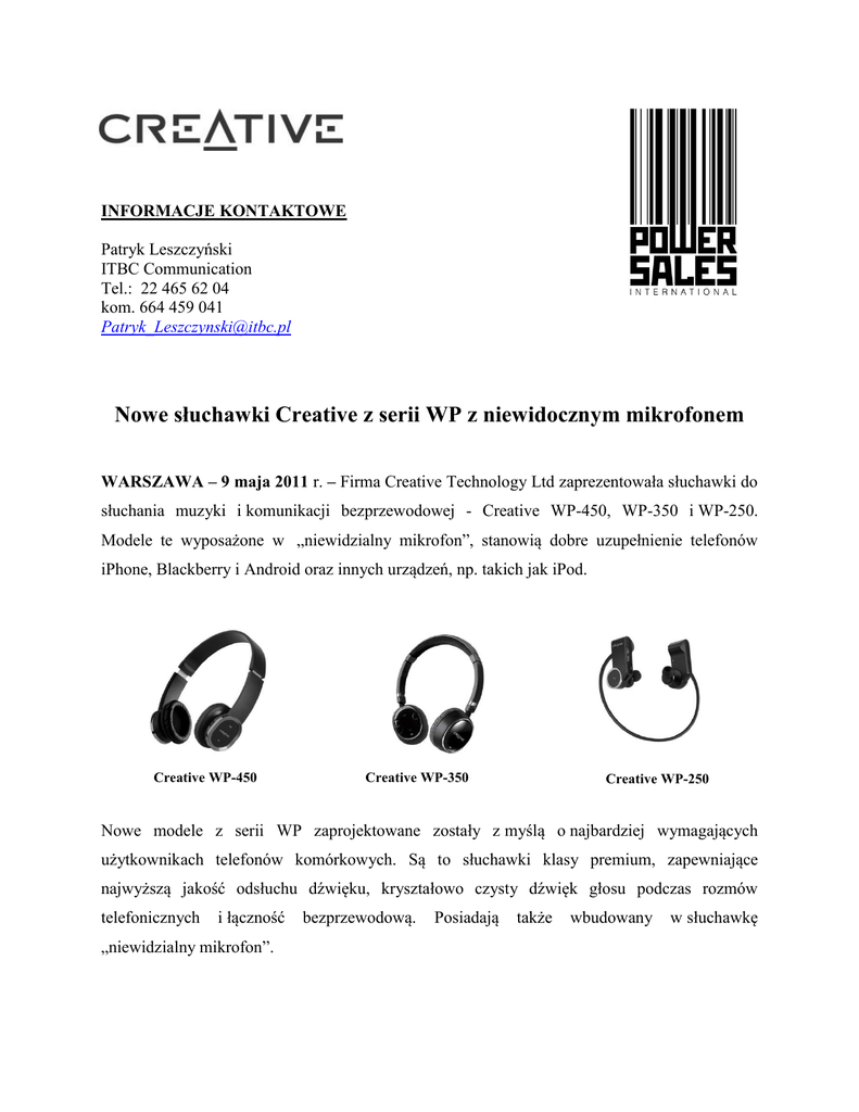 INFORMACJE KONTAKTOWE Patryk Leszczyński ITBC Communication Tel.: 22 465 62 04 kom. 664 459 041 [email protected] Nowe słuchawki Creative z serii WP z niewidocznym mikrofonem WARSZAWA – 9 maja 2011 r. – Firma Creative Technology Ltd zaprezentowała słuchawki do słuchania muzyki i komunikacji bezprzewodowej - Creative WP-450, WP-350 i WP-250. Modele te wyposażone w „niewidzialny mikrofon”, stanowią dobre uzupełnienie telefonów iPhone, Blackberry i Android oraz innych urządzeń, np. takich jak iPod. Creative WP-450 Creative WP-350 Creative WP-250 Nowe modele z serii WP zaprojektowane zostały z myślą o najbardziej wymagających użytkownikach telefonów komórkowych. Są to słuchawki klasy premium, zapewniające najwyższą jakość odsłuchu dźwięku, kryształowo czysty dźwięk głosu podczas rozmów telefonicznych i łączność „niewidzialny mikrofon”. bezprzewodową. Posiadają także wbudowany w słuchawkę „Zaprojektowaliśmy słuchawki z serii Creative WP, aby zapewnić wszystkim użytkownikom najwyższą jakość bezprzewodowej komunikacji głosowej i odtwarzania muzyki przy użyciu tylko jednej pary słuchawek” — powiedziała Ting Lai Chu, wiceprezes grupy zaawansowanych multimediów w firmie Creative Technology Ltd. Najważniejsze cechy słuchawek Bluetooth z z serii Creative WP Słuchawki Creative WP-450 Ergonomiczne słuchawki klasy premium do bezprzewodowego odtwarzania muzyki i komunikacji głosowej Wysoka jakość muzyki i wyraźne rozmowy głosowe ze wszystkich zgodnych modeli telefonów i urządzeń audio Bluetooth. „Niewidzialny mikrofon” z tłumieniem szumów i funkcjami poprawy głosu zapewnia wyraźne rozmowy głosowe w hałaśliwym otoczeniu. Doskonała synchronizacja dźwięku i obrazu dzięki technologii apt-X. Łatwy dostęp do sterowania rozmowami i odtwarzaniem z przyciskami poziomu dźwięku. Lekka konstrukcja nauszna z miękkimi poduszeczkami ze sztucznej skóry. Słuchawki składają się w niewielki pakiet, ułatwiając przechowywanie i transport. Wydłużony czas odtwarzania muzyki do 8 godzin i czas rozmów do 9 godzin. W zestawie miękki ochronny futerał do transportu i kabel USB do ładowania. Słuchawki Creative WP-350 Wysoka jakość bezprzewodowego odtwarzania muzyki i komunikacji głosowej Model ten współdzieli te same właściwości akustyczne co oceniany wysoko Creative WP-300 — ale wyposażony został w niewidoczny mikrofon Wysoka jakość muzyki i wyraźne rozmowy głosowe ze wszystkich zgodnych modeli telefonów i urządzeń audio Bluetooth. „Niewidzialny mikrofon” z tłumieniem szumów i funkcjami poprawy głosu zapewnia wyraźne rozmowy głosowe w hałaśliwym otoczeniu. Doskonała synchronizacja dźwięku i obrazu dzięki technologii apt-X. Łatwy dostęp do sterowania rozmowami i odtwarzaniem z przyciskami poziomu dźwięku. Lekka konstrukcja nauszna z miękkimi poduszeczkami ze sztucznej skóry. Składana na płasko konstrukcja ułatwia przenoszenie. Wydłużony czas odtwarzania muzyki do 8 godzin i czas rozmów do 9 godzin. W zestawie miękki ochronny futerał do transportu i kabel USB do ładowania. Słuchawki Creative WP-250 Wysoka jakość bezprzewodowego odtwarzania muzyki i komunikacji głosowej dla aktywnego stylu życia Strumieniowe przesyłanie muzyki wysokiej jakości i wyraźnych rozmów głosowych ze wszystkich zgodnych modeli telefonów i urządzeń audio Bluetooth. Konstrukcja douszna z prowadzeniem kabla za szyją zapewnia bezpieczne mocowanie podczas aktywnego użytkowania. „Niewidzialny mikrofon” zapewnia wyraźne rozmowy głosowe. Wygodne sterowanie połączeniami i odtwarzaniem z regulacją poziomu dźwięku na słuchawkach. Cena i dostępność Słuchawki Creative WP-450, Creative WP-350 i Creative WP-250 będą dostępne w Polsce w następujących sugerowanych cenach detalicznych: Słuchawki Creative WP-450 będą dostępne począwszy od września 2011 roku po sugerowanej cenie detalicznej 499 PLN Słuchawki Creative WP-350 będą dostępne począwszy od końca maja 2011 roku po sugerowanej cenie detalicznej 399 PLN Słuchawki Creative WP-250 będą dostępne począwszy od września 2011 roku po sugerowanej cenie detalicznej 229 PLN Więcej informacji na temat słuchawek Creative WP-450, Creative WP-350 i Creative WP-250 można znaleźć na stronie www.creative.com/purewireless. Informacje o firmie Creative Creative to światowy lider w dziedzinie produktów przeznaczonych do cyfrowej rozrywki, współpracujących z komputerami osobistymi i Internetem. Firma zasłynęła z produkcji kart dźwiękowych Sound Blaster rozpoczynając multimedialną rewolucję. Dziś Creative stanowi awangardę rozrywki cyfrowej na platformie PC, m.in. dzięki wielokrotnie nagradzanym odtwarzaczom MP3 serii Zen. Nowoczesne rozwiązania sprzętowe, opatentowane technologie, oprogramowanie i usługi, wykorzystujące możliwości Internetu, dostarczają klientom wysokiej jakości rozrywkę - zawsze i wszędzie. Creative rozszerza możliwości komputerów osobistych poprzez szeroki zakres wewnętrznych i zewnętrznych kart dźwiękowych z rodziny Sound Blaster, interaktywnych produktów PDE, takich jak odtwarzacze MP3, przenośne centra rozrywki, głośniki multimedialne i słuchawki, a także kamery internetowe i cyfrowe oraz inne peryferia przeznaczone dla komputerów. Informacje o firmie PowerSales International PowerSales International – firma świadcząca usługi zarządzania procesami sprzedaży i marketingu. Firma PowerSales International powstała w marcu 2009 r. i jest prowadzona przez Marcina Kindlera, wieloletniego Dyrektora biura Creative Labs na Europę Centralną i Wschodnią. Olbrzymie doświadczenie zarządu PowerSales International we wprowadzaniu i prowadzeniu marki Creative przez ostatnie 11 lat daje pewność zachowania najwyższych standardów współpracy z partnerami i klientami końcowymi. Współpraca PowerSales International z Creative Labs opiera się na zasadach outso