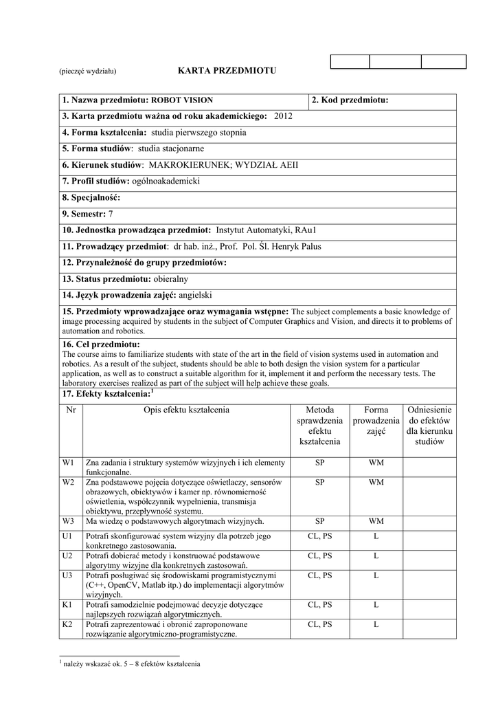 (pieczęć wydziału) KARTA PRZEDMIOTU 1. Nazwa przedmiotu: ROBOT VISION 2. Kod przedmiotu: 3. Karta przedmiotu ważna od roku akademickiego: 2012 4. Forma kształcenia: studia pierwszego stopnia 5. Forma studiów: studia stacjonarne 6. Kierunek studiów: MAKROKIERUNEK; WYDZIAŁ AEII 7. Profil studiów: ogólnoakademicki 8. Specjalność: 9. Semestr: 7 10. Jednostka prowadząca przedmiot: Instytut Automatyki, RAu1 11. Prowadzący przedmiot: dr hab. inż., Prof. Pol. Śl. Henryk Palus 12. Przynależność do grupy przedmiotów: 13. Status przedmiotu: obieralny 14. Język prowadzenia zajęć: angielski 15. Przedmioty wprowadzające oraz wymagania wstępne: The subject complements a basic knowledge of image processing acquired by students in the subject of Computer Graphics and Vision, and directs it to problems of automation and robotics. 16. Cel przedmiotu: The course aims to familiarize students with state of the art in the field of vision systems used in automation and robotics. As a result of the subject, students should be able to both design the vision system for a particular application, as well as to construct a suitable algorithm for it, implement it and perform the necessary tests. The laboratory exercises realized as part of the subject will help achieve these goals. 17. Efekty kształcenia:1 Nr W1 W2 W3 U1 U2 U3 K1 K2 1 Opis efektu kształcenia Metoda sprawdzenia efektu kształcenia Zna zadania i struktury systemów wizyjnych i ich elementy funkcjonalne. Zna podstawowe pojęcia dotyczące oświetlaczy, sensorów obrazowych, obiektywów i kamer np. równomierność oświetlenia, współczynnik wypełnienia, transmisja obiektywu, przepływność systemu. Ma wiedzę o podstawowych algorytmach wizyjnych. SP WM SP WM SP WM Potrafi skonfigurować system wizyjny dla potrzeb jego konkretnego zastosowania. Potrafi dobierać metody i konstruować podstawowe algorytmy wizyjne dla konkretnych zastosowań. Potrafi posługiwać się środowiskami programistycznymi (C++, OpenCV, Matlab itp.) do implementacji algorytmów wizyjnych. Potrafi samodzielnie podejmować decyzje dotyczące najlepszych rozwiązań algorytmicznych. Potrafi zaprezentować i obronić zaproponowane rozwiązanie algorytmiczno-programistyczne. CL, PS L CL, PS L CL, PS L CL, PS L CL, PS L należy wskazać ok. 5 – 8 efektów kształcenia Forma Odniesienie prowadzenia do efektów zajęć dla kierunku studiów 18. Formy zajęć dydaktycznych i ich wymiar (liczba godzin) W. : 15 L. : 30 19. Treści kształcenia: Wykład Basic concept of sensor. Idea of smart sensor. Sensory system in the structure of robot. Robot-human analogy. Comparison of human and robot vision. Lighting systems (traditional lighting and LEDs). Ring illuminators. Structured lighting. Grid projectors and line generators. Examples of advanced lighting systems. Camera obscura. Pin-hole camera. Optical systems (lenses for cameras, filters). Properties of lenses (aperture, magnification, vignetting, depth of field, distortions and aberrations). Choice of lens from nomogram. Spectral characteristics of colour filters. Image sensors (linear and matrix, CCD and CMOS). Layouts of the photosites. CCD architectures. Frome black and white to colour. Colour wheel. Mosaic colour filters (Bayer filter). Microlenses. Fill factor for CMOS sensors. Comparison: CCD vs. CMOS. Foveon three-layer CMOS technology. Monochrome and color cameras. Multicamera systems. High-speed cameras (fps). Smart camera and its software. Webcams. 3CCD cameras. Multispectral cameras. Spectral sensitivites of colour camera. Special cameras (pill camera, HDR camera). Elements of television technology. Framegrabbers. Image processors. Look-up tables (LUT) and their applications for image processing. Camera interfaces (IEEE 1394, USB, CameraLink, Ethernet etc.). Image acquisition: noise and ISO. Dark current image. Interpolation artefacts (demosaicking). Human vision system: light receptors. Spectral characteristics of cones. Opponent colours. Defective colour vision: Ishihara tests. Colour matching system. Metameric pairs. Colour sensors. The colour and colour spaces. Discrete structure of RGB cube. Colorimetric and TV colour spaces. Munsell colour system. Simple colour image processing (swapping and negation). Colour image quantization (splitting and clustering methods). The problem of empty clusters. Calibration of colour vision systems. Segmentation of the image. Thresholding of the image. Region-based segmentation techniques. Features: moments of geometric shape factors, topological characteristics. Object recognition. Recognition of objects using models. Overview of sensory systems, vision applications in automation and robotics. Universal and specialized systems. Examples of real applications of robot vision systems. Zajęcia laboratoryjne 1. Basics of mathematical morphology. 2. Size of objects. 3. Objects and holes in binary image. 4. Shape factors. 5. Introduction to colour image processing. 6. K-means for colour image segmentation. 7. Case studies. 20. Egzamin: nie. 21. Literatura podstawowa: 1. 2. 3. 4. 5. 6. 7. Corke P., Robotics, Vision and Control, Springer, Berlin 2011. Szeliski R., Computer Vision: Algorithms and Applications, Springer, Berlin 2010. Horn B.K.P., Robot Vision, The MIT Press, Cambridge 1986. Niemann H., Pattern Analysis and Understanding, Springer, Berlin 1990. Low A., Introductory Computer Vision and Image Processing, McGraw-Hill, London 1991. Haralick R.M., Shapiro L.G., Computer & Robot Vision, vol.I, Addison-Wesley, Reading 1992. Haralick R.M., Shapiro L.G., Computer & Robot Vision, vol.II, Addison-Wesley, Reading 1992. 22. Literatura uzupełniająca: 1. Morecki A., Knapczyk J., /red./, Podstawy robotyki, WNT, Warszawa 1993. 2. Olszewski M. /red./, Manipulatory i roboty przemysłowe, WNT, Warszawa 1993. 3. Tadeusiewicz R., Flasiński M., Rozpoznawanie obrazów, PWN, Warszawa 1991. 4. Śluzek A., Komputerowa analiza obrazów, Wydawnictwo PW, Warszawa 1991. 5. Tadeusie