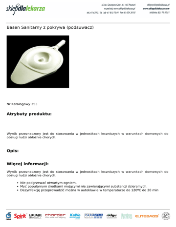 Basen Sanitarny z pokrywa (podsuwacz) Nr Katalogowy 353 Atrybuty produktu: Wyrób przeznaczony jest do stosowania w jednostkach leczniczych w warunkach domowych do obsługi ludzi obłożnie chorych. Opis: Więcej informacji: Wyrób przeznaczony jest do stosowania w jednostkach leczniczych w warunkach domowych do obsługi ludzi obłożnie chorych. Nie podgrzewać otwartym ogniem. Myć popularnym środkami myjącymi nie zawierającymi substancji ścieralnych. Dezynfekcję przeprowadzić można w autoklawie w temperaturze do 120ºC do 30 min Powered by TCPDF (www.tcpdf.org)