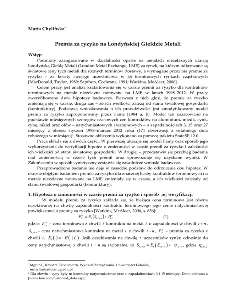 Marta Chylińska* Premia za ryzyko na Londyńskiej Giełdzie Metali Wstęp Podmioty zaangażowane w działalności oparte na metalach nieżelaznych uznają Londyńską Giełdę Metali (London Metal Exchange, LME) za rynek, na którym odkrywane są światowe ceny tych metali dla różnych terminów dostawy, a wymagane przez nią premie za ryzyko – za koszty swojego uczestnictwa w jej terminowych rynkach cząstkowych [MacDonald, Taylor, 1989; Septhon, Cochrane, 1991; Watkins, McAleer, 2006]. Celem pracy jest analiza kształtowania się w czasie premii za ryzyko dla kontraktów terminowych na metale nieżelazne notowane na LME w latach 1998–2012. W pracy zweryfikowano dwie hipotezy badawcze. Pierwsza z nich głosi, że premie za ryzyko zmieniają się w czasie, druga zaś – że ich wielkości zależą od stanu światowej gospodarki (koniunktury). Podstawą wnioskowania o ich prawdziwości jest zmodyfikowany model premii za ryzyko zaproponowany przez Famę [1984 a, b]. Model ten oszacowano na podstawie miesięcznych szeregów czasowych cen kontraktów na aluminium, miedź, cynk, cynę, nikiel oraz ołów – natychmiastowych i terminowych – o zapadalnościach 3, 15 oraz 27 miesięcy z okresu styczeń 1998–marzec 2012 roku (171 obserwacji z ostatniego dnia roboczego w miesiącu)1. Stosowne obliczenia wykonano za pomocą pakietu StataSE 12.0. Praca składa się z dwóch części. W pierwszej ukazuje się model Famy oraz sposób jego wykorzystania do weryfikacji hipotez o zmienności w czasie premii za ryzyko i zależności ich wielkości od stanu światowej gospodarki. W drugiej – przedstawia się przebieg badania nad zmiennością w czasie tych premii oraz sprawozdaje się uzyskane wyniki. W Zakończeniu w sposób syntetyczny zestawia się zasadnicze wnioski badawcze. Przeprowadzone badanie nie daje w zasadzie podstaw do odrzucenia obu hipotez. W okresie objętym badaniem premie za ryzyko dla znacznej liczby kontraktów terminowych na metale nieżelazne notowane na LME zmieniały się w czasie, a ich wielkości zależały od stanu światowej gospodarki (koniunktury). 1. Hipoteza o zmienności w czasie premii za ryzyko i sposób jej weryfikacji W modelu premii za ryzyko zakłada się, że bieżąca cena terminowa jest równa oczekiwanej na chwilę zapadalności kontraktu terminowego jego cenie natychmiastowej powiększonej o premię za ryzyko [Watkins, McAleer, 2006, s. 856]: (1) Fi ,nt Et Si ,t n Pi ,nt gdzie: Fi ,nt – cena terminowa z chwili t kontraktu na metal i o zapadalności w chwili t n , Si ,t n – cena natychmiastowa kontraktu na metal i z chwili t n , Pi ,nt – premia za ryzyko z chwili t , Et E | I t . Jeśli oczekiwania na chwilę t uczestników rynku odnośnie do ceny natychmiastowej z chwili t + n są racjonalne, to Si ,t n Et Si ,t n i ,t n , gdzie i ,t n Mgr inż., Katedra Ekonometrii, Wydział Zarządzania, Uniwersytet Gdański, [email protected] 1 Dla ołowiu i cyny były to kontrakty natychmiastowe oraz o zapadalnościach 3 i 15 miesięcy. Dane pobrano z [www.lme.com/historical_data.asp]. * odzwierciedla popełniane przez nich błędy wyceny na skutek napływu nowych informacji w okresie t,t n . Stąd Si ,t n Pi ,tn Fi ,tn i ,t n lub Si ,t n ai ,t i Fi ,tn i ,t n (2) W wypadku gdy rynek terminowy danego metalu jest efektywny i 1 oraz Et i ,t n 0 , a ai ,t Pi ,tn wyraża premię za ryzyko. Ze względu na niestacjonarność szeregów czasowych ceny natychmiastowej i ceny terminowej w badaniu nad zmiennością w czasie premii za ryzyko wykorzystuje się modyfikację równania (2) zaproponowaną przez Famę [1984 a, b]: Fi ,tn Si ,t n i ,1,t i ,1 Fi ,tn Si ,t i ,t n (3a) Si ,t n Si ,t i ,2,t i ,2 Fi ,tn Si ,t i ,t n (3b) W powyższym modelu Fi ,nt Si ,t n , Si ,t n Si ,t , Fi ,nt Si ,t odzwierciedlają odpowiednio błąd prognozy na n okresów naprzód, n -okresową zmianę ceny natychmiastowej oraz premię forward. Ponadto składniki losowe i ,t n i i ,t n są takie, że Et ( i ,t n ) 0 oraz Et (i ,t n ) 0 . W układzie (3a–b) współczynniki kierunkowe są równe odpowiednio [MacDonald, Taylor, 1989, s. 146]: var(Pi ,nt ) cov Pi ,nt , E S t n | I t St i ,1 (4a) var(Pi ,nt ) varE St n | I t St 2 cov Pi ,nt , E St n | I t St i,2 varE St n | I t St cov Pi ,nt , E St n | I t St var(Pi ,nt ) varE S t n | I t St 2 cov Pi ,nt , E St n | I t St (4b) Stałość w czasie premii za ryzyko implikuje: var(Pi ,nt ) 0 oraz cov Pi ,nt , E St n | I t St 0 . Zachodzi wtedy: i ,1 0 , i , 2 1 , i ,1,t ai ,1 oraz i ,t ,2 ai ,2 , gdzie ai ,1 ai ,2 0 . Z uwagi na to, że i ,1 i , 2 var(Pi ,nt ) varE St n | I t St var Fi ,nt Si ,t (5) różnica i ,1 i , 2 odzwierciedla względną zmienność premii za podjęcie ryzyka do zmienności oczekiwanej zmiany ceny natychmiastowej [por. np. Miłobędzki, 2007]. Tablica 1. Zarys aktualnego stanu badań nad zmiennością w czasie premii za ryzyko na rynkach cząstkowych metali nieżelaznych na LME Autor Wykorzystane Zakres Częstotliwość Wnioski badawcze szeregi czasowe czasowy danych badania [Gilbert, 1986] C0, C3, L0, L3, T0, T3, Z0, Z3 11.1971– miesięczna premia za ryzyko stała w 06.1978 czasie dla L3 i T3 [Sephton , C0, C3, L0, L3, Z,0, Z3, A0, A3, 01.1976– miesięczna premia za ryzyko zmienna Cochrane, 1991] N0, N3 03.1985 w czasie dla Z3, T3 i C3 [Miłobędzki, 2007] C0, C3, C15, C27, A0, A3, A15, 01.1998– miesięczna premia za ryzyko zmienna A27, N0, N3, N15, N27, L0, L3, 03.2007 w czasie dla C3, N3, Z3, L15, T0, T3, T15, Z0, Z3, Z15, A15, M15, L15, A27, C27 Z25 C0, C3, C15, C27 – szeregi czasowe cen kontraktu natychmiastowego i kontraktów terminowych na miedź o zapadalnościach odpowiednio 3, 15 oraz 27 miesięcy; analogicznie: A0, A3, A15, A27 – szeregi czasowe cen kontraktów na aluminium, N0, N3, N15, N27 – nikiel, L0, L3, L15 – ołów, T0, T3, T15 – cynę oraz Z0, Z3, Z15, Z25 – cynk. Źródło: Opracowanie własne. Badania nad zmiennością w czasie premii za ryzyko na rynkach cząstkowych kontraktów term