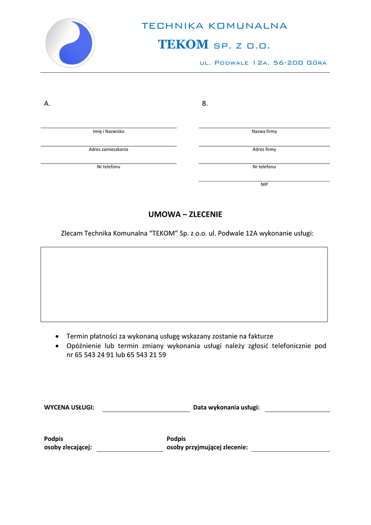 TECHNIKA KOMUNALNA TEKOM SP. Z O.O. ul. Podwale 12a, 56-200 Góra A. B. Imię i Nazwisko Nazwa firmy Adres zamieszkania Adres firmy Nr telefonu Nr telefonu NIP UMOWA – ZLECENIE Zlecam Technika Komunalna “TEKOM” Sp. z o.o. ul. Podwale 12A wykonanie usługi: Termin płatności za wykonaną usługę wskazany zostanie na fakturze Opóźnienie lub termin zmiany wykonania usługi należy zgłosić telefonicznie pod nr 65 543 24 91 lub 65 543 21 59 WYCENA USŁUGI: Podpis osoby zlecającej: Data wykonania usługi: Podpis osoby przyjmującej zlecenie: