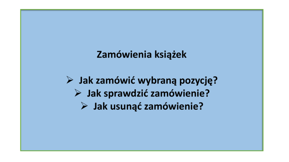 Zamówienia książek Jak zamówić wybraną pozycję? Jak sprawdzić zamówienie? Jak usunąć zamówienie? Jak zamówić wybraną pozycję? Wybieramy Bazę: Płock – Katalog Główny Wpisujemy pozycję, która nas interesuje. Wyszukujemy po tytule, autorze itp. Zapis (1/1) oznacza, że biblioteka posiada jeden egzemplarz i jest on w tej chwili wypożyczony. Informacja (2/0) oznacza, że biblioteka posiada dwa egzemplarze i nie są one w tej chwili wypożyczone. Wyszukana książka znajduje się w Wypożyczalni Głównej i w Czytelni Głównej Zamawiamy wybraną pozycję. Zaloguj się do systemu Wpisz dwa zera (00) i numer karty (numer znajduje się pod kodem kreskowym na karcie), np. 007634 Hasło: dwa zera (00), numer karty i pierwsza litera nazwiska, np. 007634T Przy pierwszym logowaniu zmień hasło. Zaznacz: Baza Płock Zaloguj Jak sprawdzić zamówienie? Sprawdzamy, czy pozycja została zarezerwowana Podglądamy zamówienie Książka została zamówiona i zamówienie zostanie zrealizowane jako pierwsze w kolejności. Termin zwrotu książki przewidziany jest na 17.03.2014. Gdy zamówienie zostanie zrealizowane, zmieni się jego status i pojawi się termin, do kiedy książka czeka na odbiór. Jak usunąć zamówienie? Wchodzimy na stronę: zamówienia. Wybieramy zamówienie, które chcemy usunąć. Usuń. Można usunąć tylko niezrealizowane zamówienie. Zamówienie zostało usunięte.