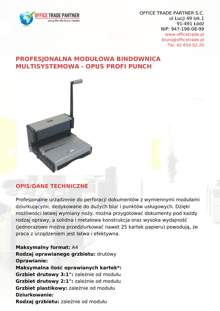 OFFICE TRADE PARTNER S.C. ul Łucji 49 lok.1 91-491 Łódź NIP: 947-198-08-99 www.officetrade.pl [email protected] Tel. 42 654 02 20 PROFESJONALNA MODUŁOWA BINDOWNICA MULTISYSTEMOWA - OPUS PROFI PUNCH OPIS/DANE TECHNICZNE Profesjonalne urządzenie do perforacji dokumentów z wymiennymi modułami dziurkującymi, dedykowane do dużych biur i punktów usługowych. Dzięki możliwości łatwej wymiany noży, można przygotować dokumenty pod każdy rodzaj oprawy, a solidna i metalowa konstrukcja oraz wysoka wydajność (jednorazowo można przedziurkować nawet 25 kartek papieru) powodują, że praca z urządzeniem jest łatwa i efektywna. Maksymalny format: A4 Rodzaj oprawianego grzbietu: drutowy Oprawianie: Maksymalna ilość oprawianych kartek*: Grzbiet drutowy 3:1": zależnie od modułu Grzbiet drutowy 2:1": zależnie od modułu Grzbiet plastikowy: zależnie od modułu Dziurkowanie: Rodzaj grzbietu: zależnie od modułu Maksymalna ilość dziurkowanych kartek*: 25 Ilość wyłączalnych noży: zależnie od modułu Pozostałe parametry: Tryb pracy: ręczny Metalowa obudowa: Tak Ogranicznik formatu: Tak Pomiar grubości grzbietu: Nie Regulacja marginesu: Tak Regulacja głębokości perforacji: Tak Nóż do wycinania "łezek" do kalendarzy: Tak Waga: • waga netto: 15 kg • waga brutto: 16,5 kg Wymiary: • wysokość: 440 mm • szerokość: 370 mm • głębokość: 240 mm *próby wykonano na papierze: 80 g/m² Gwarancja: • gwarancja na urządzenie: 2 lata • serwis 72h: Tak www.officetrade.pl Powered by TCPDF (www.tcpdf.org)