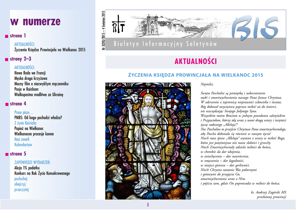 strona 1 AKTUALNOŚCI: Życzenia Księdza Prowincjała na Wielkanoc 2015 Nr 3(20)/2015 – 4 kwietnia 2015 w numerze strony 2–3 AKTUALNOŚCI: Nowa Rada we Francji Męska droga krzyżowa Mocny film o niezwykłym męczenniku Pasja w Rainham Wielkopostna modlitwa za Ukrainę AKTUALNOŚCI ŻYCZENIA KSIĘDZA PROWINCJAŁA NA WIELKANOC 2015 Najmilsi, Święta Paschalne są pamiątką i uobecnieniem męki i zmartwychwstania naszego Pana Jezusa Chrystusa. W zderzeniu z tajemnicą nieprawości człowieka i świata, Bóg dokonał zwycięstwa poprzez miłość aż do śmierci, nie oszczędzając Swojego Jedynego Syna. Wszystkim moim Braciom w jednym powołaniu saletyńskim i Przyjaciołom, którzy idą wraz z nami drogą wiary i świętości życzę radosnego „Alleluja”! Noc Paschalna to przejście Chrystusa Pana zmartwychwstałego, aby Pascha dokonała się również w naszym życiu! Niech nasz śpiew „Alleluja” wyrasta z wiary w miłość Boga, która jest potężniejsza niż nasze słabości i grzechy. Niech Zmartwychwstały udziela miłości do końca, w chorobie da dar ukojenia, w zniechęceniu – dar nawrócenia, w zmęczeniu – dar łagodności, w miejsce gniewu – dar gorliwości. Niech Chrystus zastanie Was pokornymi i gotowymi do przyjęcia Go, zmartwychwstania wraz z Nim i pójścia tam, gdzie On poprowadzi w miłości do końca. strona 4 Prasa pisze… PMBS: Od kogo pochodzi władza? Z życia Kościoła: Papież na Wielkanoc Wielkanocne procesje konne Nasi zmarli Kalendarium strona 5 ZAPOWIEDZI WYDARZEŃ: Akcja 1% podatku Konkurs na Rok Życia Konsekrowanego posłuchaj obejrzyj przeczytaj ks. Andrzej Zagórski MS przełożony prowincji 1 AKTUALNOŚCI NOWA RADA WE FRANCJI Obradująca w dniach 16–20 marca br. w Annecy le Vieux Kapituła prowincji francuskiej dokonała wyboru nowego przełożonego prowincji i jego rady. Nowym prowincjałem został ks. Louis de Pontbriand MS (64 l), zaś wikariuszem prowincjalnym pochodzący z Madagaskaru ks. Jeannot Rakotonindraniny MS (53 l.). Dotychczasowego wikariusza prowincjalnego ks. Bernarda Gaidioza MS (69 l.), wybrano asystentem prowincjalnym. ks. B. Gaidioz MS, ks. L. de Pontbriand MS, ks. J. Rakotonindraniny MS Prowincja francuska powstała w 1934 r. i jest jedną z najstarszych w zgromadzeniu. Liczy obecnie 46 członków, z czego 13 pochodzi z innych prowincji, głównie z Madagaskaru. Rozważania kolejnych stacji zostały przygotowane na podstawie krakowskiej Ekstremalnej Drogi Krzyżowej z 2011 r. W trakcie drogi uczestnicy słuchali także Ewangelii wg św. Jana od rozdziału 7 do 18, aby lepiej zrozumieć, w jaki sposób Jezus podążał do wydarzeń swojej Paschy. Również podczas trasy konferencję o modlitwie wygłosił ks. Sławomir Wietrzyński. Na ostatnim odcinku wielu mężczyzn przystąpiło do spowiedzi, do której przygotował ks. Piotr Korbecki. W Kobylance pielgrzymów przyjął ks. Krzysztof Kowal MS, który przewodniczył Mszy św. sprawowanej w intencji uczestników i ich rodzin. Celebrans wygłosił także homilię podkreślającą rolę mężczyzny w historii zbawienia. MĘSKA DROGA KRZYŻOWA Duszpasterze z Dębowca i Kobylanki 21 marca br. zaprosili mężczyzn do wspólnego rozważania męki Pańskiej na trasie łączącej oba sanktuaria. W tym nietypowym wielkopostnym nabożeństwie wzięło udział ponad 80 uczestników, między innymi saletyńscy postulanci, nowicjusze i klerycy oraz księża Piotr Korbecki MS, Grzegorz Ozga MS, Andrzej Wierzba MS i Sławomir Wietrzyński MS. Trasa drogi krzyżowej liczyła 25 kilometrów i prowadziła przez m.in. przez Osobnicę, Harklową i Lipinki. 2 Droga krzyżowa mężczyzn połączyła dwa sanktuaria, w których posługują saletyni: Matki Bożej Saletyńskiej w Dębowcu i Pana Jezusa Ukrzyżowanego w Kobylance. Było to swoiste nawiązanie do jednej z pielgrzymek do La Salette, którą przed wielu laty odprawili mężczyźni z Corps. Na górę Planeau wnieśli wtedy duży krzyż, który dzisiaj stoi w prezbiterium bazyliki w La Salette. Chociaż w La Salette dwojgu dzieciom objawiła się Maryja, to w centrum tego objawienia znajduje się krzyż Chrystusa. Maksymin Giraud i Melania Calvat podczas rozmowy z Matką Bożą widziały jasność, która wydobywała się z krucyfiksu, zawieszonego na piersi Maryi. Widziały także, że Chrystus na krzyżu był ciągle żywy. MOCNY FILM O NIEZŁOMNYM MĘCZENNIKU Był 49 jezuitą zamordowanym w XVII w. na wschodnich ziemiach Rzeczpospolitej. Jego objawienie w 1702 roku stało się początkiem wielkiego kultu, którym jest otaczany do dziś. Nakładem Wydawnictwa La Salette powstał film „Niezłomny Patron Polski”, który ukazuje życie św. Andrzeja Boboli oraz jego obecność w dziejach naszej Ojczyzny. Film w reżyserii Edyty Szostek i Agnieszki Pers nie jest typową hagiografią. Autorzy chcieli przede wszystkim pokazać, jak mocno postać Świętego spleciona jest z trudną historią Polski. Choć Andrzej Bobola jest patronem naszej Ojczyzny, dla wielu jest postacią nieznaną. Jednak ci, którzy poznają jego męczeństwo oraz wydarzenia, które działy się po jego śmierci traktują go jako niezwykle bliskiego, wręcz osobistego świętego. Narratorem w filmie jest Krzysztof Ziemiec, dla którego postać św. Andrzeja Boboli jest szczególnie ważna. W filmie można zobaczyć wstrząsające fabularyzowane sceny męczeństwa Andrzeja Boboli, a także współczesne świadectwa osób, które doświadczyły łask za jego wstawiennictwem. Nr 3(20)/2015 – 4 kwietnia 2015 AKTUALNOŚCI Patrona Polski. Album i film uzupełniają się wzajemnie i stanowią znakomitą całość. Film „Niezłomny Patron Polski. Święty Andrzej Bobola” i album pod tym samym tytułem można nabyć w siedzibie Wydawnictwa La Salette w Krakowie, w pawilonach w Dębowcu i Trzciance oraz w wielu księgarniach w całej Polsce. Wydawnictwo posiada również sklep internetowy pod adresem www.wydawnictwo.saletyni.pl. WIELKOPOSTNA MODLITWA ZA 