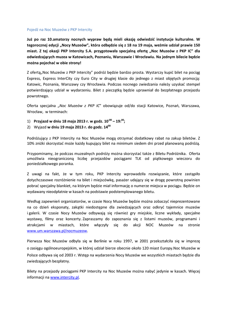 Pojedź na Noc Muzeów z PKP Intercity Już po raz 10.amatorzy nocnych wypraw będą mieli okazję odwiedzić instytucje kulturalne. W tegorocznej edycji „Nocy Muzeów”, która odbędzie się z 18 na 19 maja, weźmie udział prawie 150 miast. Z tej okazji PKP Intercity S.A. przygotowała specjalną ofertę „Noc Muzeów z PKP IC” dla odwiedzających muzea w Katowicach, Poznaniu, Warszawie i Wrocławiu. Na jednym bilecie będzie można pojechać w obie strony! Z ofertą„Noc Muzeów z PKP Intercity” podróż będzie bardzo prosta. Wystarczy kupić bilet na pociąg Express, Express InterCity czy Euro City w drugiej klasie do jednego z miast objętych promocją: Katowic, Poznania, Warszawy czy Wrocławia. Podczas nocnego zwiedzania należy uzyskać stempel potwierdzający udział w wydarzeniu. Bilet z pieczątką będzie uprawniał do bezpłatnego przejazdu powrotnego. Oferta specjalna „Noc Muzeów z PKP IC” obowiązuje od/do stacji Katowice, Poznań, Warszawa, Wrocław, w terminach: 1) Przyjazd w dniu 18 maja 2013 r. w godz. 10:00 – 19:00; 2) Wyjazd w dniu 19 maja 2013 r. do godz. 1400 Podróżujący z PKP Intercity na Noc Muzeów mogą otrzymać dodatkowy rabat na zakup biletów. Z 10% zniżki skorzystać może każdy kupujący bilet na minimum siedem dni przed planowaną podróżą. Przypominamy, że podczas muzealnych podróży można skorzystać także z Biletu Podróżnika. Oferta umożliwia nieograniczoną liczbę przejazdów pociągami TLK od piątkowego wieczoru do poniedziałkowego poranka. Z uwagi na fakt, że w tym roku, PKP Intercity wprowadziła rozwiązanie, które zastąpiło dotychczasowe rozróżnienie na bilet i miejscówkę, pasażer udający się w drogę powrotną powinien pobrać specjalny blankiet, na którym będzie miał informację o numerze miejsca w pociągu. Będzie on wydawany nieodpłatnie w kasach na podstawie podstemplowanego biletu. Według zapewnień organizatorów, w czasie Nocy Muzeów będzie można zobaczyć nieprezentowane na co dzień eksponaty, zakątki niedostępne dla zwiedzających oraz odkryć tajemnice muzeów i galerii. W czasie Nocy Muzeów odbywają się również gry miejskie, liczne wykłady, specjalne wystawy, filmy oraz koncerty. Zapraszamy do zapoznania się z listami muzeów, programami i atrakcjami w miastach, które włączyły się do akcji NOC Muzeów na stronie www.um.warszawa.pl/nocmuzeow. Pierwsza Noc Muzeów odbyła się w Berlinie w roku 1997, w 2001 przekształciła się w imprezę o zasięgu ogólnoeuropejskim, w której udział bierze obecnie około 120 miast Europy. Noc Muzeów w Polsce odbywa się od 2003 r. Wstęp na wydarzenia Nocy Muzeów we wszystkich miastach będzie dla zwiedzających bezpłatny. Bilety na przejazdy pociągami PKP Intercity na Noc Muzeów można nabyć jedynie w kasach. Więcej informacji na www.intercity.pl.