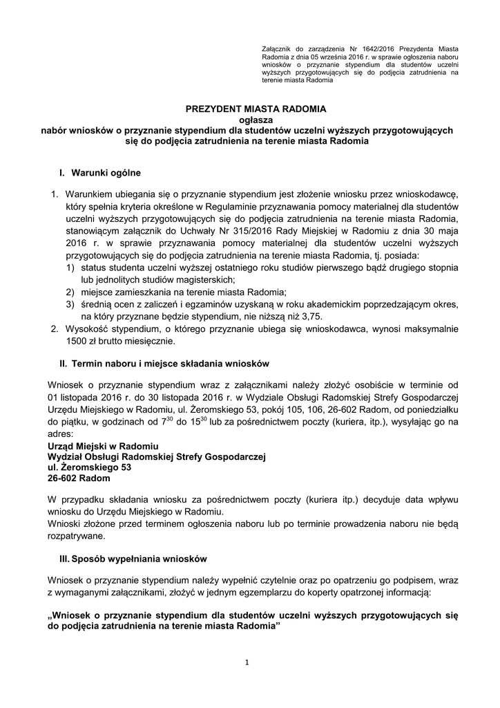 Załącznik do zarządzenia Nr 1642/2016 Prezydenta Miasta Radomia z dnia 05 września 2016 r. w sprawie ogłoszenia naboru wniosków o przyznanie stypendium dla studentów uczelni wyższych przygotowujących się do podjęcia zatrudnienia na terenie miasta Radomia PREZYDENT MIASTA RADOMIA ogłasza nabór wniosków o przyznanie stypendium dla studentów uczelni wyższych przygotowujących się do podjęcia zatrudnienia na terenie miasta Radomia I. Warunki ogólne 1. Warunkiem ubiegania się o przyznanie stypendium jest złożenie wniosku przez wnioskodawcę, który spełnia kryteria określone w Regulaminie przyznawania pomocy materialnej dla studentów uczelni wyższych przygotowujących się do podjęcia zatrudnienia na terenie miasta Radomia, stanowiącym załącznik do Uchwały Nr 315/2016 Rady Miejskiej w Radomiu z dnia 30 maja 2016 r. w sprawie przyznawania pomocy materialnej dla studentów uczelni wyższych przygotowujących się do podjęcia zatrudnienia na terenie miasta Radomia, tj. posiada: 1) status studenta uczelni wyższej ostatniego roku studiów pierwszego bądź drugiego stopnia lub jednolitych studiów magisterskich; 2) miejsce zamieszkania na terenie miasta Radomia; 3) średnią ocen z zaliczeń i egzaminów uzyskaną w roku akademickim poprzedzającym okres, na który przyznane będzie stypendium, nie niższą niż 3,75. 2. Wysokość stypendium, o którego przyznanie ubiega się wnioskodawca, wynosi maksymalnie 1500 zł brutto miesięcznie. II. Termin naboru i miejsce składania wniosków Wniosek o przyznanie stypendium wraz z załącznikami należy złożyć osobiście w terminie od 01 listopada 2016 r. do 30 listopada 2016 r. w Wydziale Obsługi Radomskiej Strefy Gospodarczej Urzędu Miejskiego w Radomiu, ul. Żeromskiego 53, pokój 105, 106, 26-602 Radom, od poniedziałku do piątku, w godzinach od 730 do 1530 lub za pośrednictwem poczty (kuriera, itp.), wysyłając go na adres: Urząd Miejski w Radomiu Wydział Obsługi Radomskiej Strefy Gospodarczej ul. Żeromskiego 53 26-602 Radom W przypadku składania wniosku za pośrednictwem poczty (kuriera itp.) decyduje data wpływu wniosku do Urzędu Miejskiego w Radomiu. Wnioski złożone przed terminem ogłoszenia naboru lub po terminie prowadzenia naboru nie będą rozpatrywane. III. Sposób wypełniania wniosków Wniosek o przyznanie stypendium należy wypełnić czytelnie oraz po opatrzeniu go podpisem, wraz z wymaganymi załącznikami, złożyć w jednym egzemplarzu do koperty opatrzonej informacją: „Wniosek o przyznanie stypendium dla studentów uczelni wyższych przygotowujących się do podjęcia zatrudnienia na terenie miasta Radomia” 1 Do wniosku należy dołączyć: 1) zaświadczenie z uczelni potwierdzające posiadanie statusu studenta, zawierające informacje o roku studiów, trybie i kierunku, średniej ocen w roku poprzedzającym rok ubiegania się o stypendium; 2) CV wnioskodawcy; 3) oświadczenie potwierdzające miejsce zamieszkania na terenie miasta Radomia; 4) kopie dokumentów potwierdzających osiągnięcia wnioskodawcy (potwierdzone za zgodność z oryginałem); 5) kopię dowodu osobistego (potwierdzoną za zgodność z oryginałem). IV. Informacje dodatkowe Szczegółowe informacje o zasadach przyznawania pomocy materialnej dla studentów uczelni wyższych przygotowujących się do podjęcia zatrudnienia na terenie miasta Radomia dostępne są na stronie www.investinradom.pl w zakładce Ogłoszenia. Dodatkowe informacje można uzyskać w Wydziale Obsługi Radomskiej Strefy Gospodarczej Urzędu Miejskiego w Radomiu, ul. Żeromskiego 53, pokój 105, 106, tel.: (48) 36-20-614, (48) 36-20-332, e-mail: [email protected] . V. Załączniki 1. Wniosek o stypendium (wzór). 2. Oświadczenie o miejscu zamieszkania( wzór). 2
