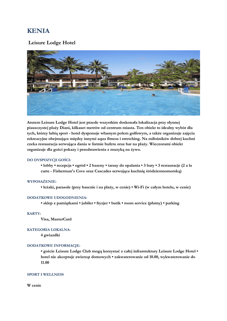 KENIA Leisure Lodge Hotel Atutem Leisure Lodge Hotel jest przede wszystkim doskonała lokalizacja przy słynnej piaszczystej plaży Diani, kilkaset metrów od centrum miasta. Ten obiekt to idealny wybór dla tych, którzy lubią sport - hotel dysponuje własnym polem golfowym, a także organizuje zajęcia rekreacyjne obejmujące między innymi aqua fitness i stretching. Na miłośników dobrej kuchni czeka restauracja serwująca dania w formie bufetu oraz bar na plaży. Wieczorami obiekt organizuje dla gości pokazy i przedstawienia z muzyką na żywo. DO DYSPOZYCJI GOŚCI: • lobby • recepcja • ogród • 2 baseny • tarasy do opalania • 3 bary • 3 restauracje (2 a la carte - Fisherman's Cove oraz Cascades serwująca kuchnię śródziemnomorską) WYPOSAŻENIE: • leżaki, parasole (przy basenie i na plaży, w cenie) • Wi-Fi (w całym hotelu, w cenie) DODATKOWE UDOGODNIENIA: • sklep z pamiątkami • jubiler • fryzjer • butik • room service (płatny) • parking KARTY: Visa, MasterCard KATEGORIA LOKALNA: 4 gwiazdki DODATKOWE INFORMACJE: • goście Leisure Lodge Club mogą korzystać z całej infrastruktury Leisure Lodge Hotel • hotel nie akceptuje zwierząt domowych • zakwaterowanie od 10.00, wykwaterowanie do 11.00 SPORT I WELLNESS W cenie • animacja sportowa • aerobik • aqua fitness • stretching Płatne • kolarstwo • sporty wodne (kitesurfing, nurkowanie, windsurfing) • zabiegi spa • masaże • zabiegi kosmetyczne • hotelowe, 18-dołkowe pole golfowe z polem treningowym OFERTA Uczestnicy: 2 osoby Data wyjazdu: 25 sierpnia 2016 Długość pobytu: 7 dni Lotnisko wylotowe: Warszawa Zakwaterowanie: pokój 2-osobowy Wyżywienie: Cena: śniadanie i obiadokolacja 10500 zł